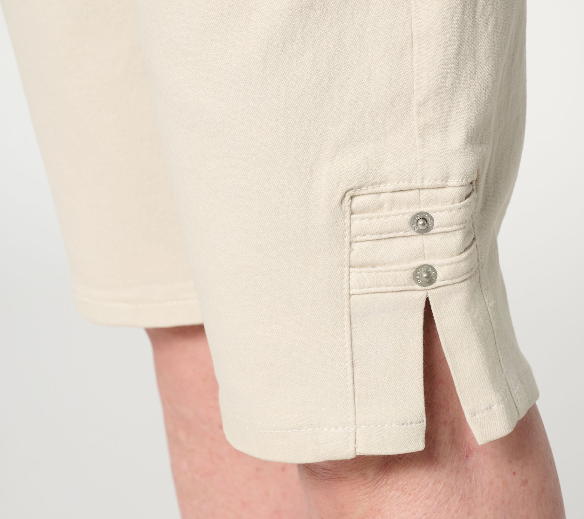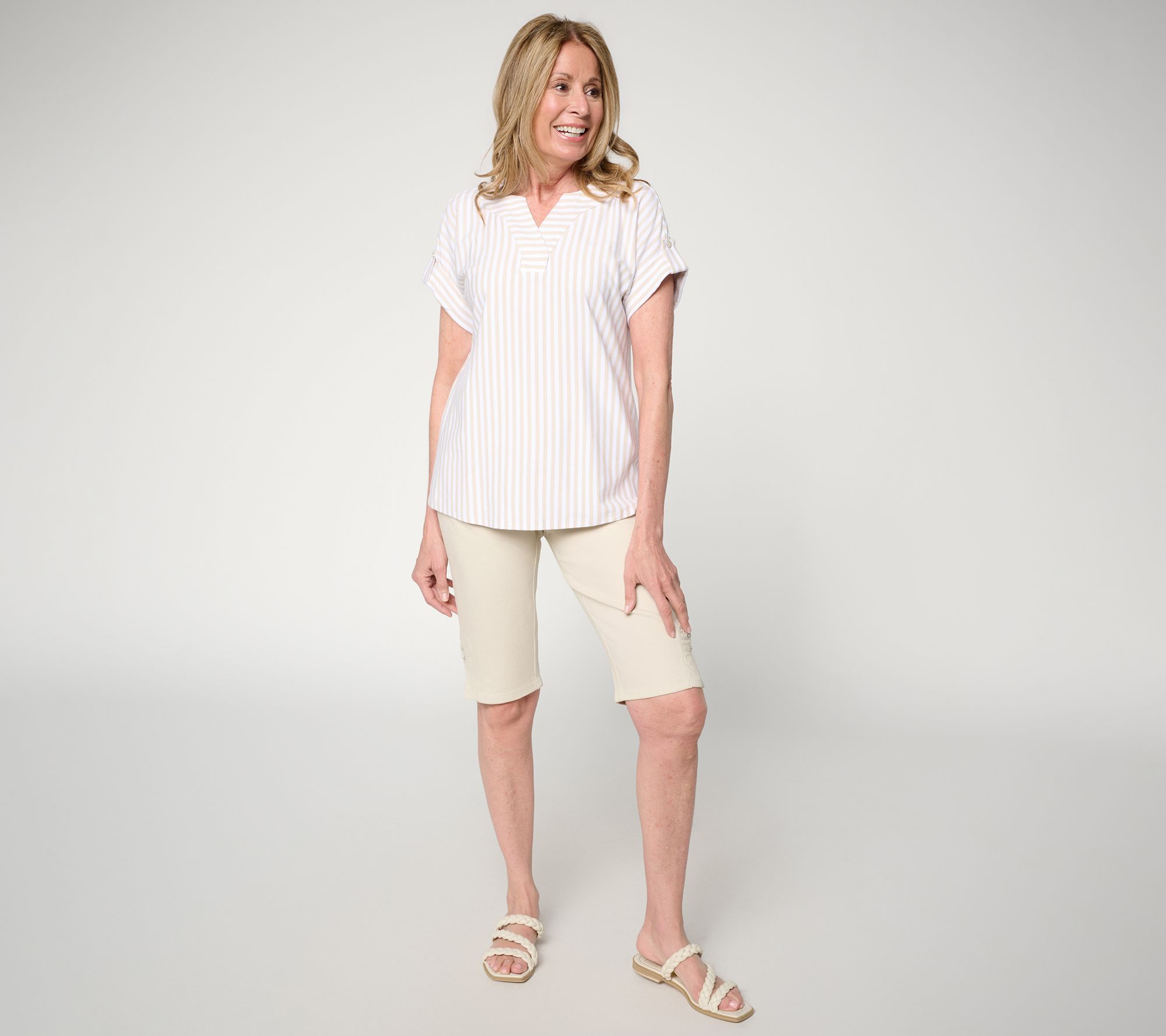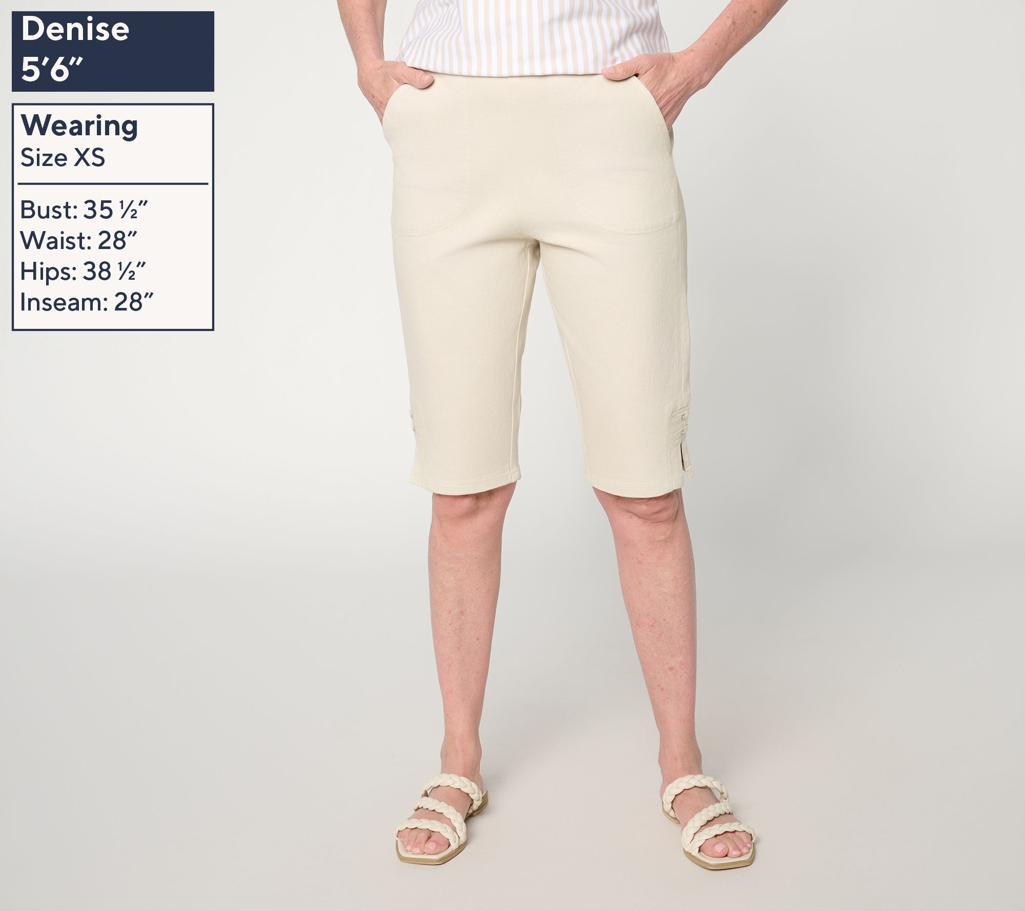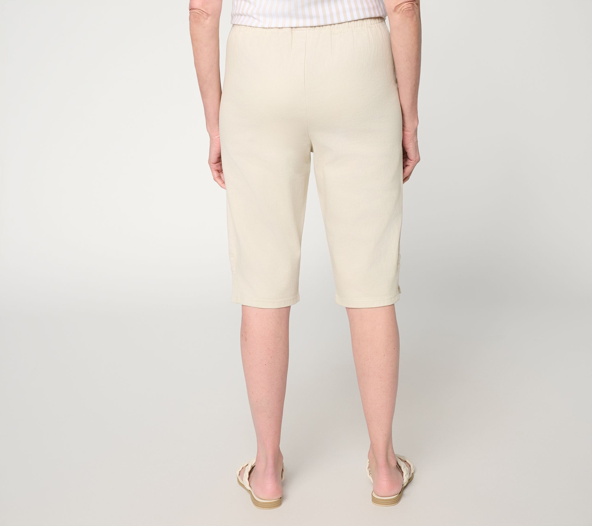Off duty? Head downtown for a morning latte or take a sunset stroll in these pull-on Bermuda shorts, designed with a comfortable elastic waistband and a hint of stretch for easy movement. Stylish side slits and rivet accents bring a fun update to a classic silhouette, with slash pockets to keep essentials close. From Denim & Co.® Fashions.