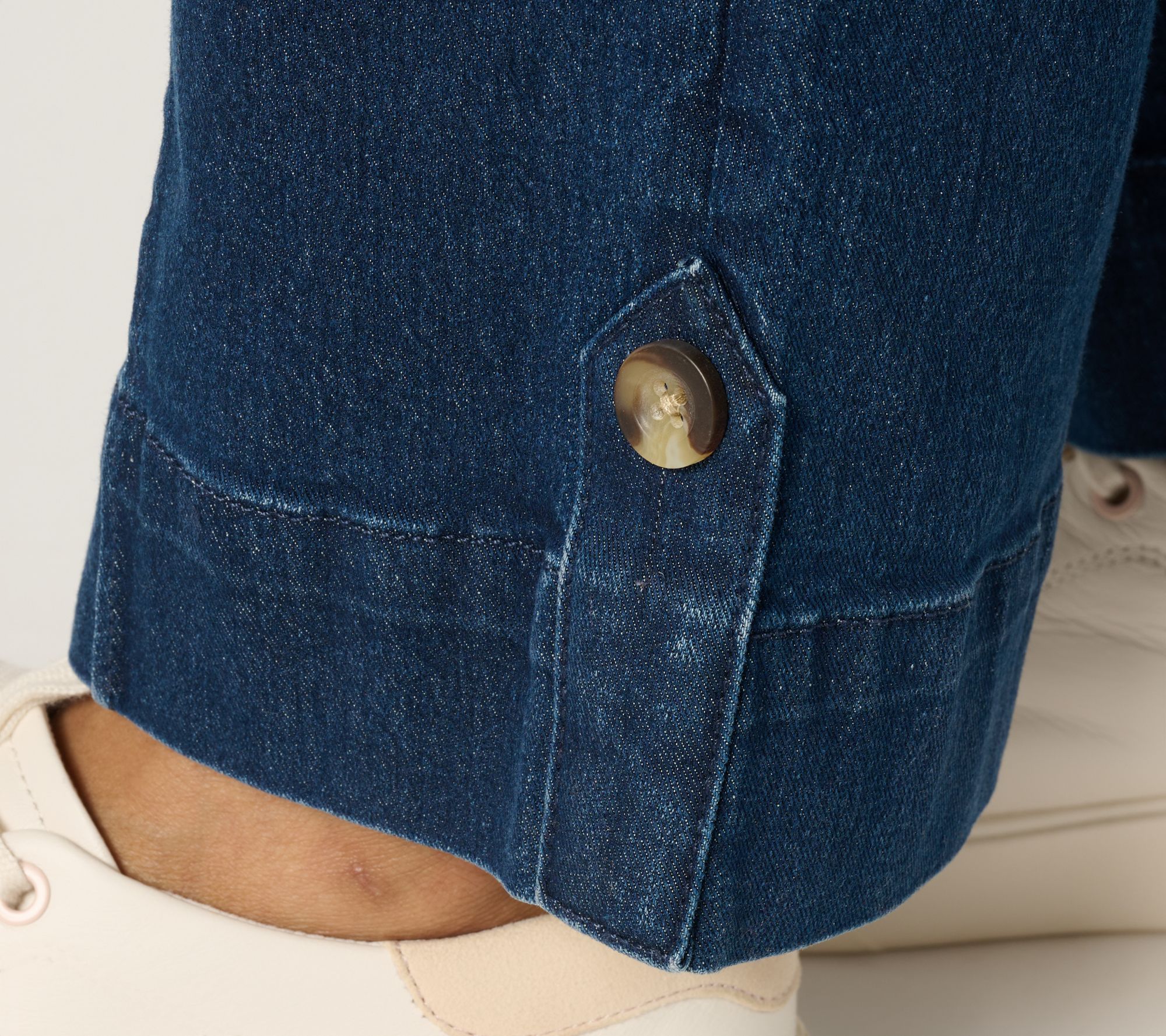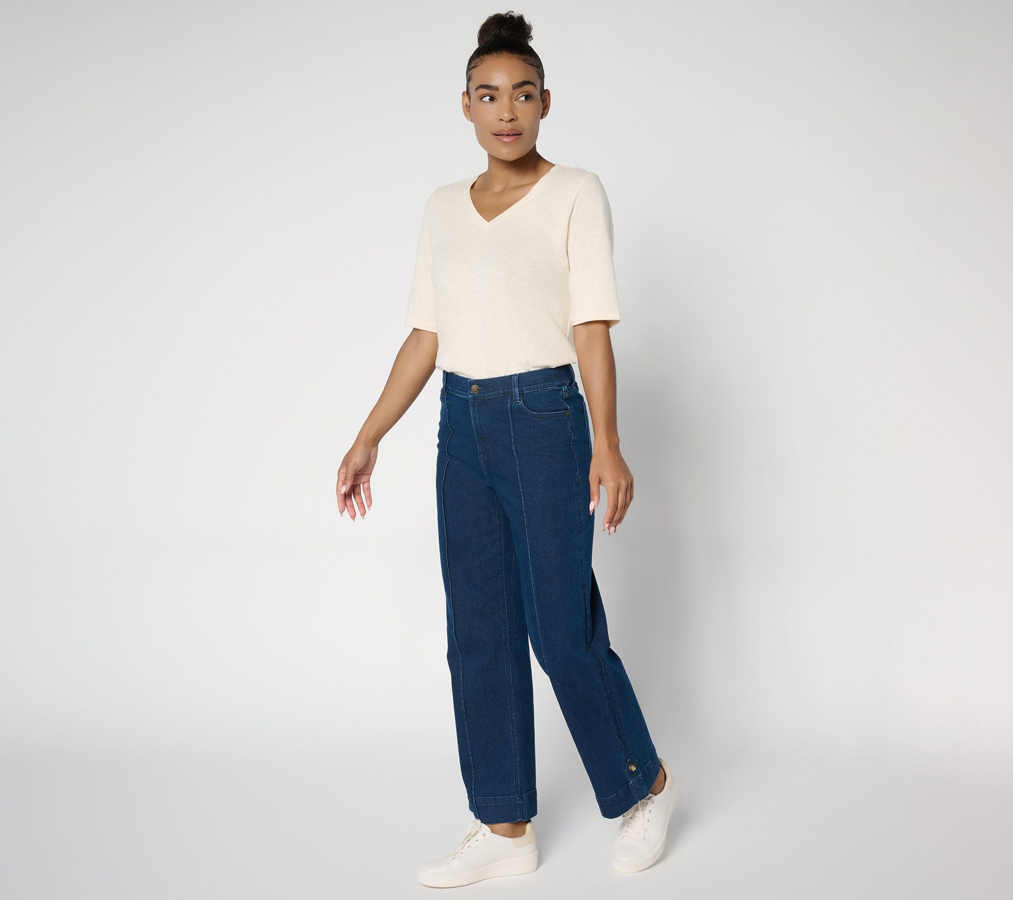 A new season takes shape! With tailored pintucking, button-tab hems (that you never have to mess with), and a stretchy back waist, these full-length trouser jeans have you feeling yourself this fall... and winter and next spring, too. Style with your favorite blouse and loafers, a soft tee and retro sneaks, or a cabled sweater and ankle boots -- and reassert your style smarts just like that! From Denim & Co.® Fashions.