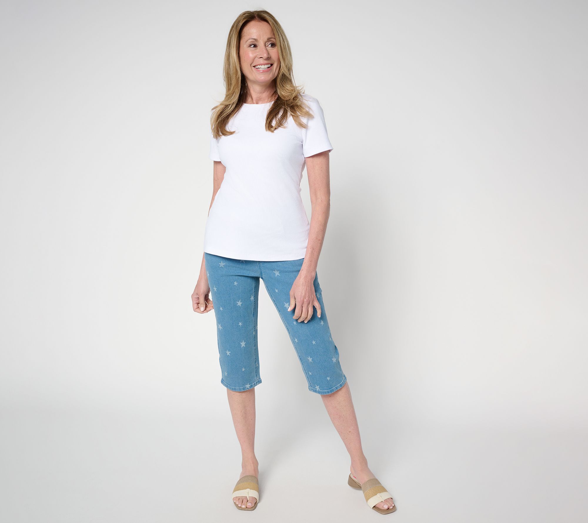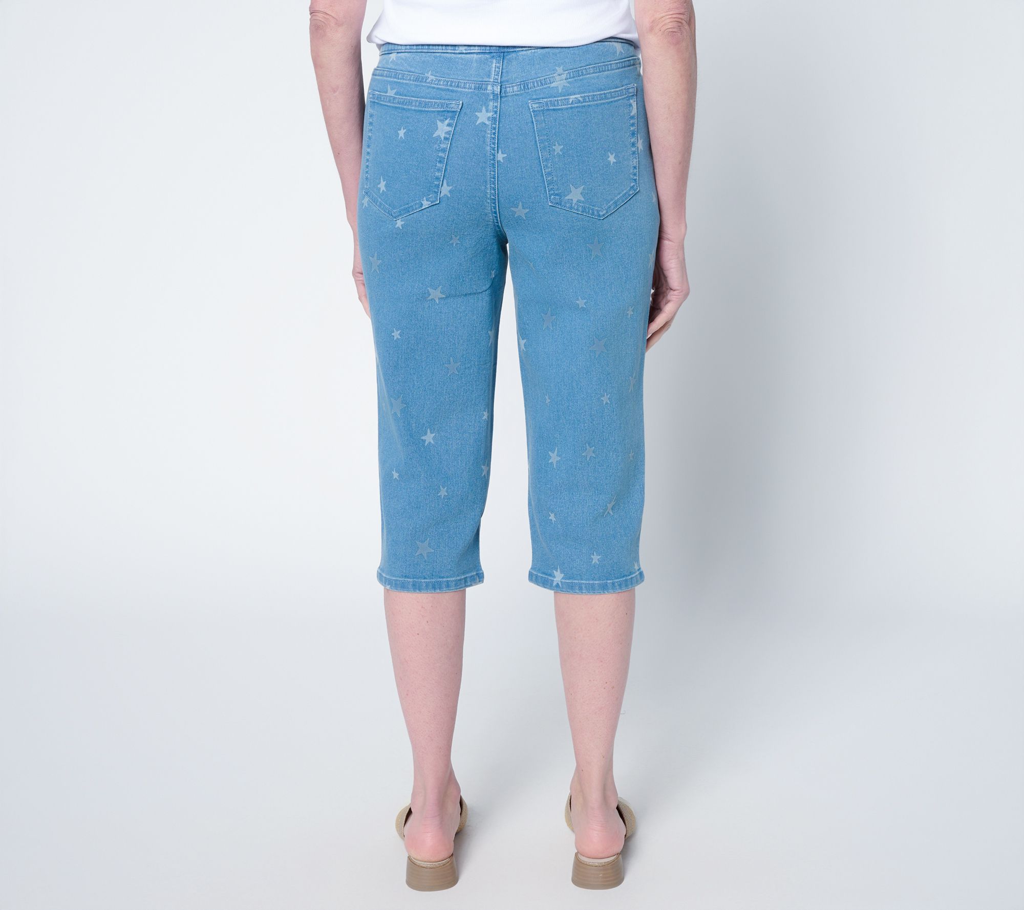 You're the star of the show, no matter where you go in these stretchy skimmers from Denim & Co. Sidestep the overexposure of shorts and beat the heat in pull-ons that feature a playful muted star print -- ideal for summery celebrations from Memorial Day to Labor Day. But don't save them just for star-spangled holidays -- the Americana-inspired print keeps your look fresh and fun all season long. From Denim & Co.® Fashions.