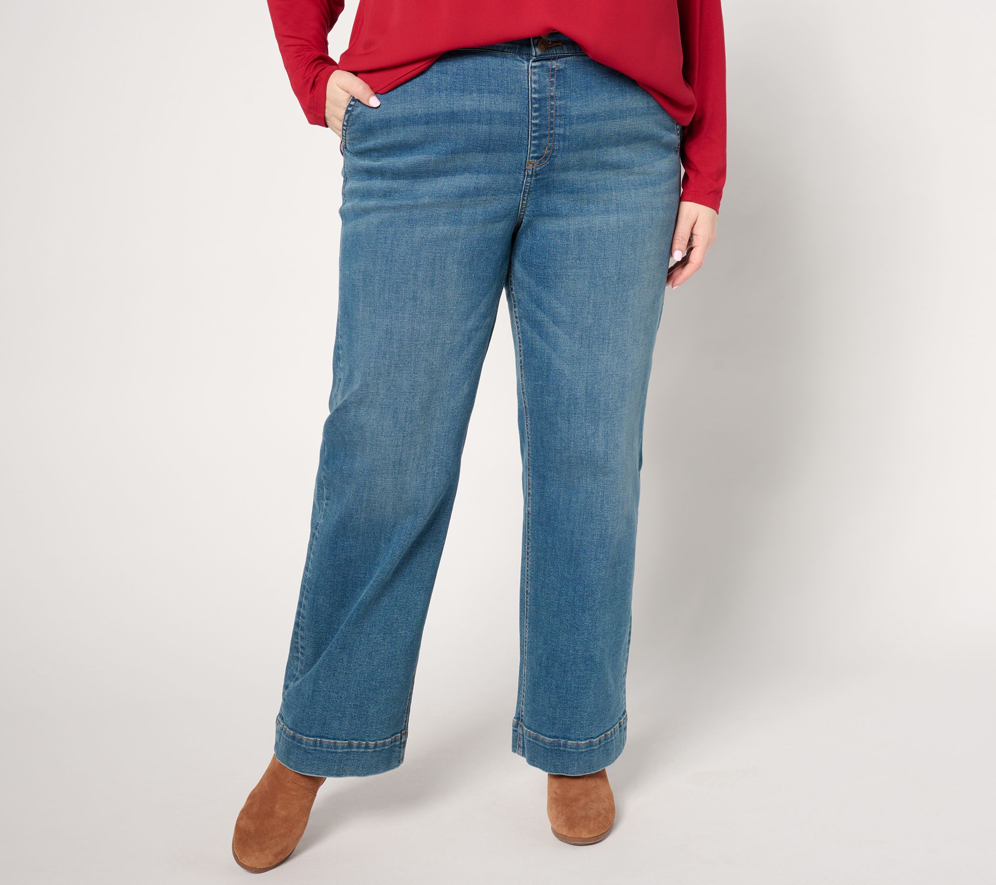 Updating your denim? Take the easy path to a trendy trouser style with these full-length jeans in Easy Stretch woven. A twin-button waistband and wide leg silhouette create a WOW moment with the season's cutest boots and blouses. From Denim & Co.® Fashions.