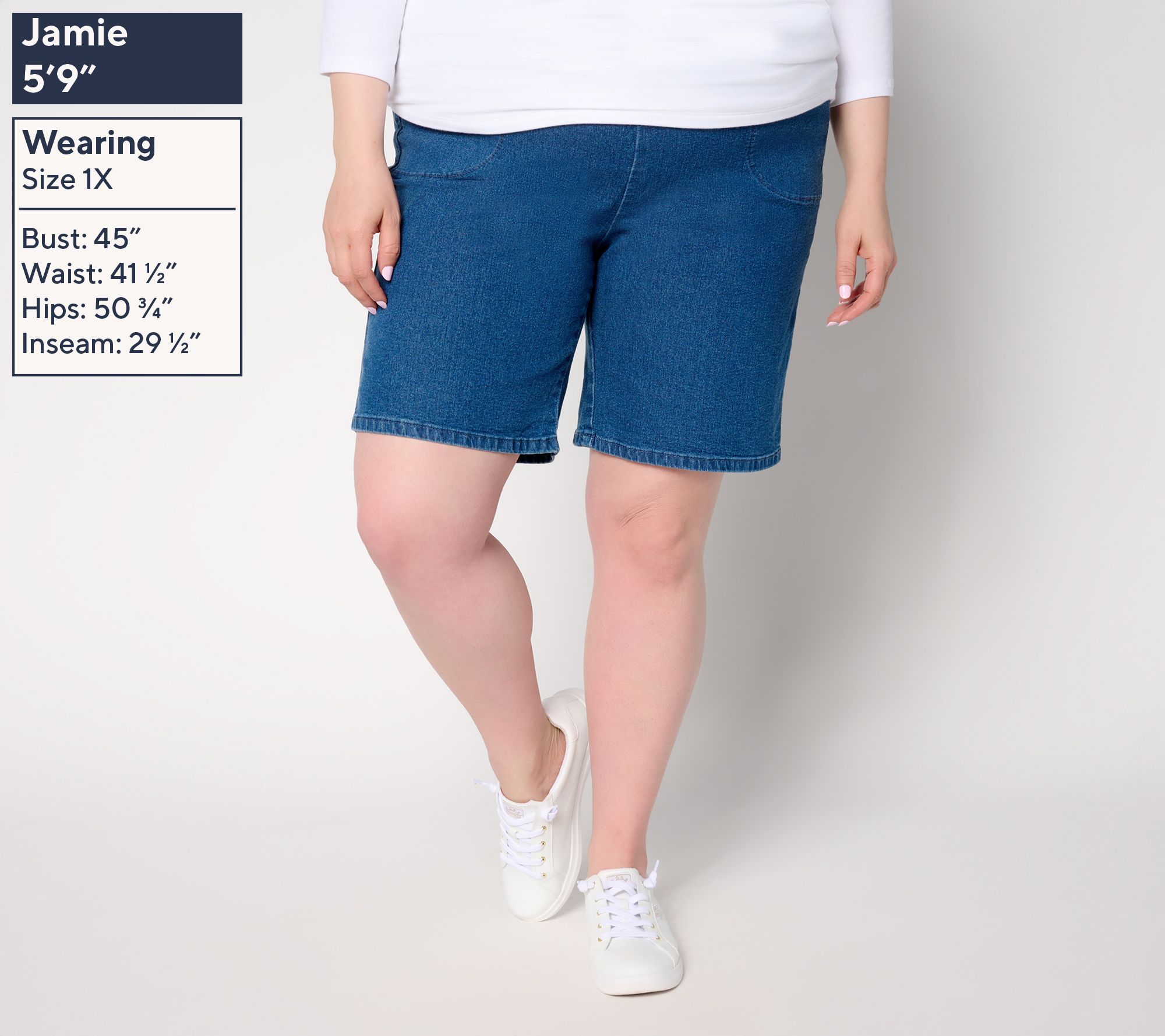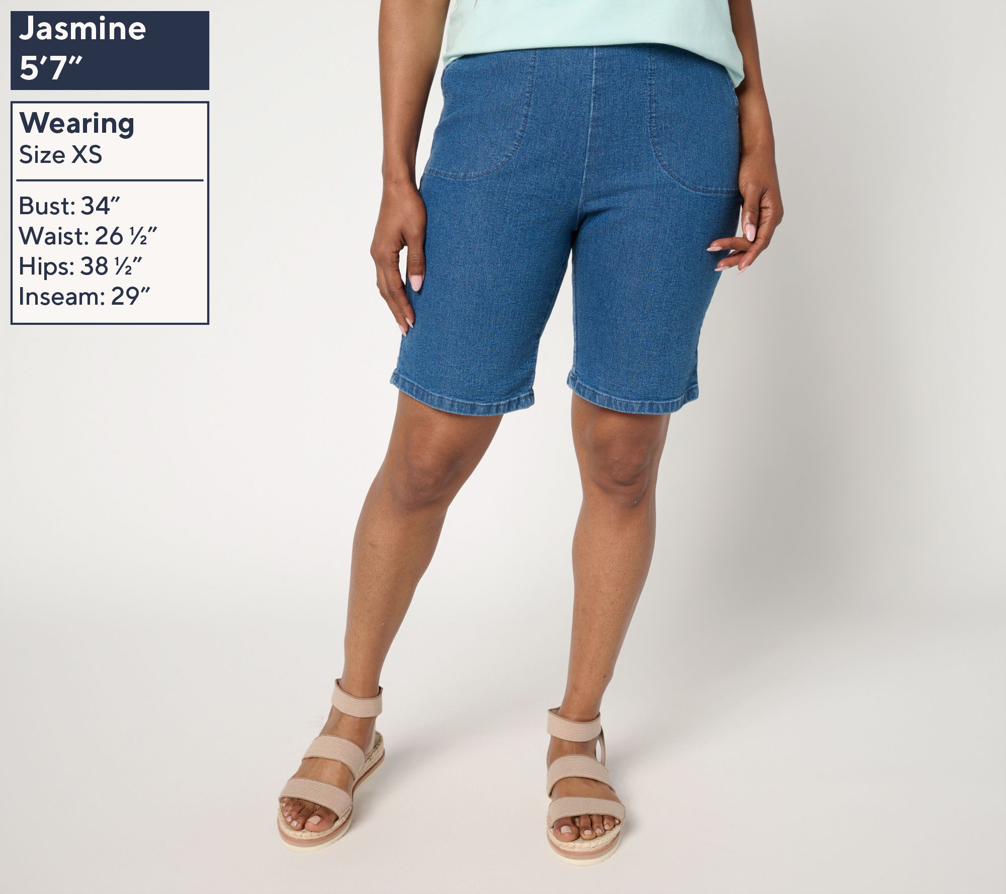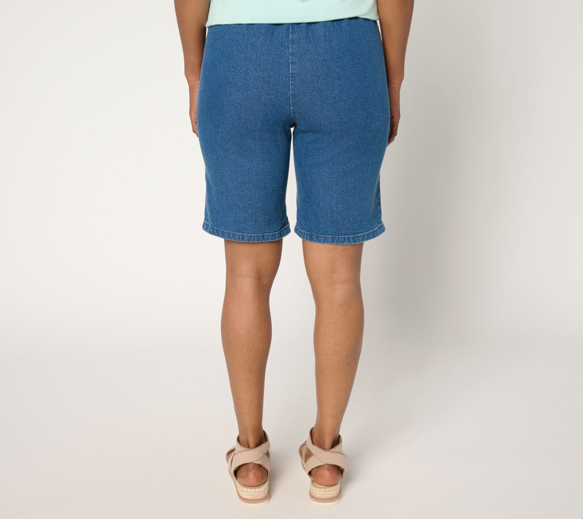 Fabrication: Woven. Features: Customer favorite "Side Pocket Pant" done in a denim short length. Flat elastic front waistband, gathered back elastic waistband. Front Slash pockets. Pull on styling. Fit: Semi-fitted, follows the lines of the body w/ added wearing ease. Inseam: 8". Rise: At Waist. Leg Shape: Straight. Length: Shorts. Content: 81% cotton, 17% polyester, 2% elastane. Care: MWW/WWLC/ONCBWN/TDM/LIIN/DNDC. COO: Import. Season: (S). Everyday Q Value._________________________