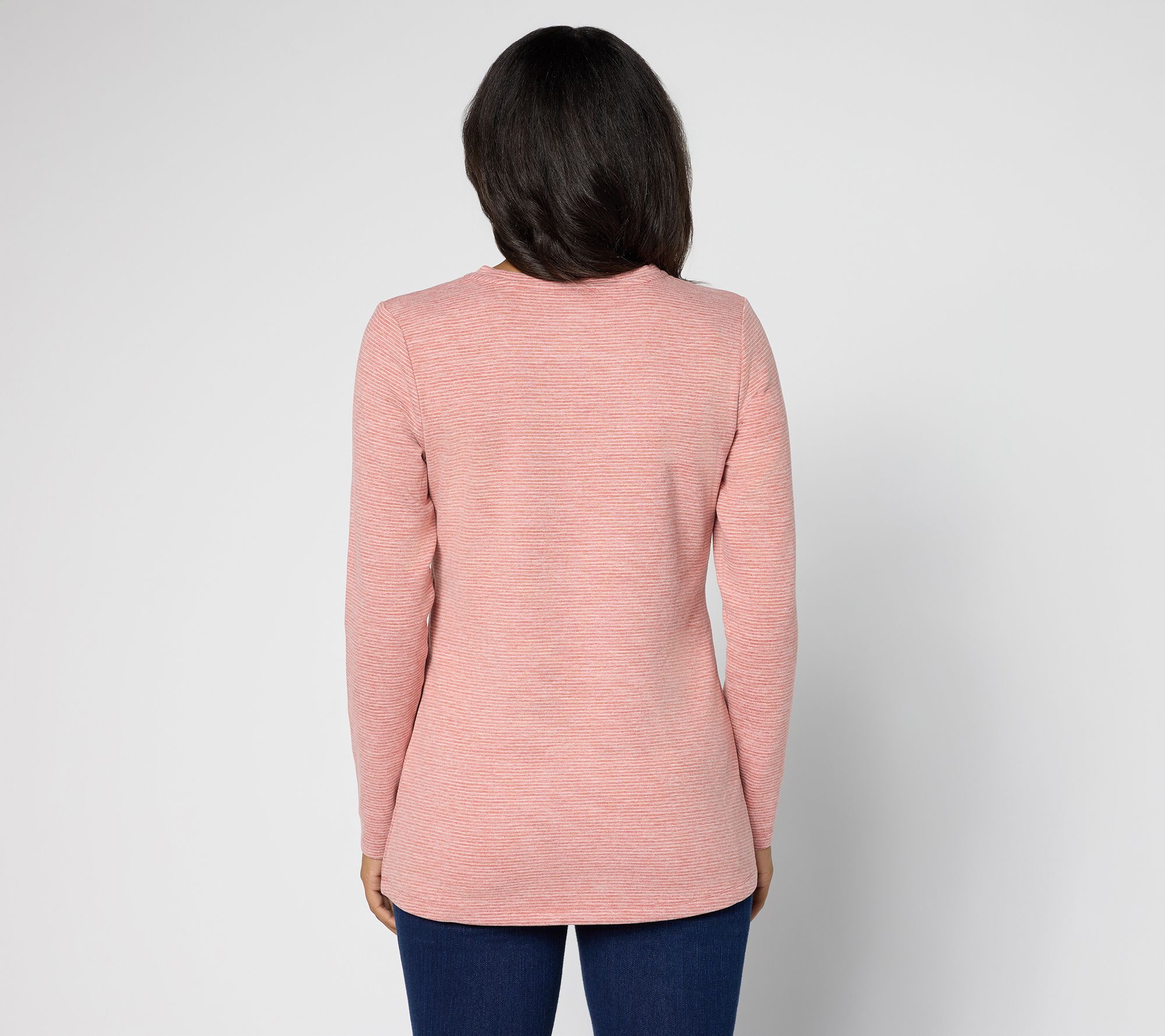 Features: V-neckline, long sleeves, curved bottom hem, subtle stripe pattern