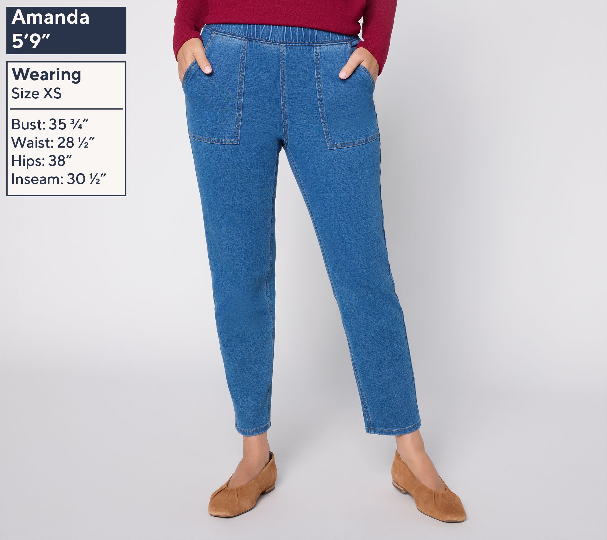 • Features: pull-on style, elastic waistband, front patch pockets, back pockets, ankle length