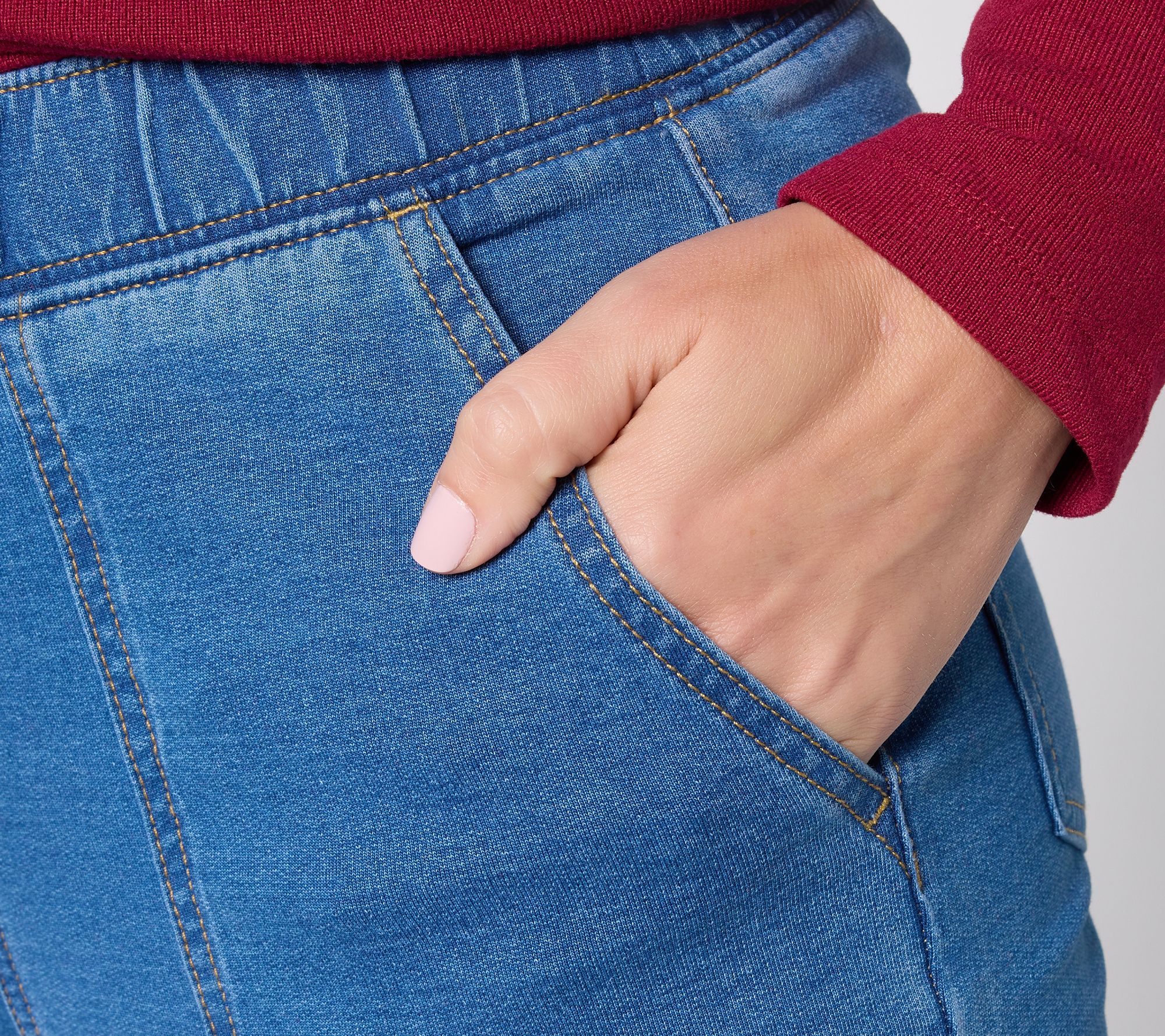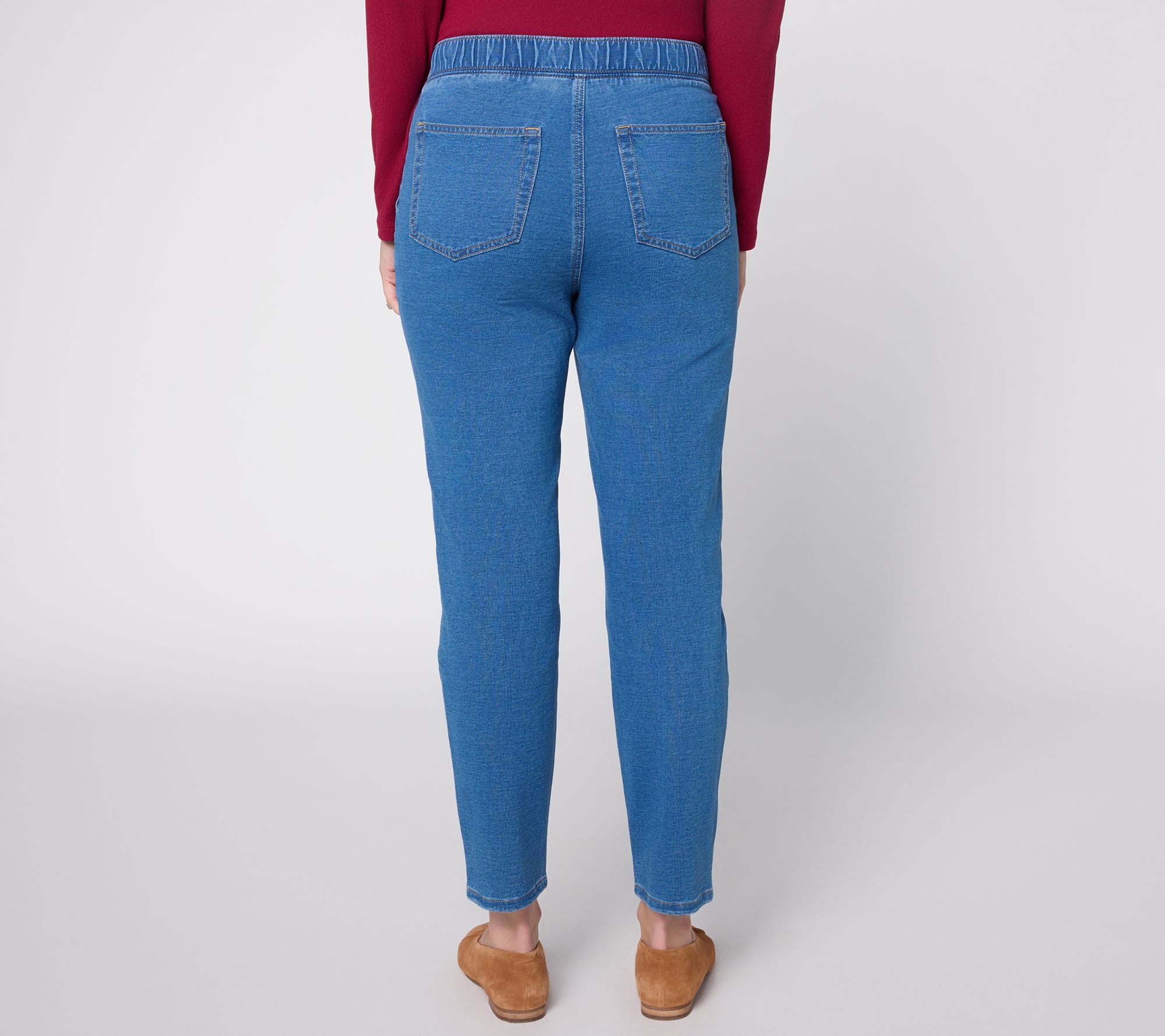A denim look with a delicious feel. Enjoy all-day comfort and a smart, streamlined look with these knit denim straight-leg pants -- your go-to choice for work, errands, or travel. The pull-on style with an elastic waistband offers an easy fit, while front and back pockets bring practicality to busy schedules. From Denim & Co.® Fashions.