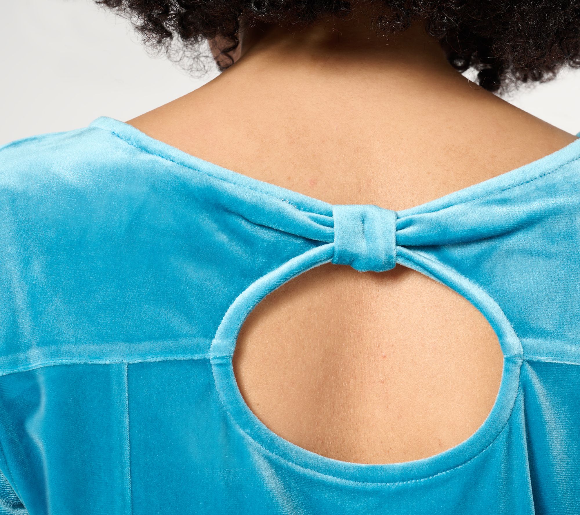 Soft and sophisticated, this knit velvet midi dress lets you elegantly orchestrate everything from office-ready looks to party-perfect styles. (Think, a blazer for business settings or just a statement necklace to deck-the-halls at holiday parties). This chic pocketed piece showcases back-bow and keyhole details, a graceful boat neckline, and figure-flattering princess seams. From Denim & Co.® Fashions.