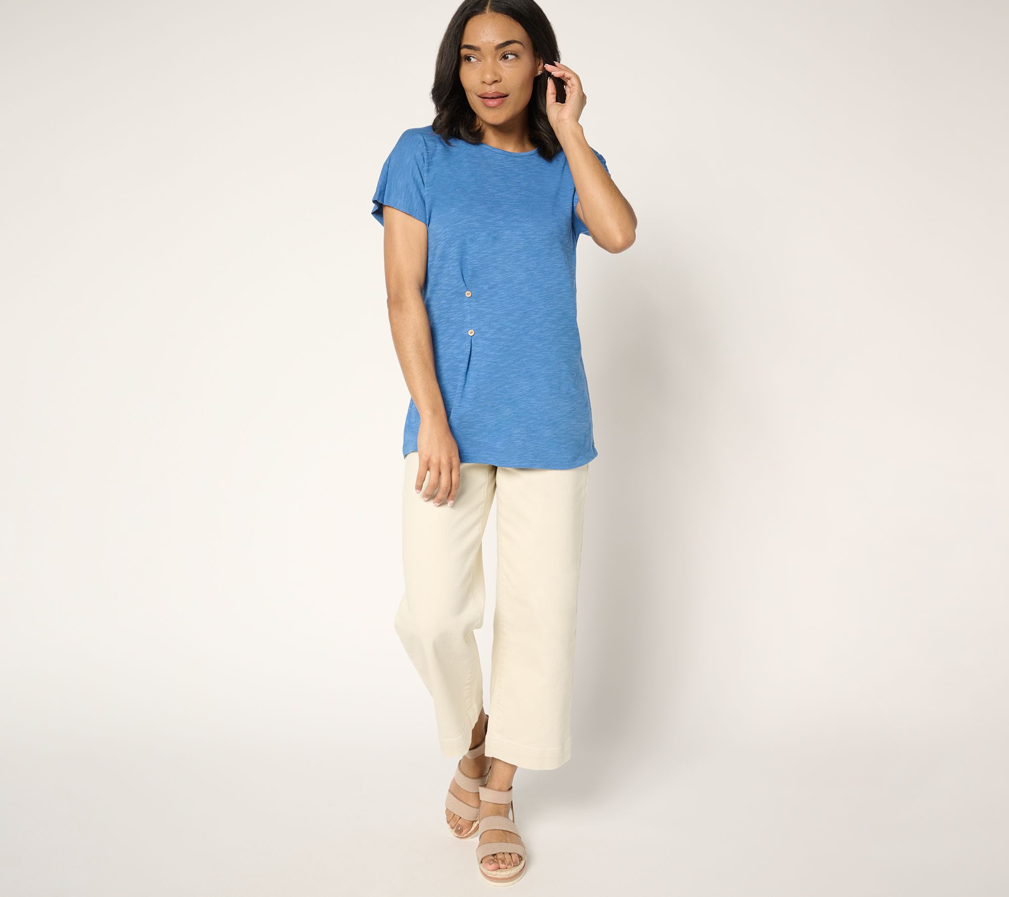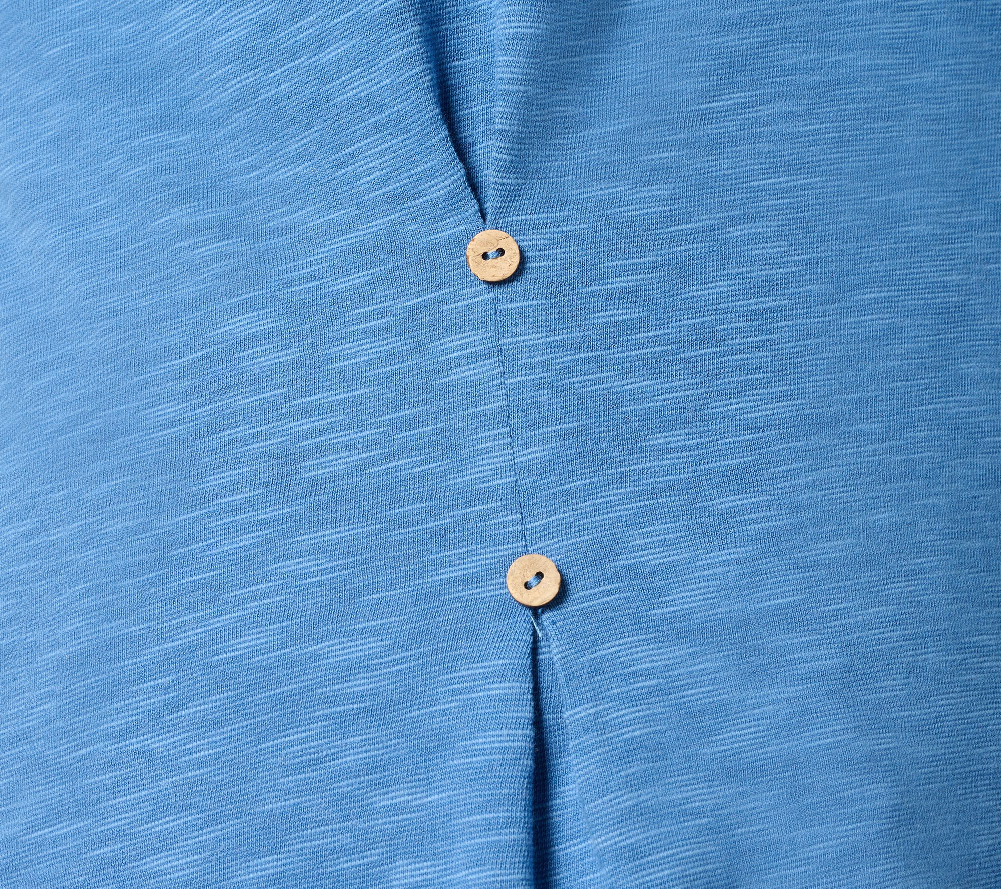 • Features: round neckline, dolman short sleeves, non-functional button pleat on wearer's right side, straight bottom hem
