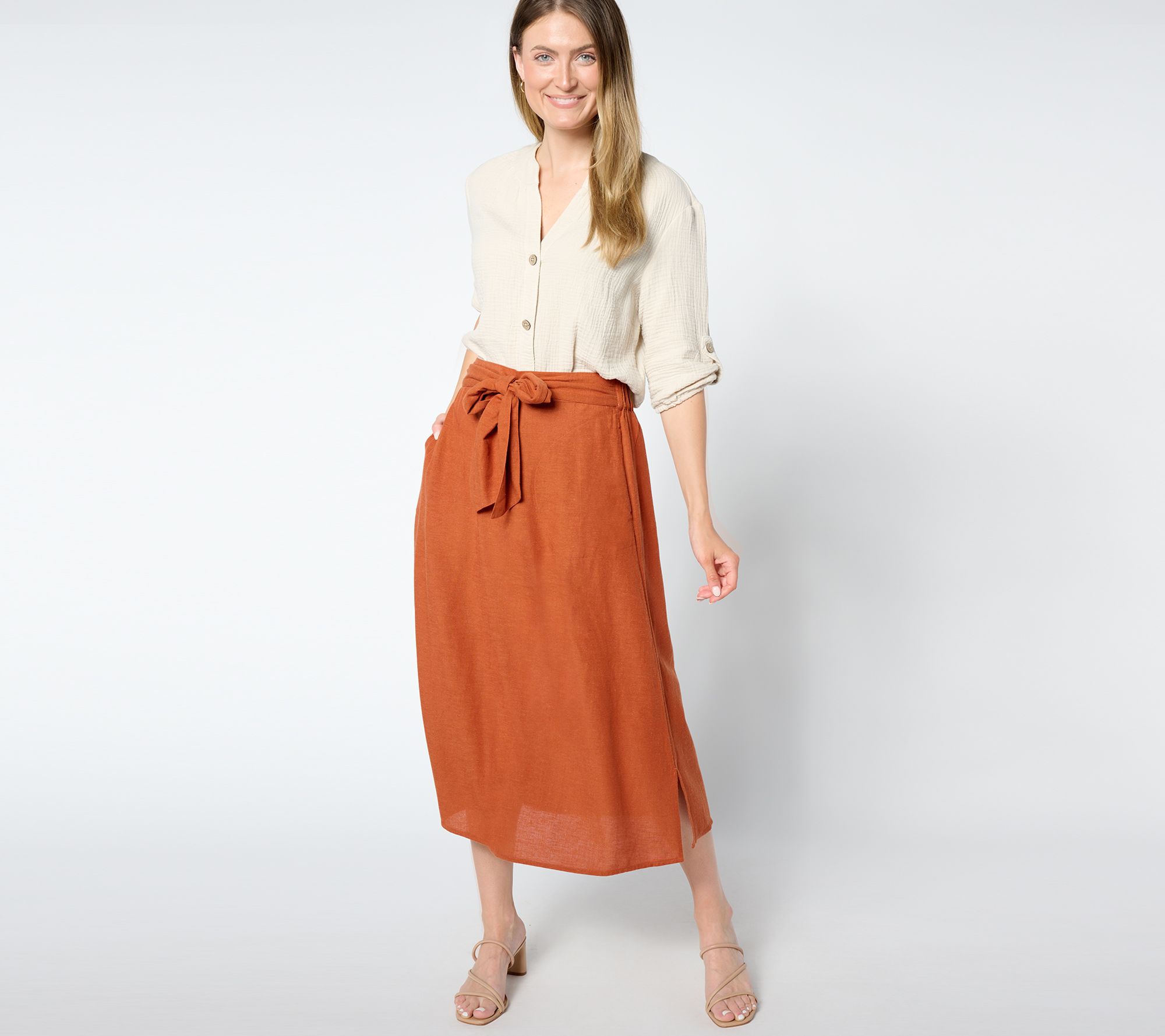 The look of linen without the scratchy feel? Count us in! With this pull-on midi skirt, even the accessorizing is done for you. A self-tie belt finishes the look. From Denim & Co.® Fashions.