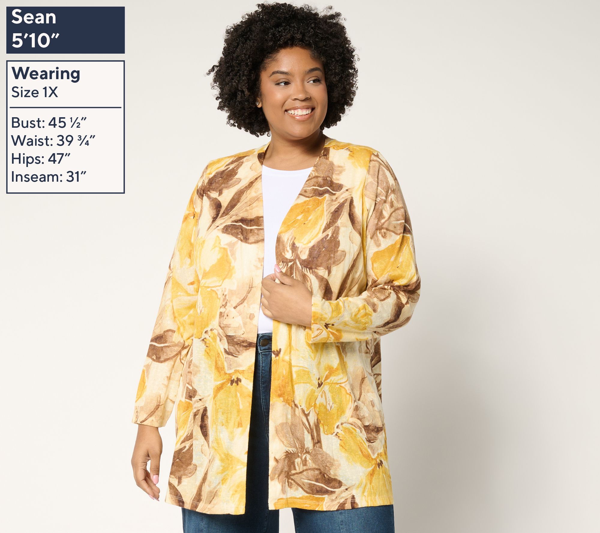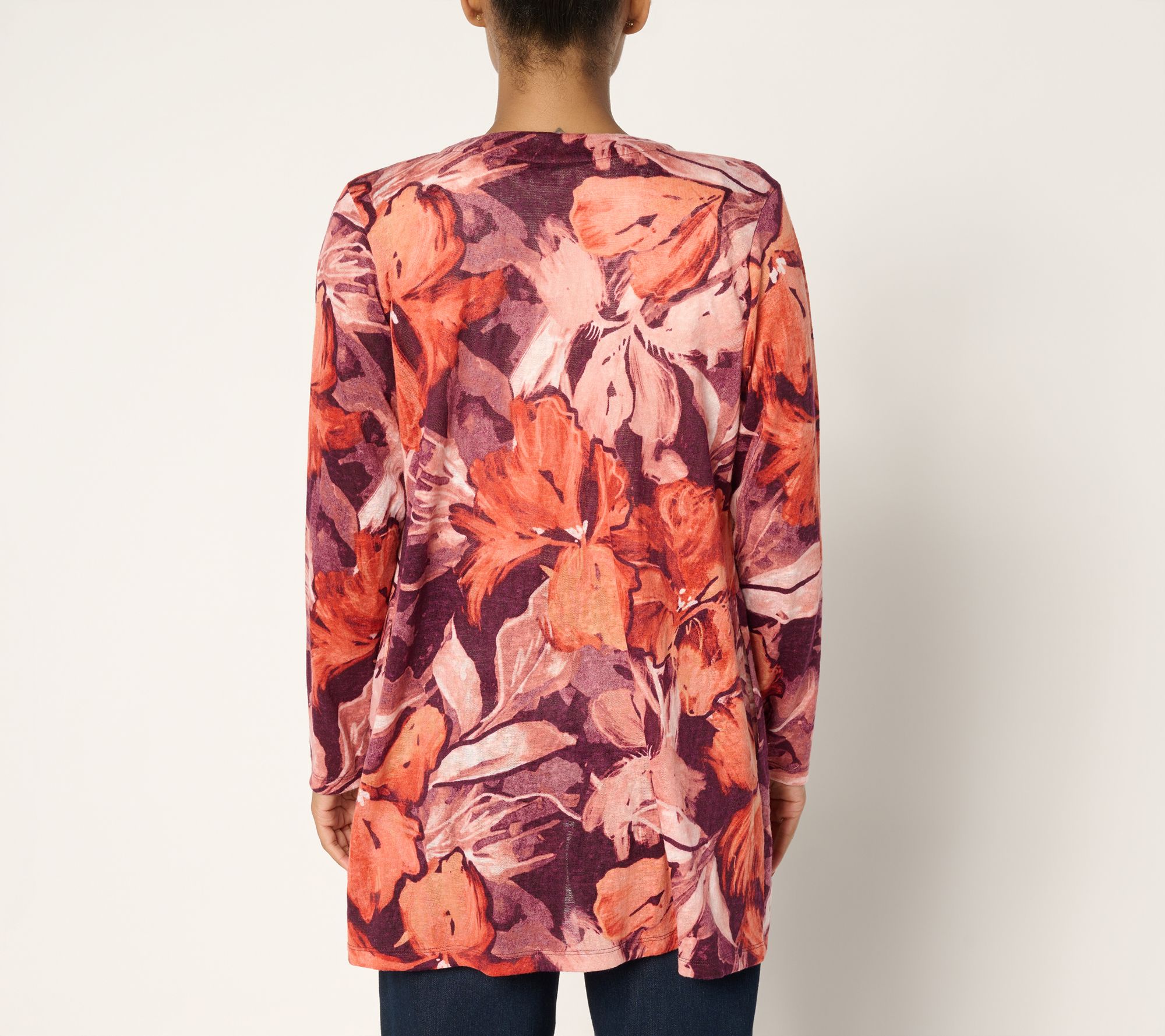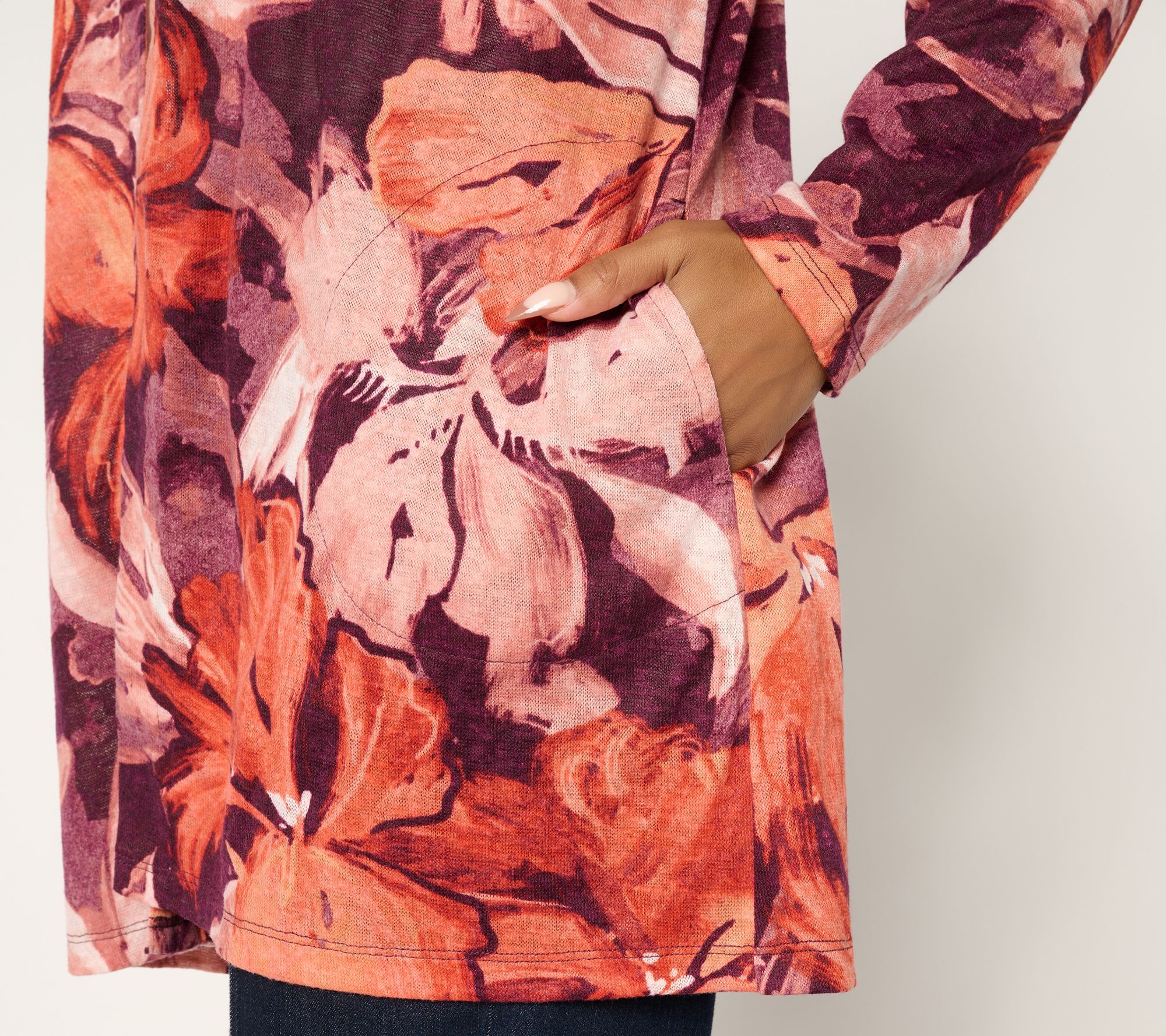 Freshen up your fashion-savvy wardrobe with this cardigan duster awash in bold floral print. It adds artful appeal and a cheerful vibe to any occasion that calls for a lively lightweight layer. Convenient side pockets provide functionality for busy days or travel plans. From Denim & Co.® Fashions.