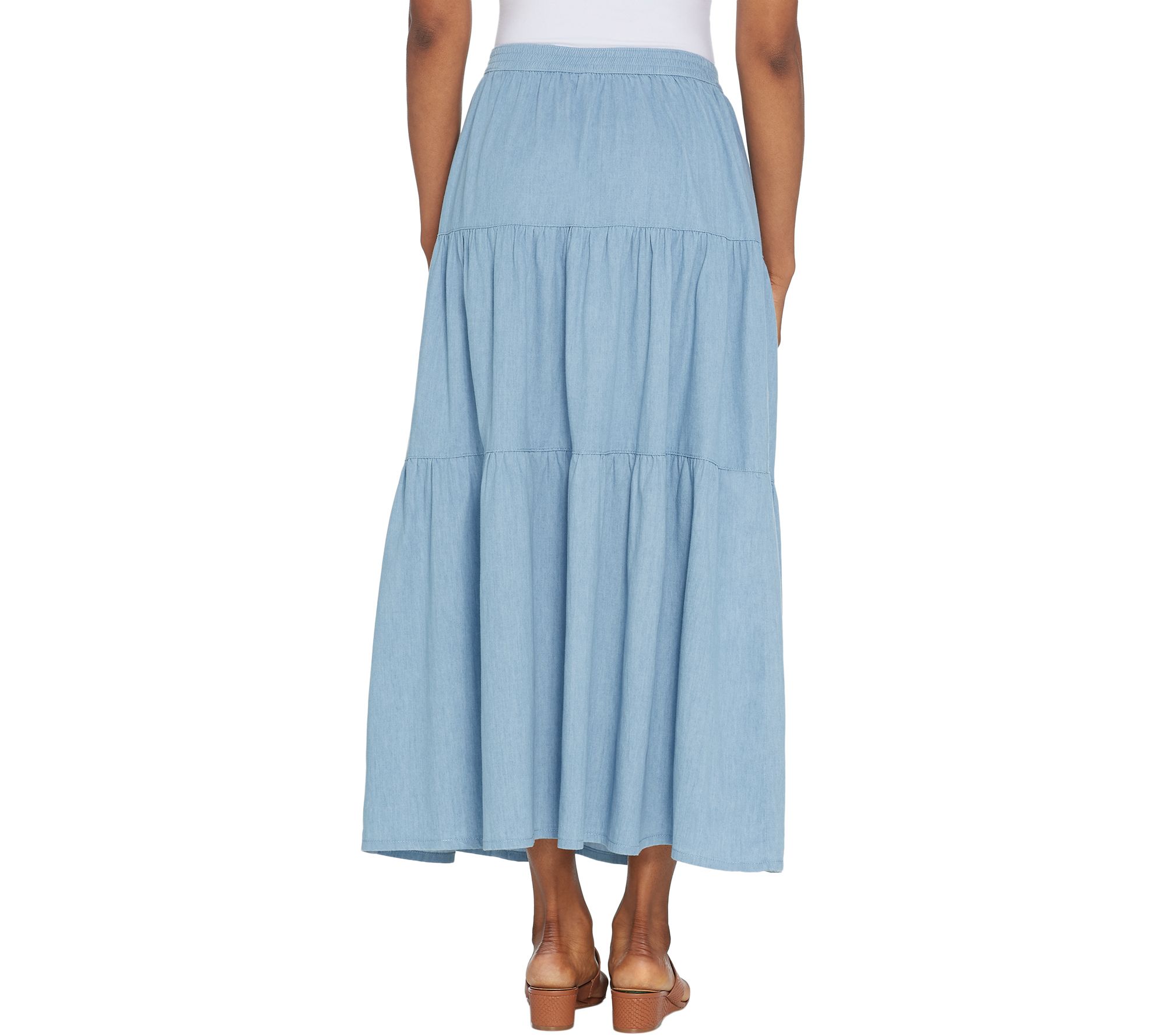 Denim & Co. Petite Stretch Chambray Tiered Pull-On Maxi Skirt