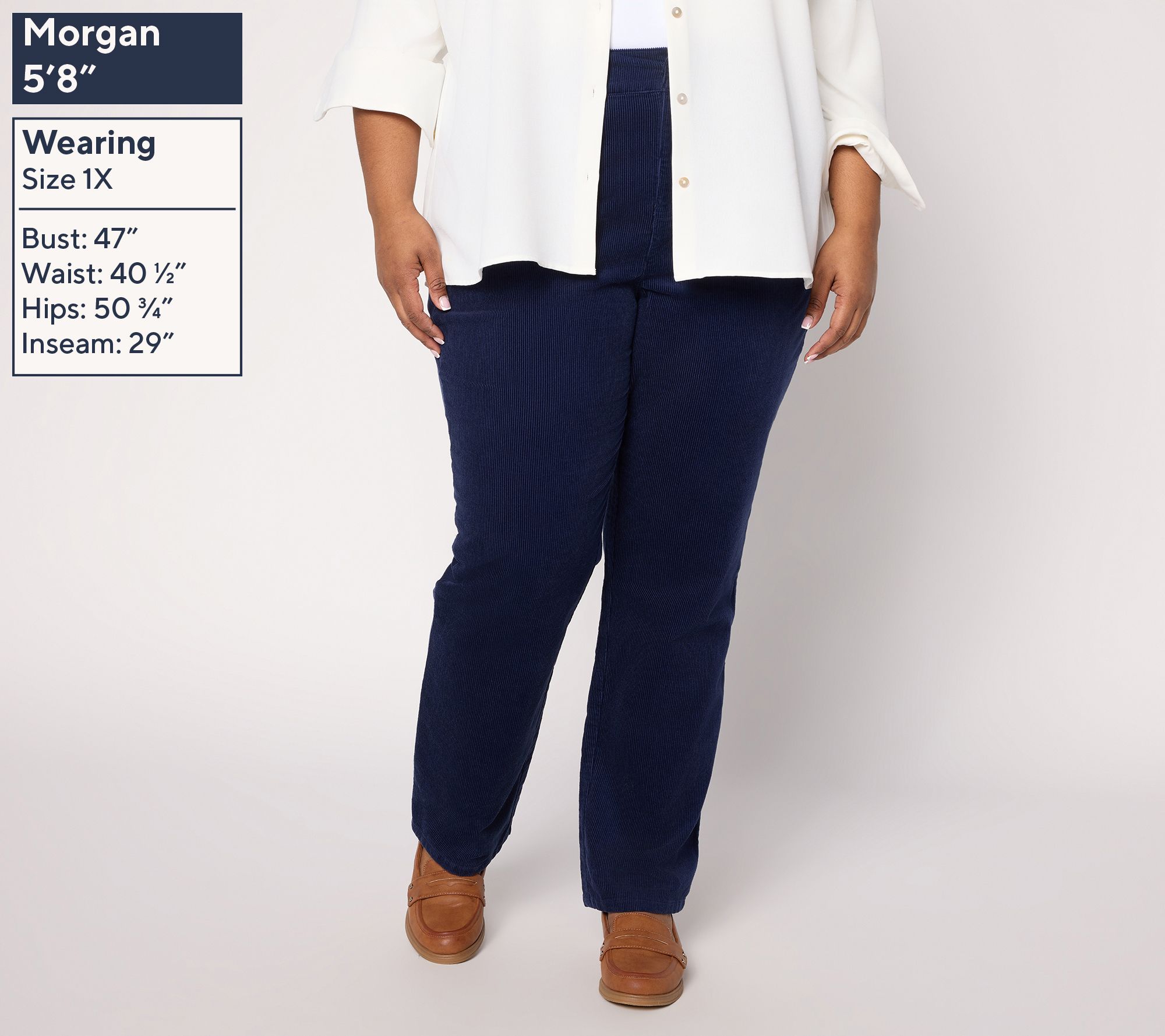 Casual days out or afternoon meet-ups get an upgrade with these knit corduroy straight-leg pants. The stretch fabric and graceful shape offer comfort as you move, while the elasticized waistband at the back makes slipping them on a breeze. With practical pockets and a clean finished hem, they're easy to dress up with a sweater or down with your favorite sneakers. From Denim & Co.® Fashions.