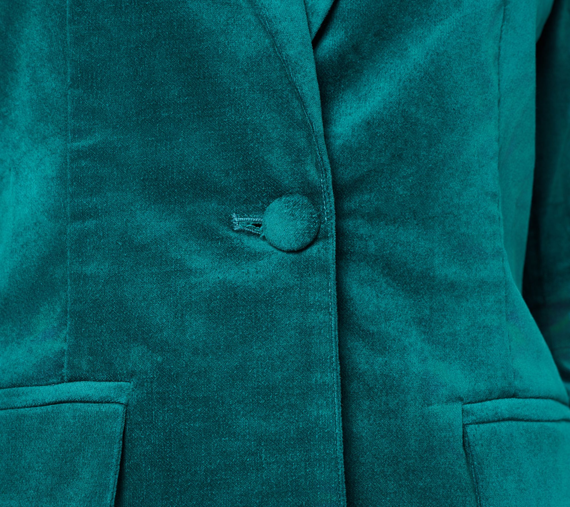 Features: princess seams, back vents, single welt pocket openings, single functional covered button at center front, shoulder pads, straight hem