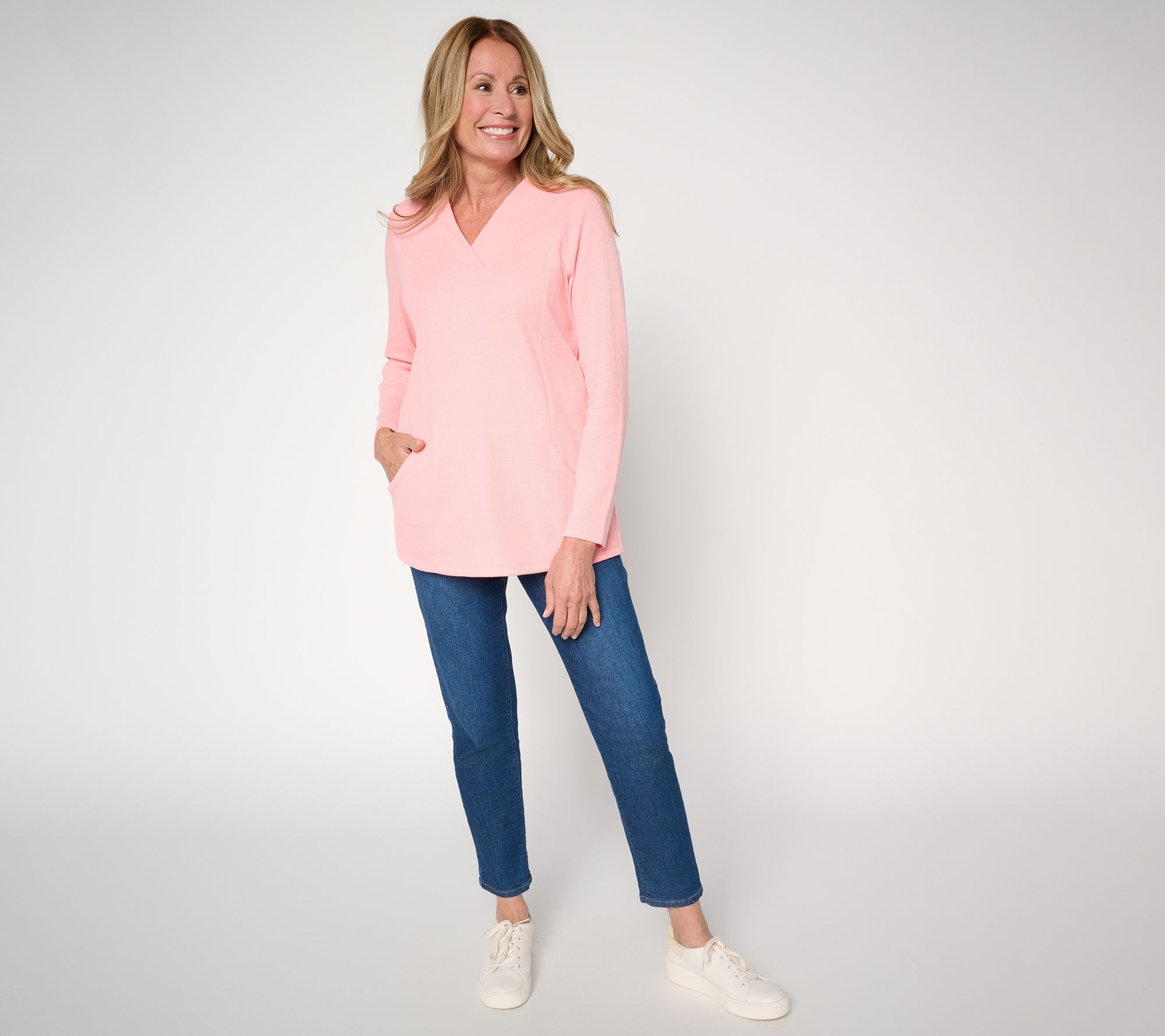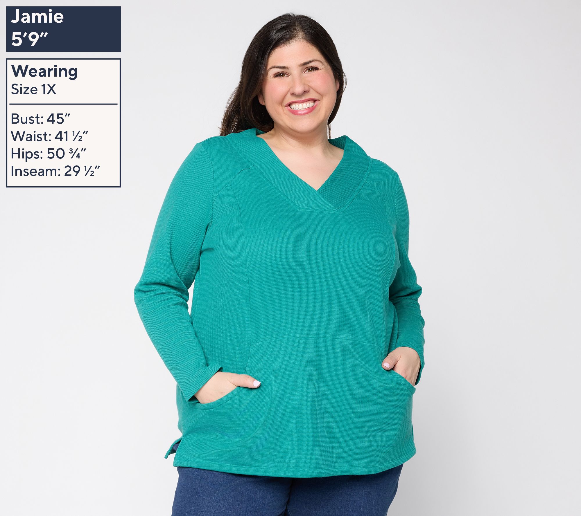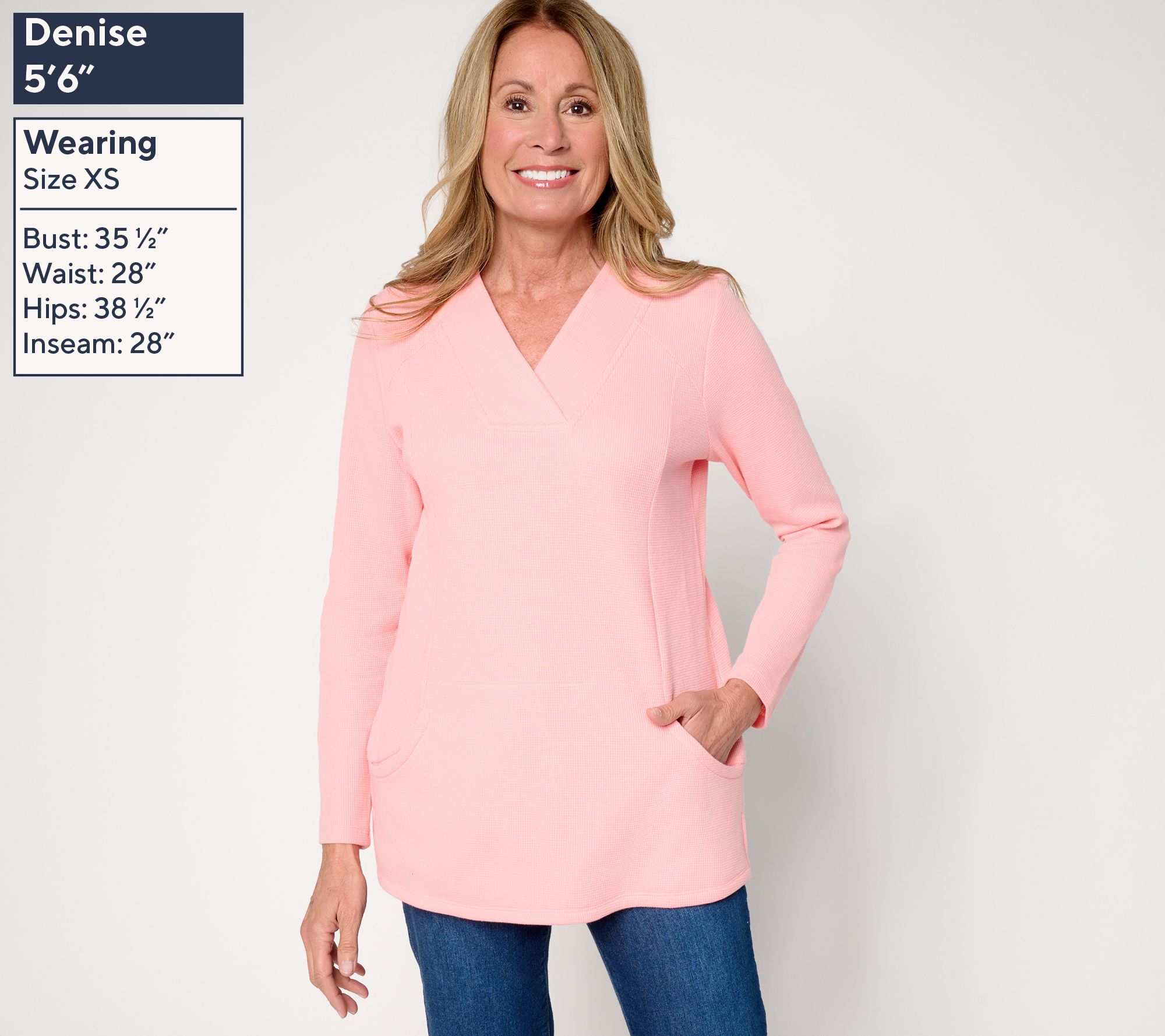 Cut a casual (and chic!) figure in this waffle knit tunic. The wide crossover V-neckline adds a sophisticated touch, as do the front curved princess seams following shape of front kangaroo pockets. Pair it with anything from favorite jeans to leggings to dress pants -- you can't go wrong with this lovely top. From Denim & Co.® Fashions.