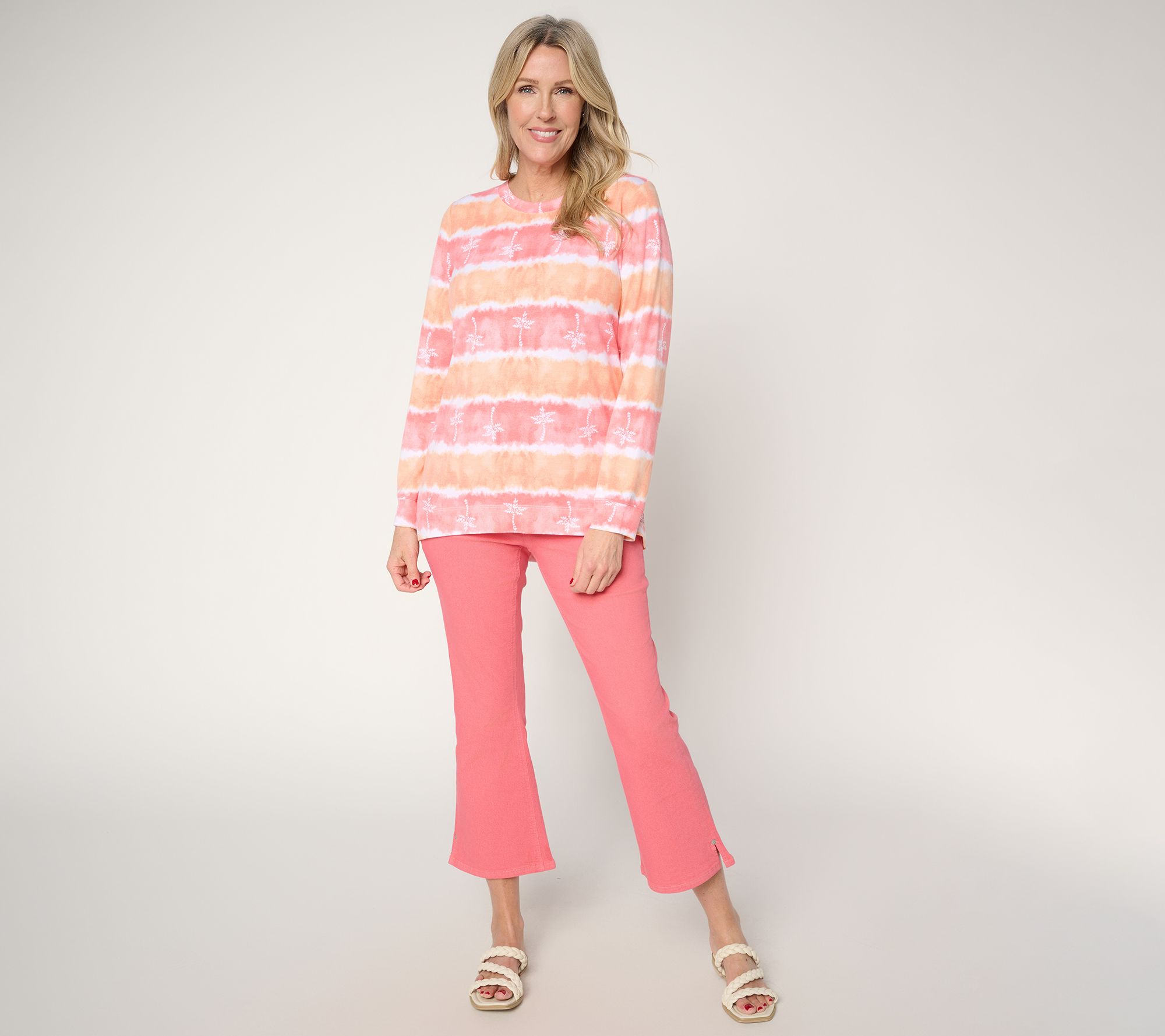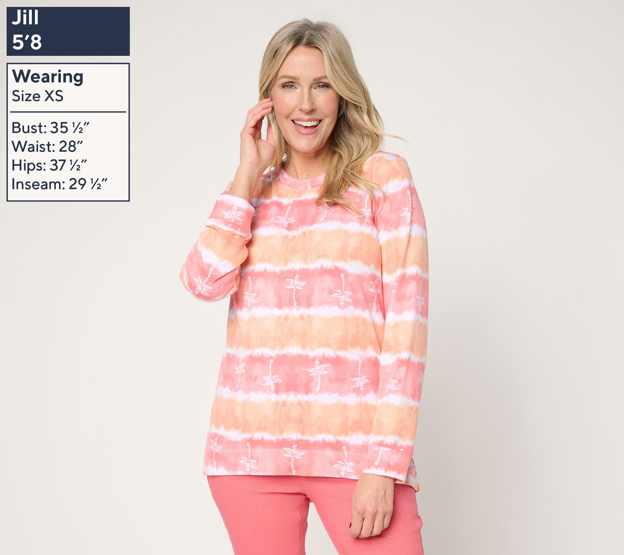 Just coastin'! This playful knit tunic flaunts lively watercolor stripes and a charming beach motif that put you into vacation mode from the word go. Designed with a curved hi-low hemline and long sleeves with wide cuffs, it's an easy pullover you'll reach for all season -- whether you're out for a boardwalk stroll or relaxing with friends. From Denim & Co.® Fashions.