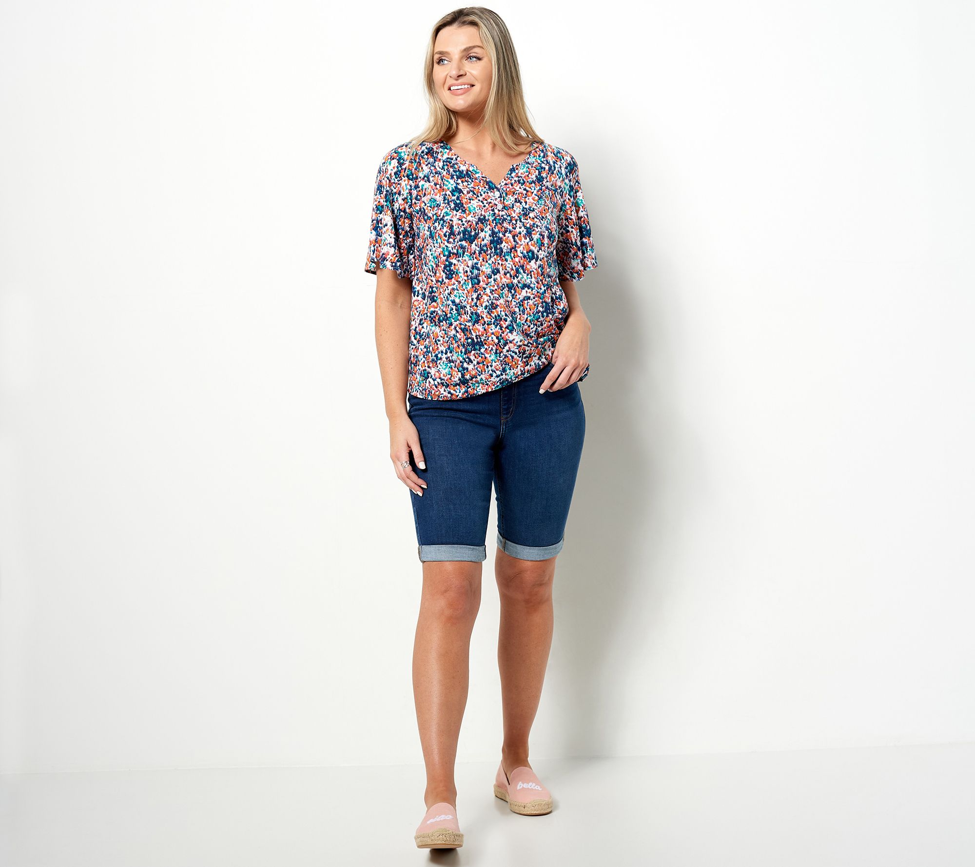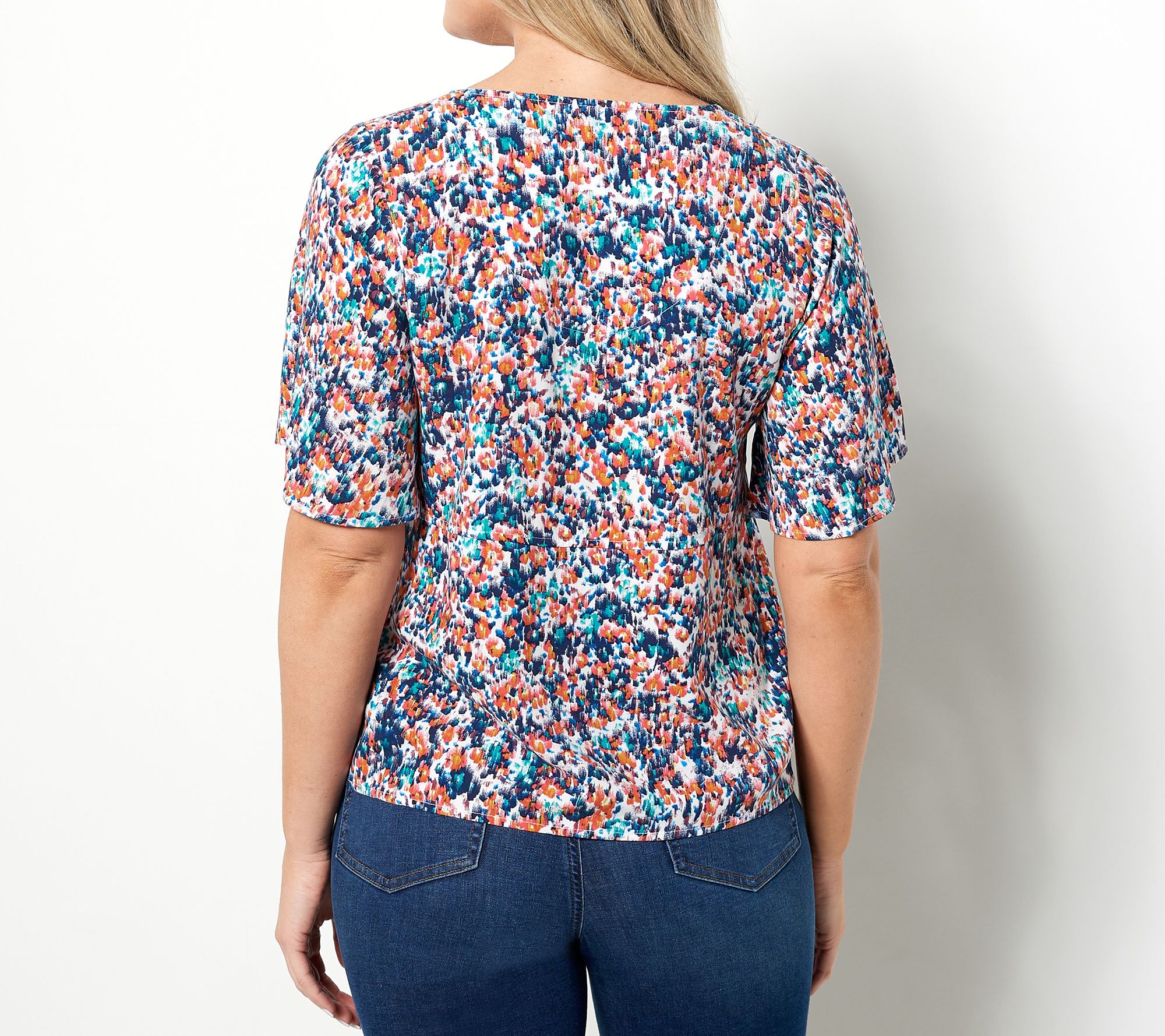 NO RETURNS Denim & Co. Printed Paneled Elbow Flutter Sleeve Blouse wit h 2 Piece YPlacket, Princess Seams, Waist Seam, Placed Shirring, and D ouble Turnback Hem. Semi-Fitted: Follows the lines of the body with added weari ng ease. Length: Missy Range: 25 1/2"-27 5/8"; Plus Range: 28"-31 1/ 2" Content: 100% Viscose. Care: MWCDC/WWLC/ONCBWN/LD/CIIN Imported(F).