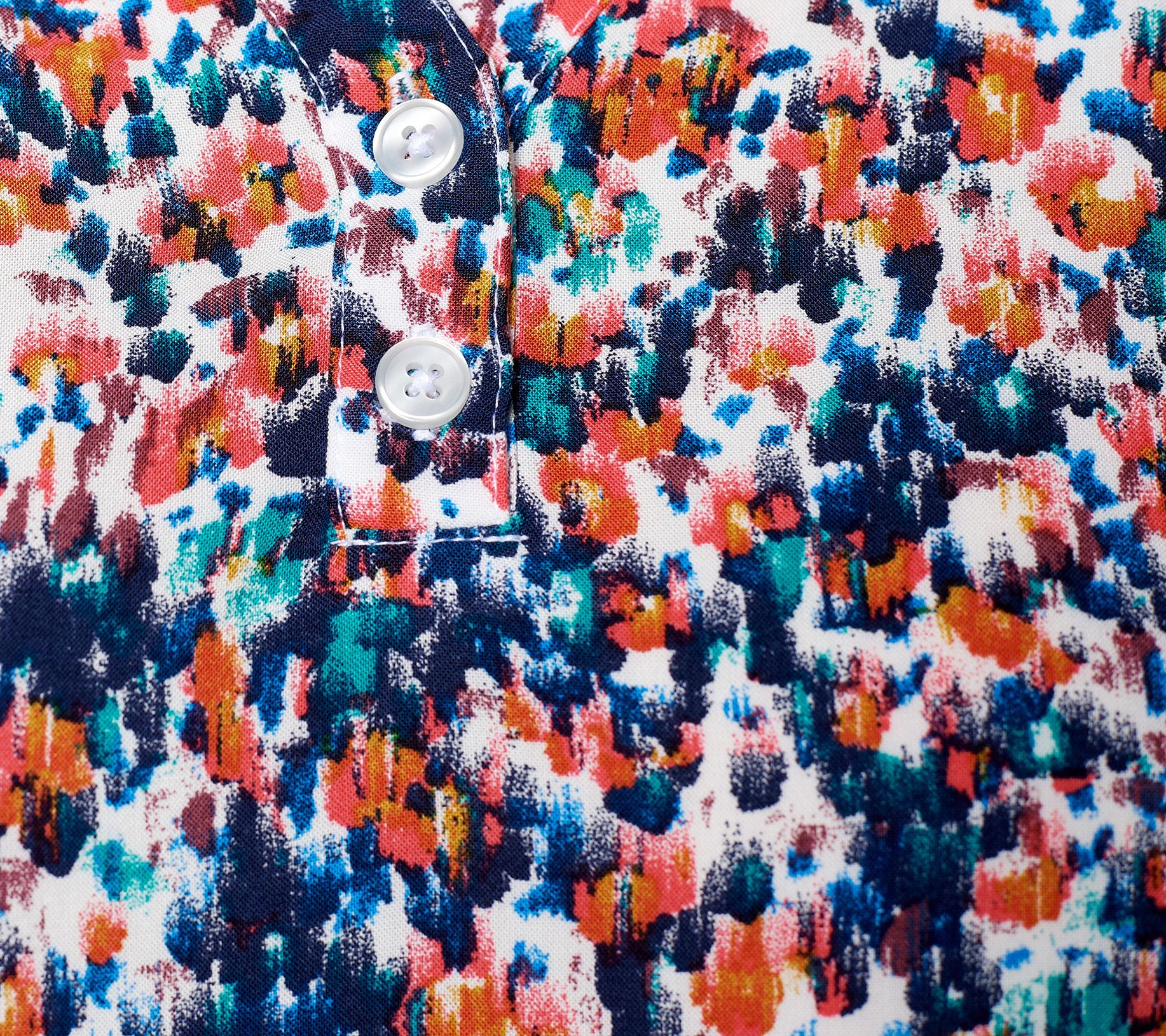 • Features: printed, elbow-length sleeves, Y-placket, princess seaming, waist seam, shirring details