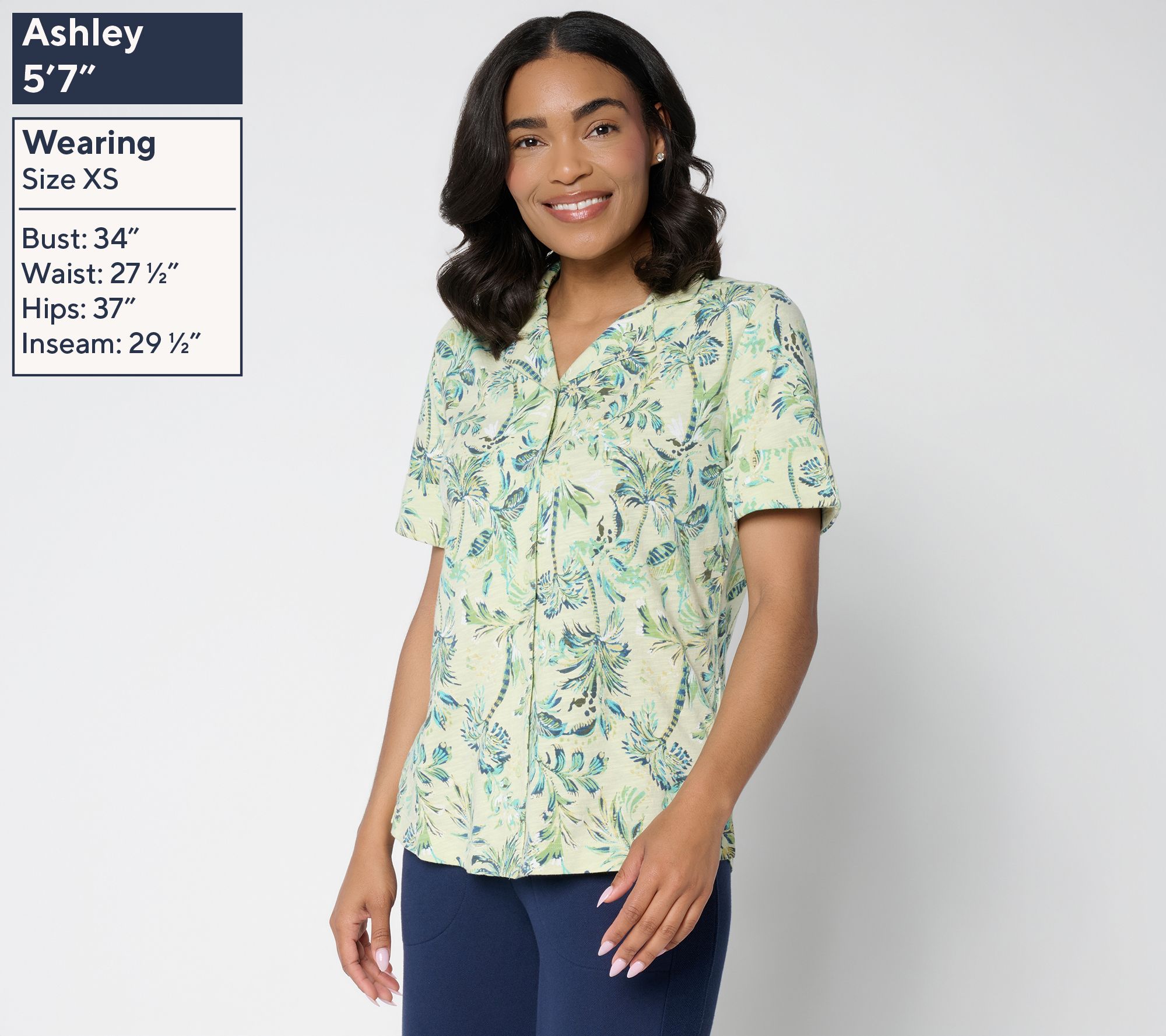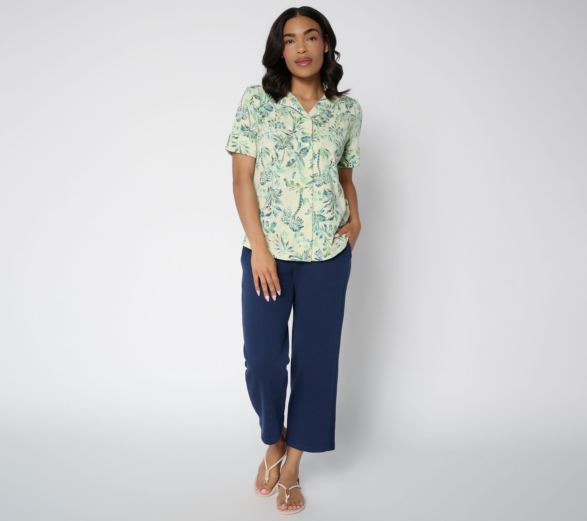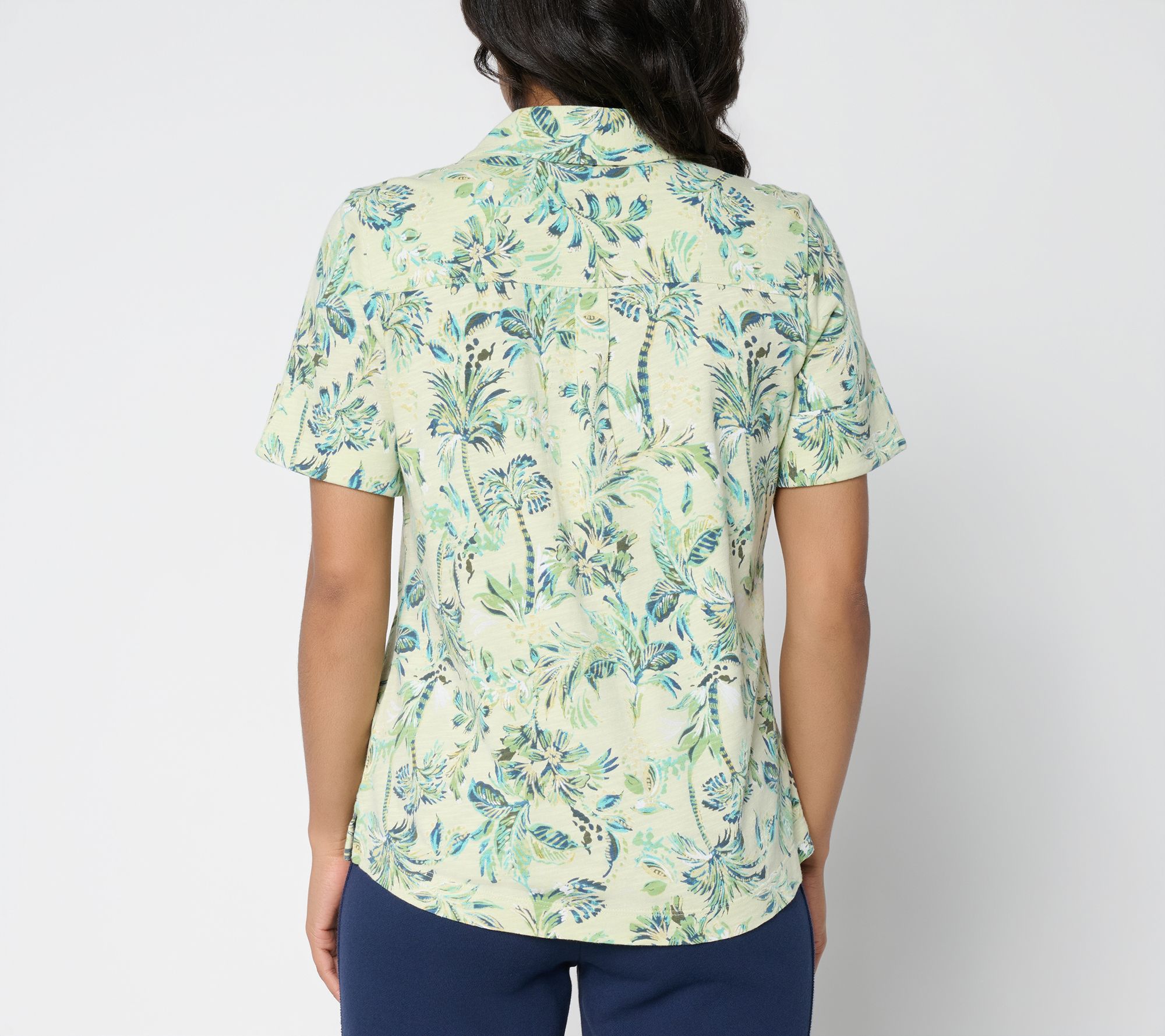 Brunch with friends or a day at the office gets a stylish upgrade with this printed button-front top. The linen-blend fabric keeps you cool and comfortable, while details like a notch collar and cuffed short sleeves add effortless polish for every occasion. From Denim & Co.® Fashions.