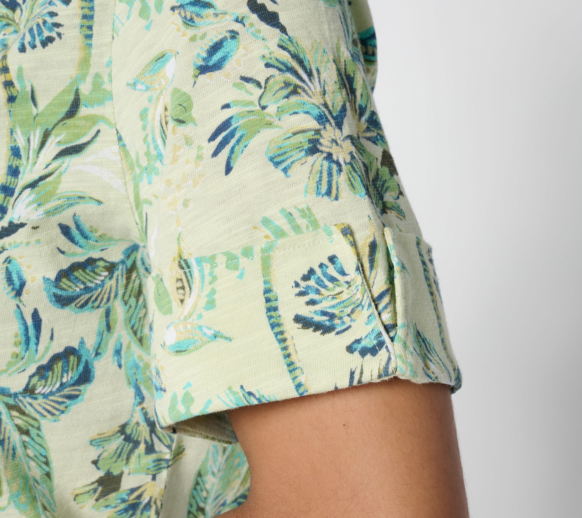 Features: printed, button-front placket, notch collar, forward shoulder with shirring at seam, short sleeves with self-folded and tacked cuffs, back yoke with box pleat, curved bottom hemline with side slits