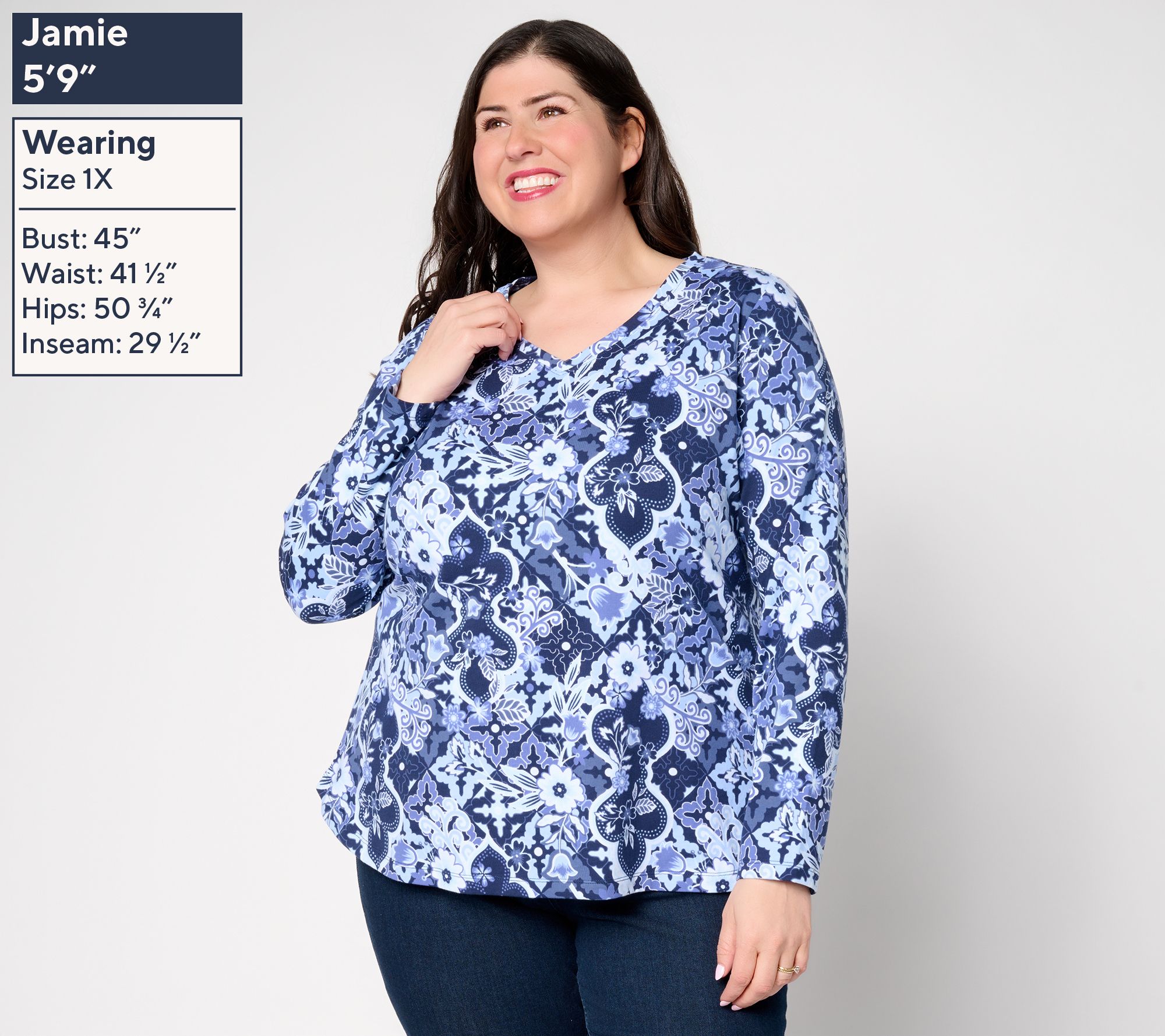 Features: V-neckline, interior back neck patch, long sleeves, curved bottom hem, allover print
