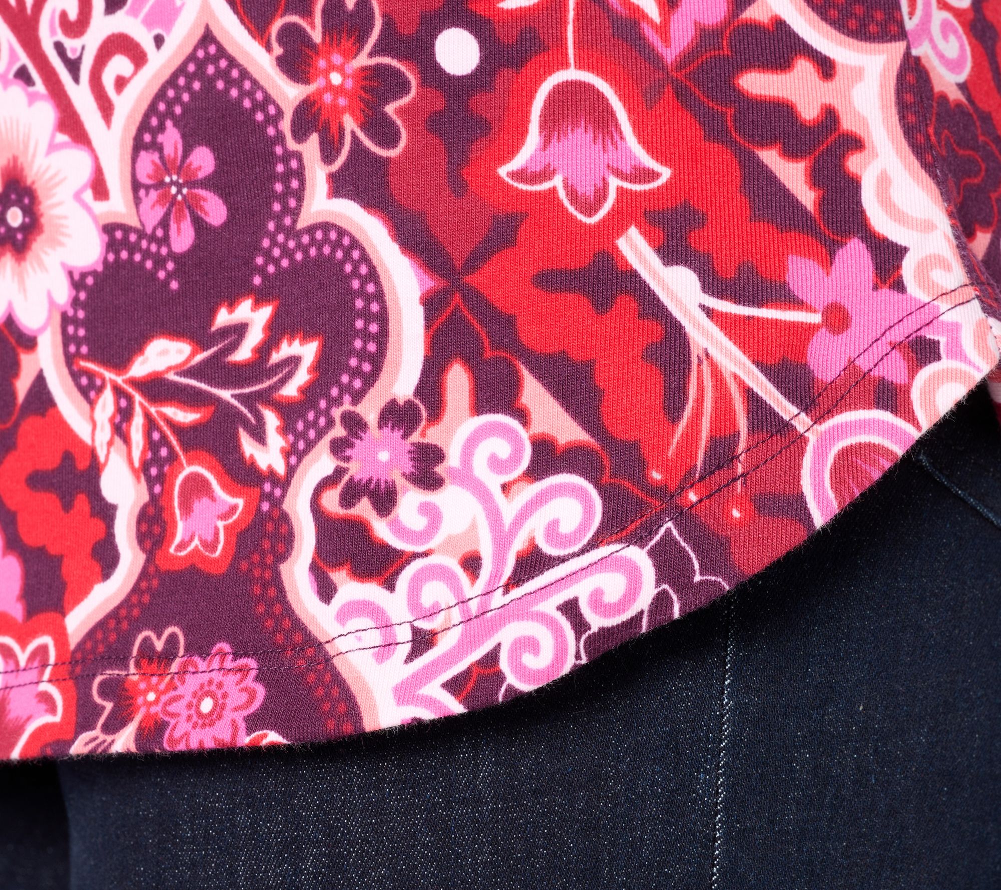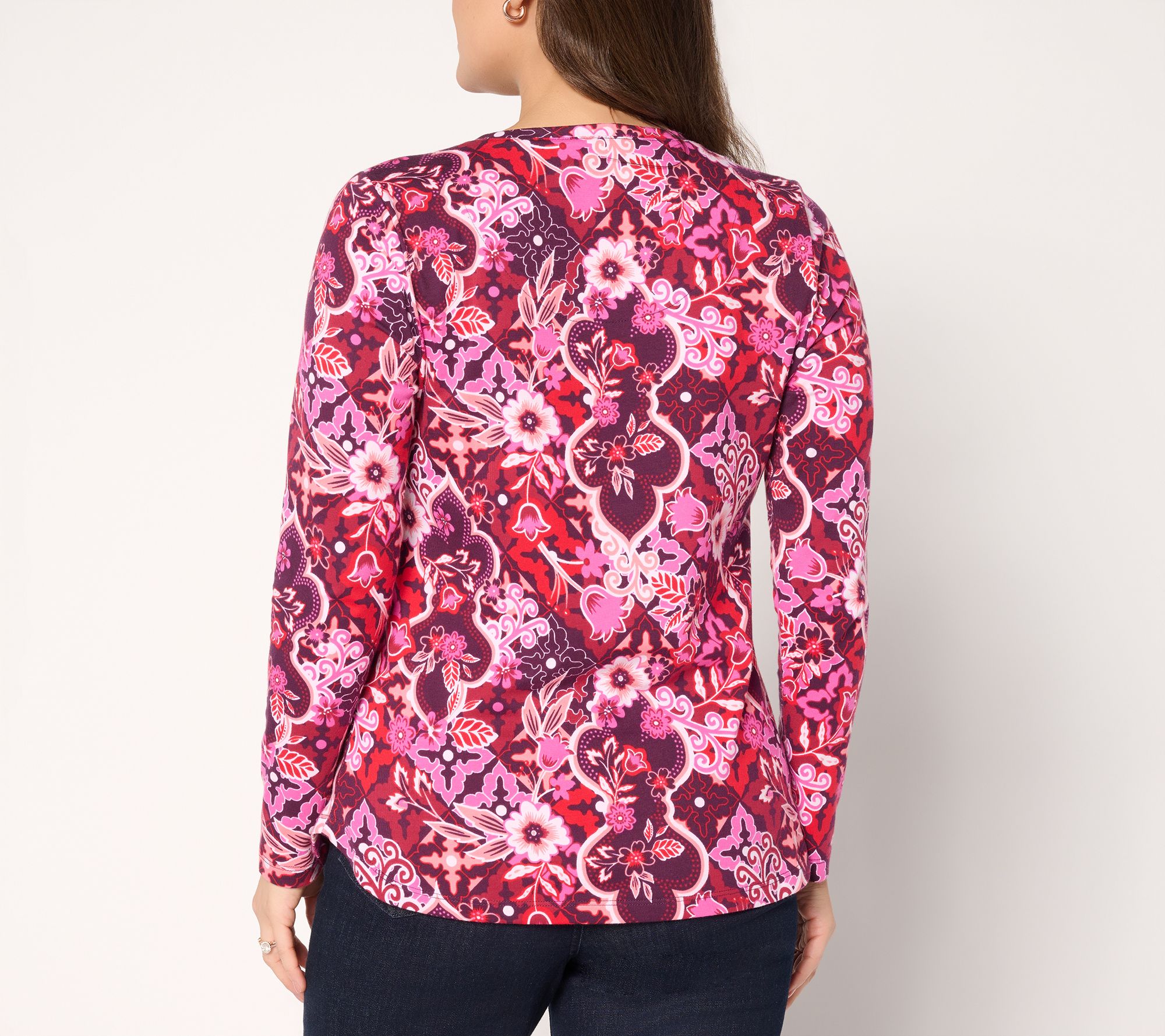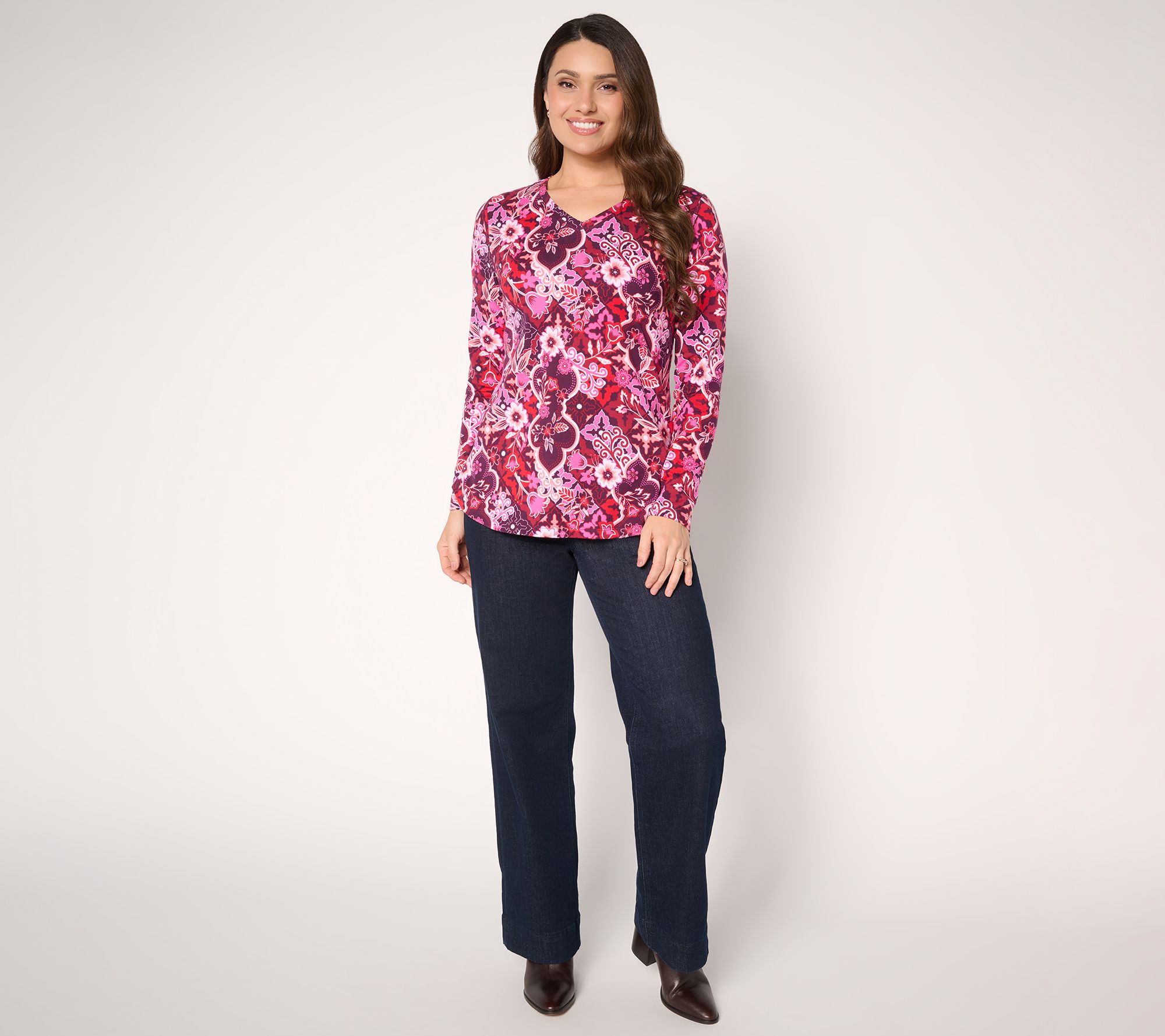 Charismatic and colorful, this Perfect Jersey knit top wakes up your wardrobe with a pretty allover print, flattering V-neckline, and gracefully curved hemline. Wear it when you want to create an energetic and elegant presence that will brighten up even a boring day. From Denim & Co.® Fashions.