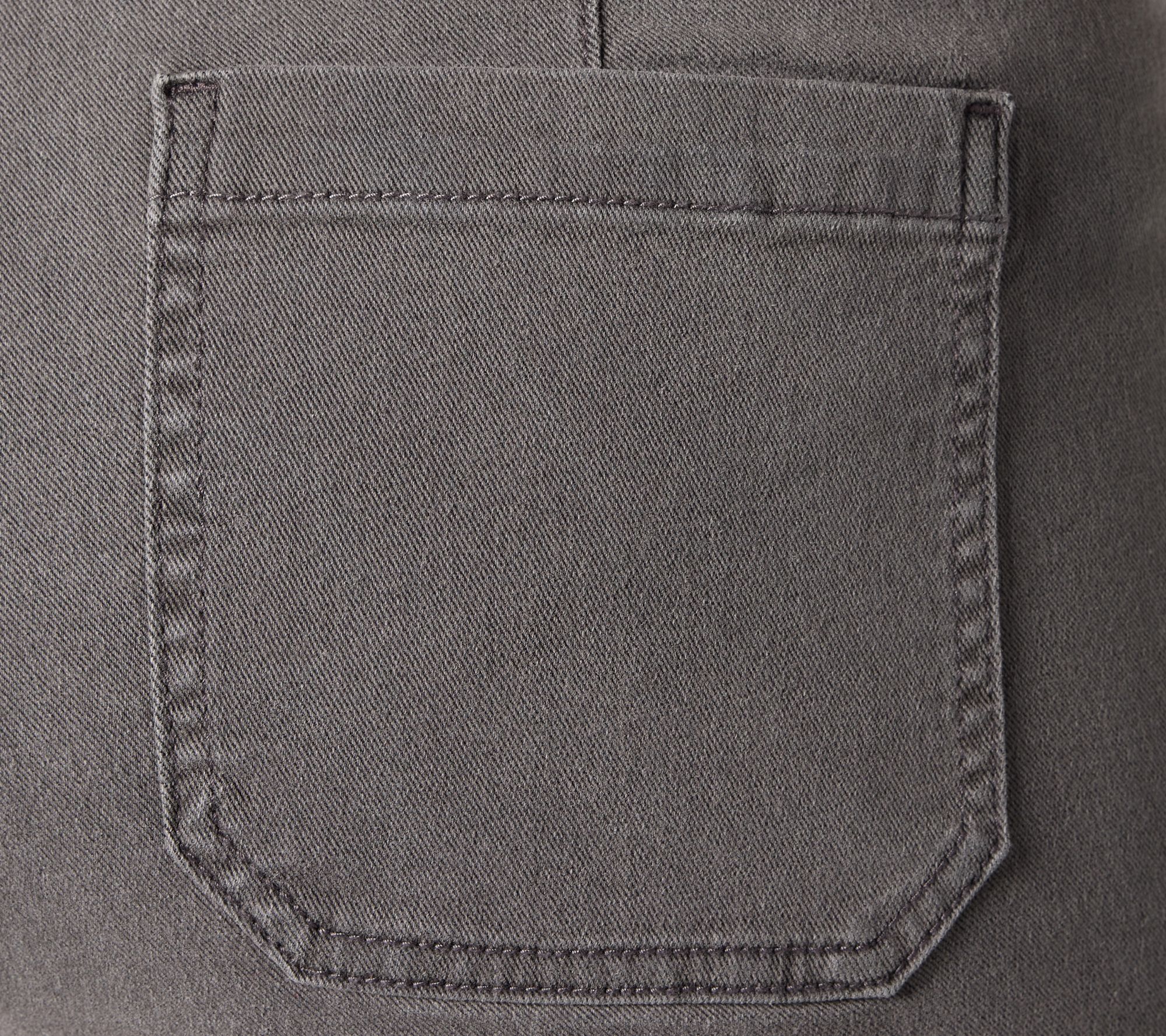 • Features: full length, forward seam detail on front, back darts, top-applied back pockets, encased flat elastic at back waistband