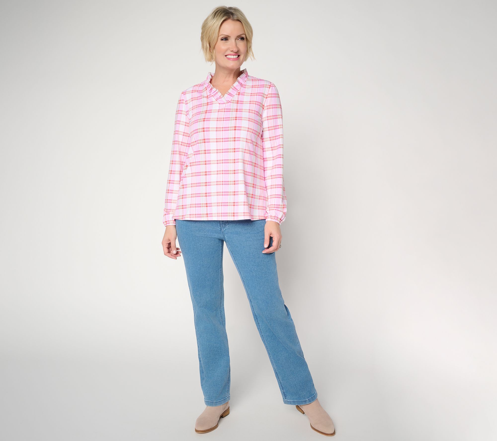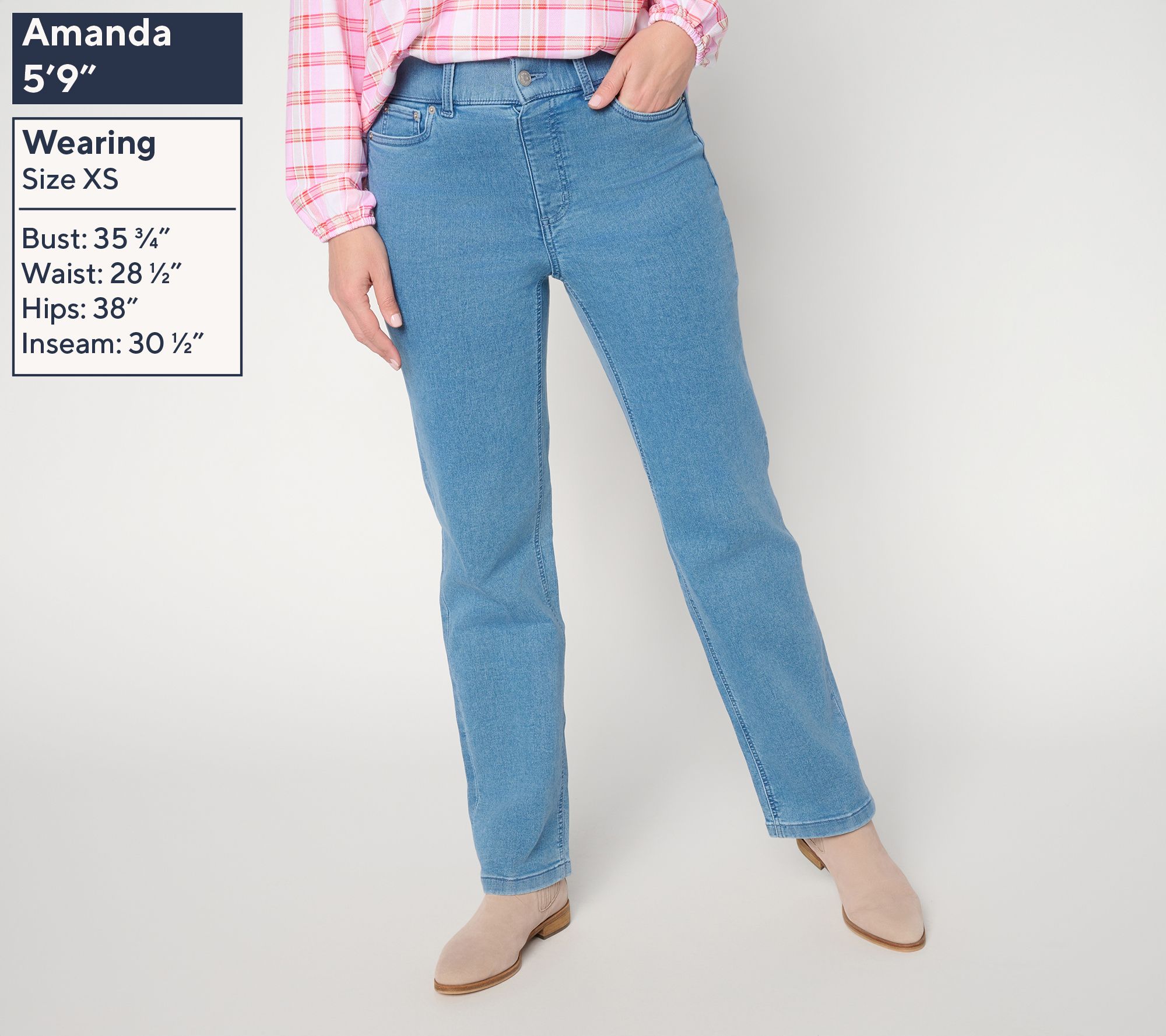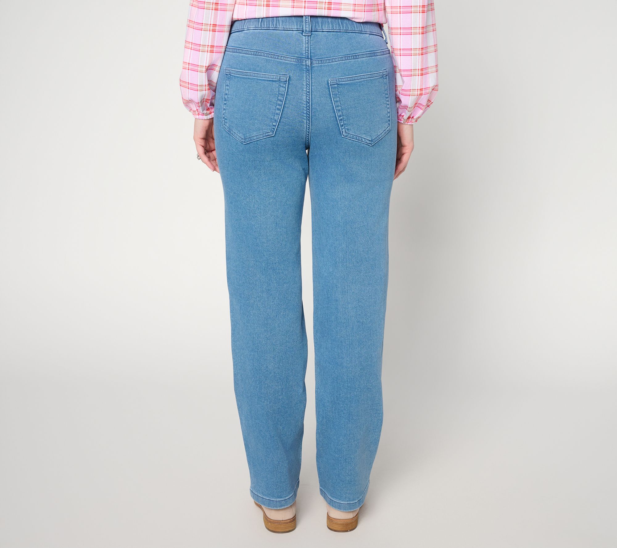 From early morning outings to weekend gatherings, these straight-leg jeans offer a laid-back option that's easy to dress up or keep casual. Woven with a soft blend and featuring classic scoop and back pockets, this versatile pair keeps comfort at the forefront with an elastic back. From Denim & Co.® Fashions.