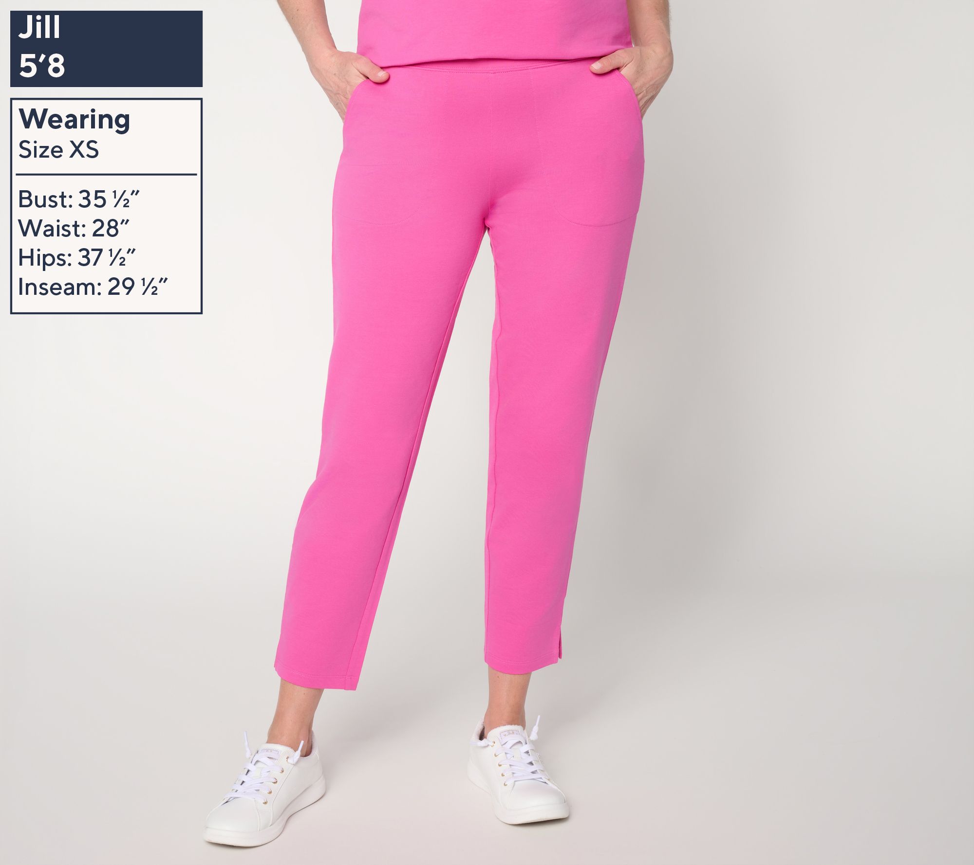 Features: pull-on style, elastic waistband, stitched down side pockets, straight bottom leg opening with side slits, ankle length
