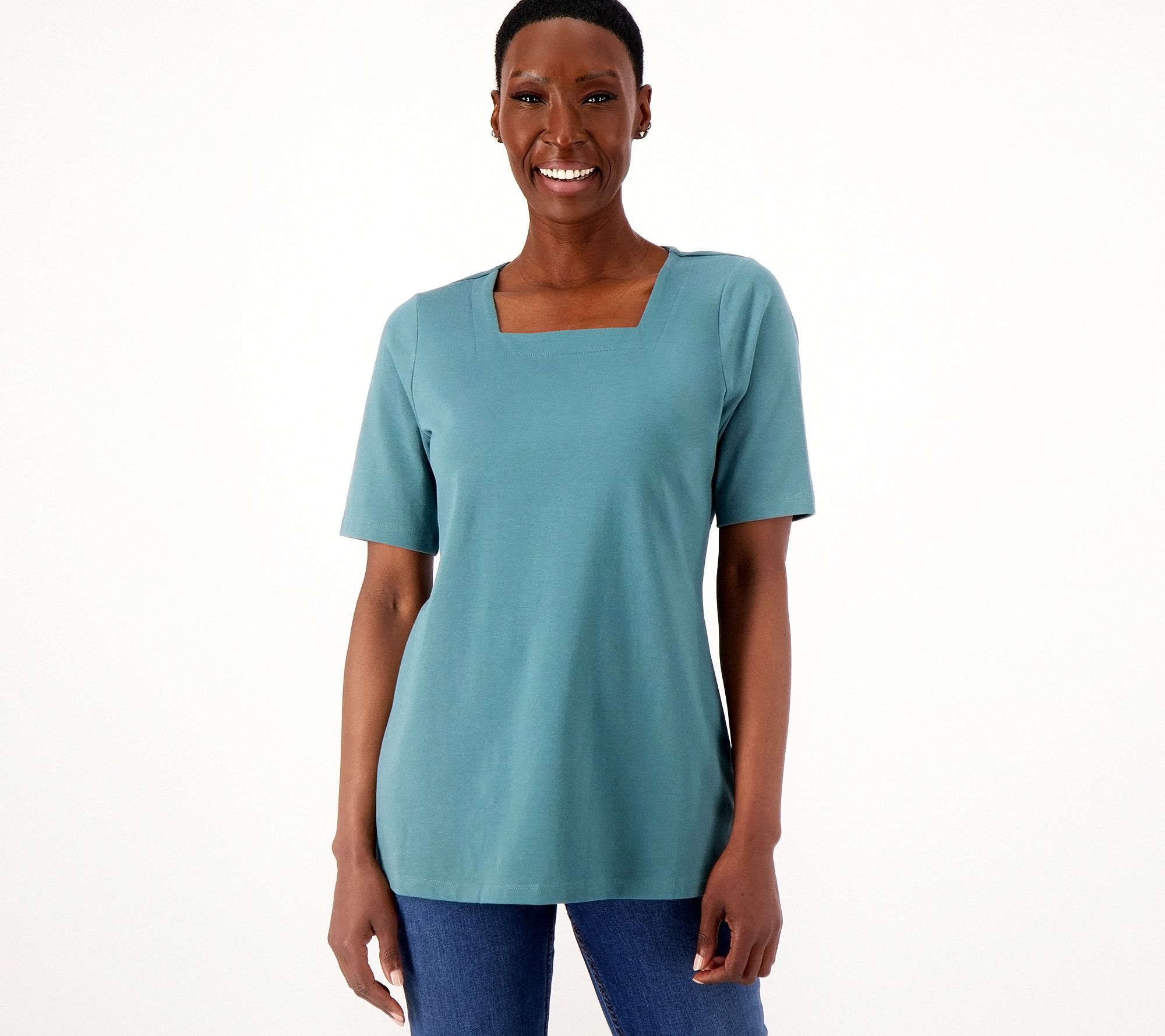 A basic that's anything but ordinary--and instantly chic. This tunic is accented with a square neckline and elbow-length sleeves--and ready to pair with leggings, skirts, and more. It really is hip to be square! From Denim & Co.®