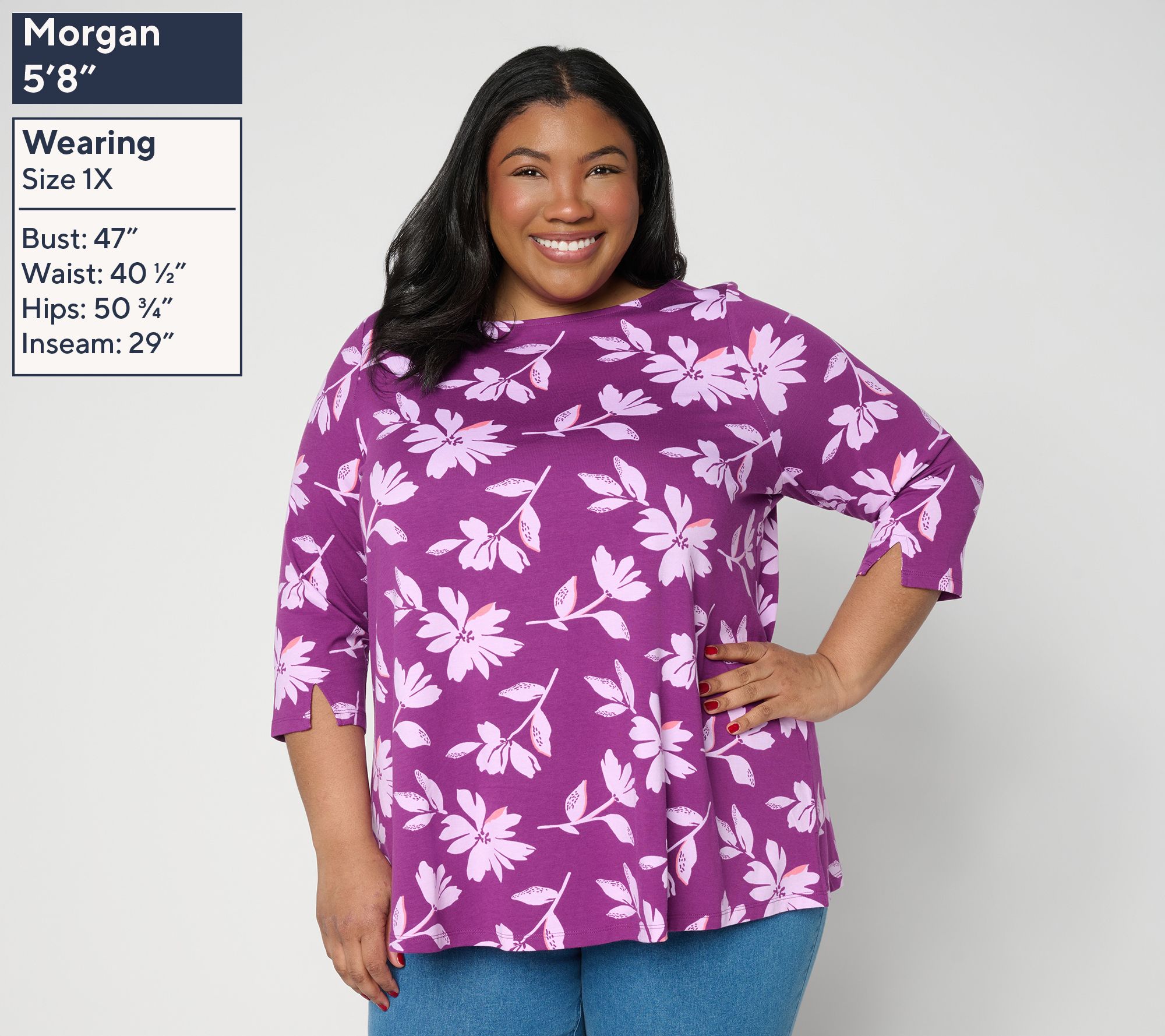 • Features: allover print, boat neckline, 3/4-length sleeves with front slit, straight bottom hem with side slits, swing silhouette