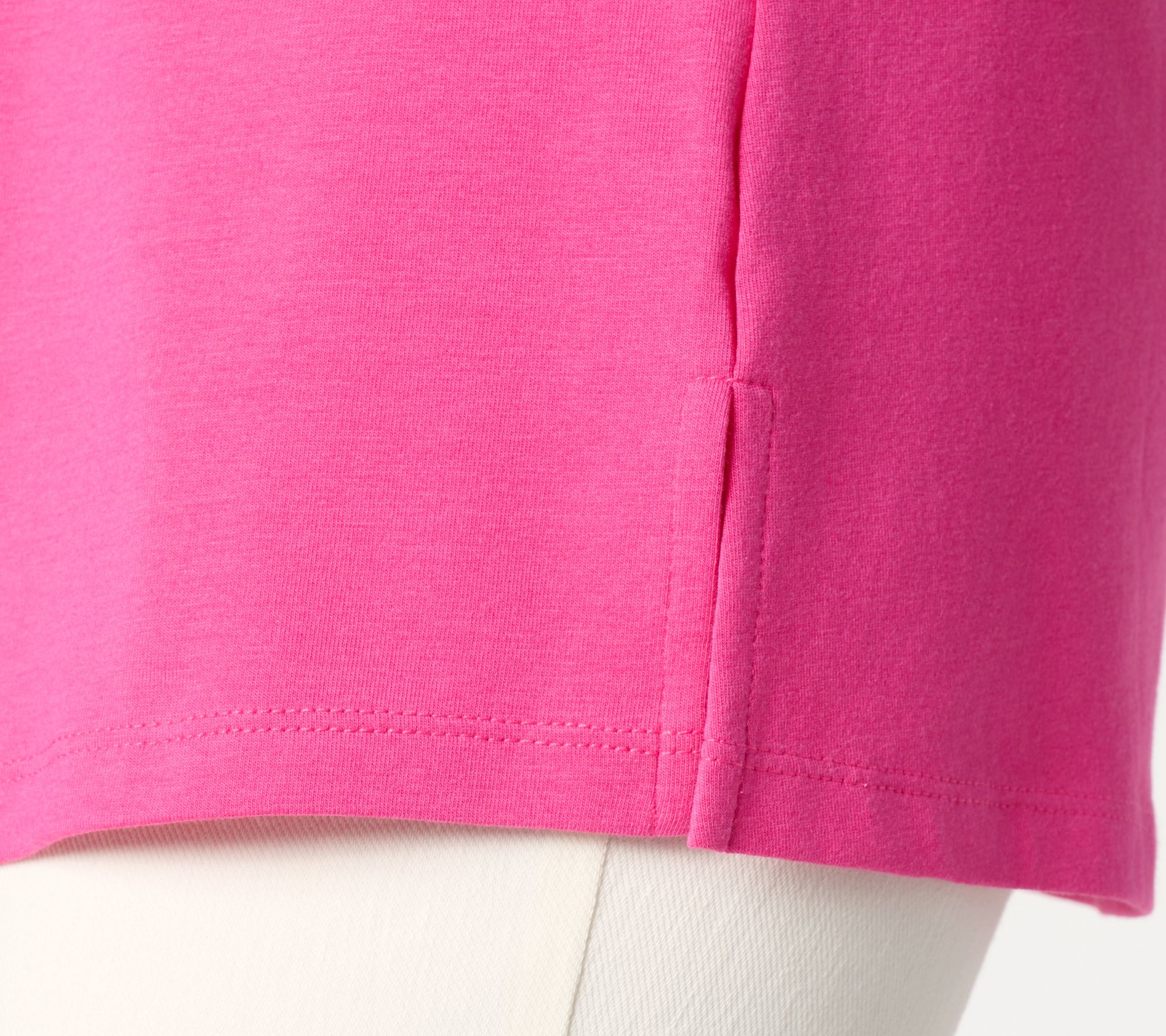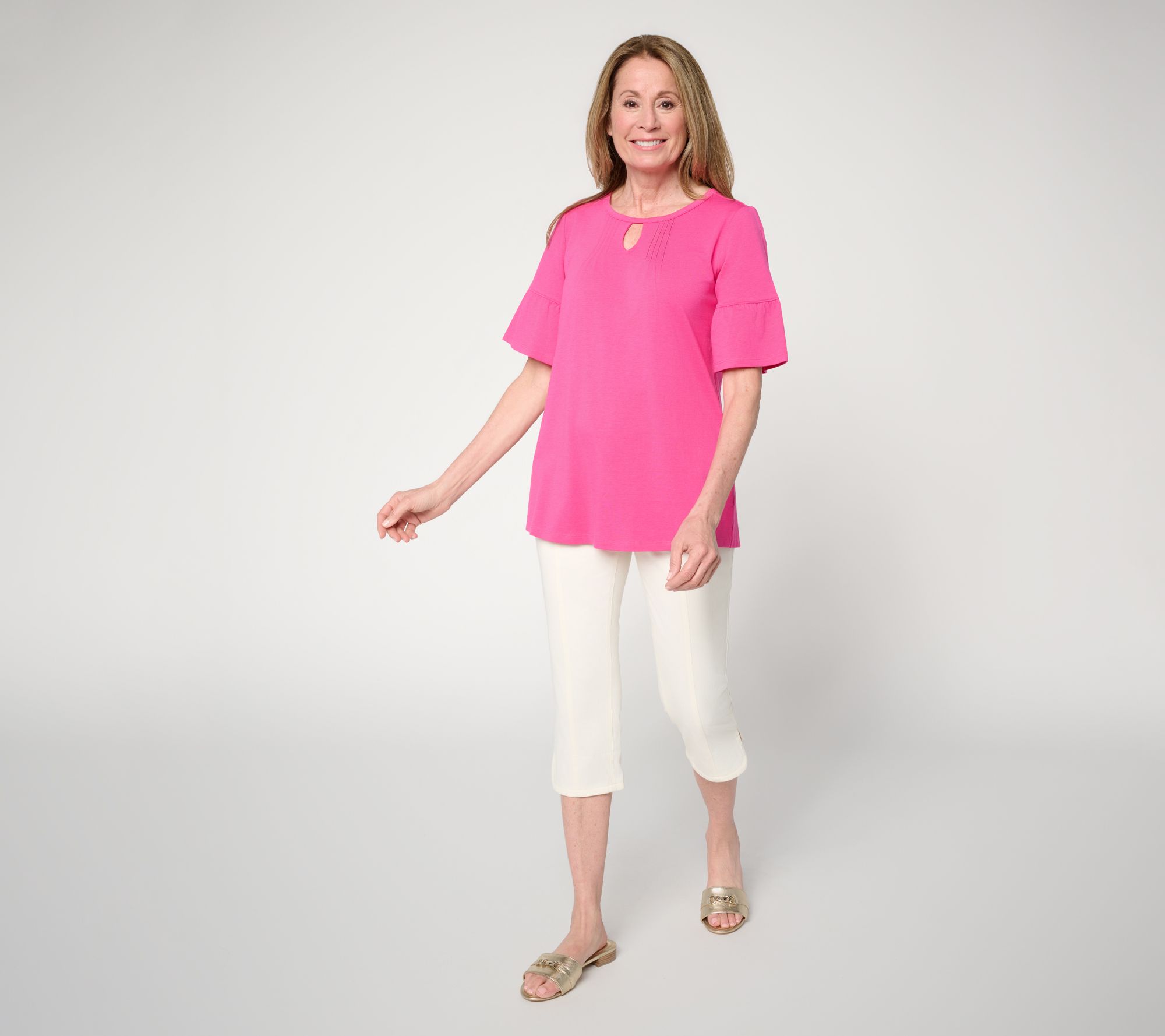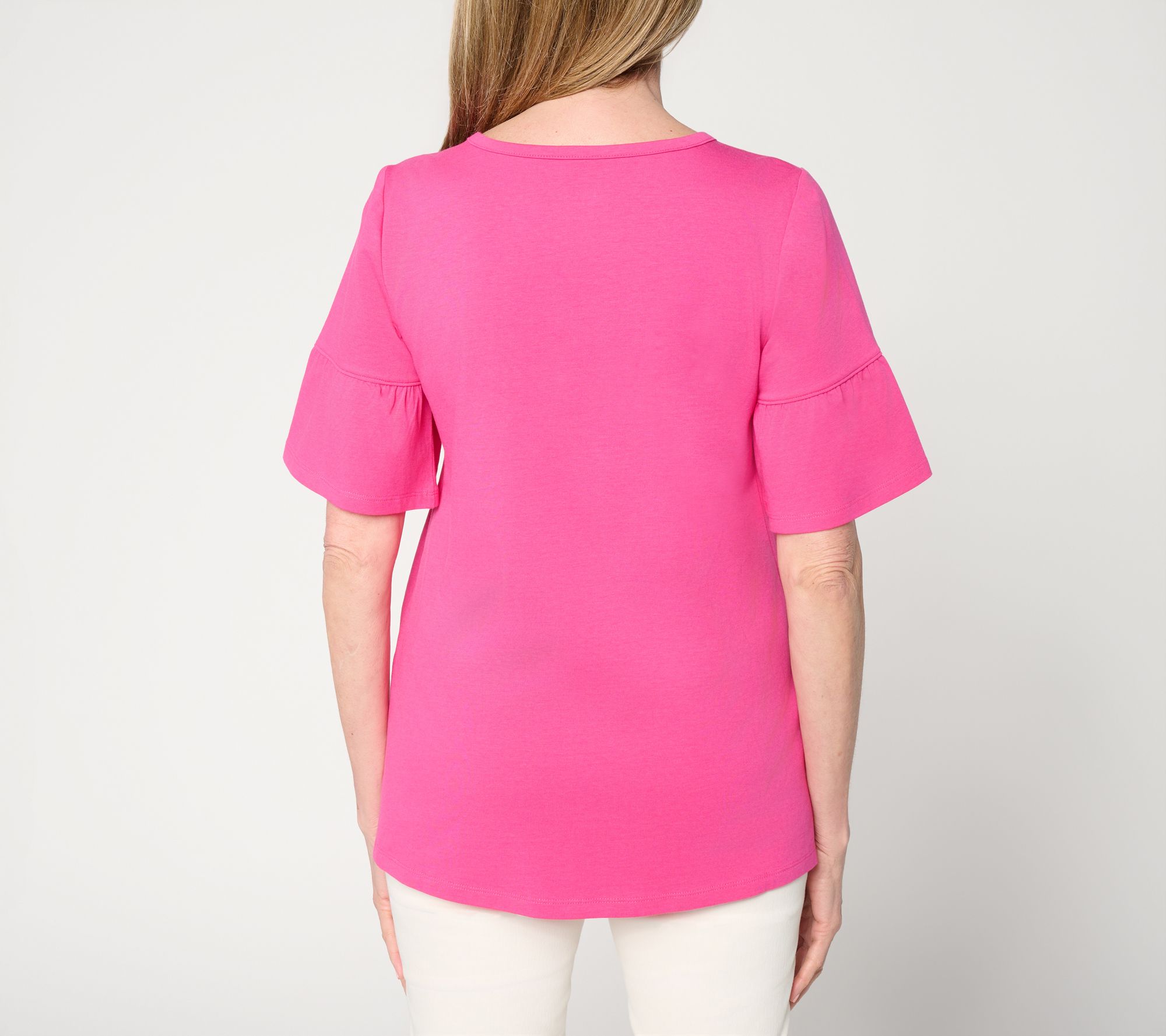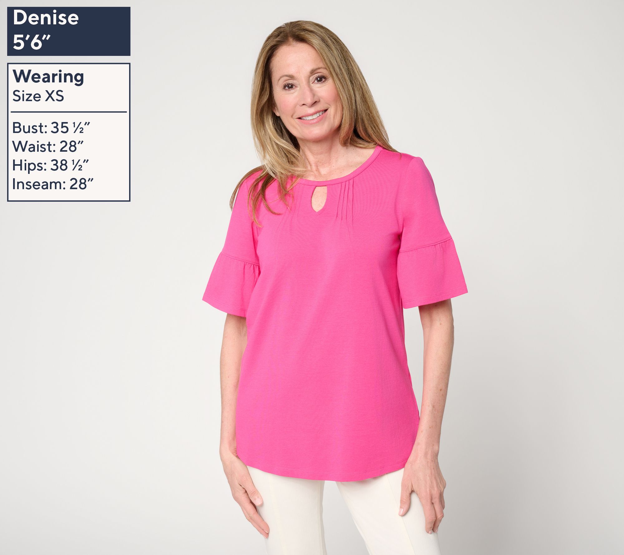 Slip into this knit tunic for a casual day out, catching up with friends, or running errands in effortless comfort and style. The round keyhole neckline and fluttery ruffle cuffs add a feminine touch, while the semi-fitted silhouette and side slits make it ideal for pairing with your favorite jeans or leggings. From Denim & Co.® Fashions.
