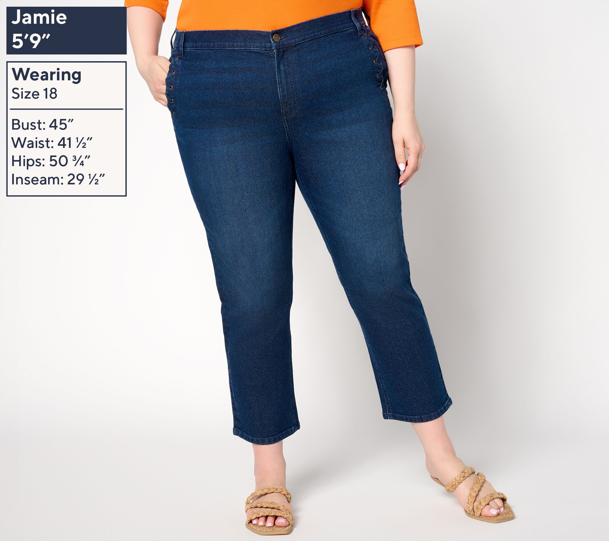 Love the classics? End your search for easy denim days with these classic straight-leg crop jeans from Denim & Co.® in a comfy stretch fabric. But these classics come with a contemporary spin: grommet and lace-up detailing on the front pockets make these jeans the most playful pair in your rotation. From Denim & Co.® Fashions.