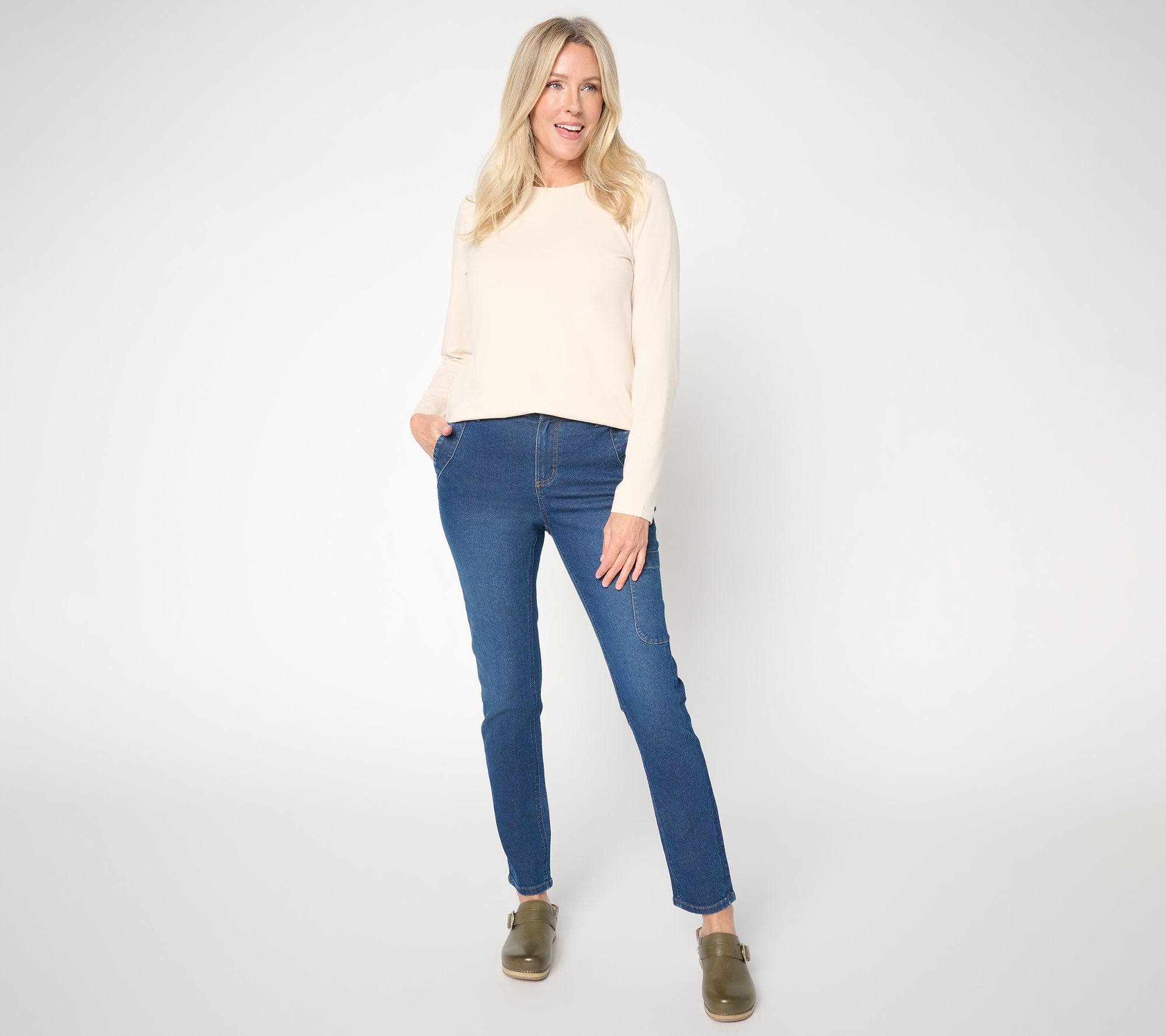 Sure, they look cute in your cart, but just wait until you get them home! These Classic Stretch jeans deliver easy movement and a mega-flattering fitted silhouette -- perfection for everything from strolls in the city to relaxing afternoons at home. The slim-leg design and ankle length make them effortless to pair with sneakers or flats for a modern, streamlined look. From Denim & Co.® Fashions.