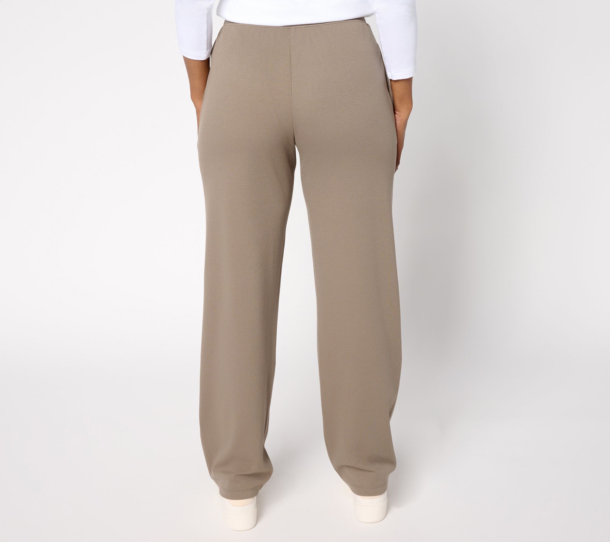 Full plate? Ease into the go, go, go in these knit twill straight-leg pants. The pull-on design and flat elastic waistband make dressing effortless, while on-seam pockets add functionality for busy routines -- and much-deserved downtime. Slip in your phone and snacks, and hit the couch! From Denim & Co.® Fashions.