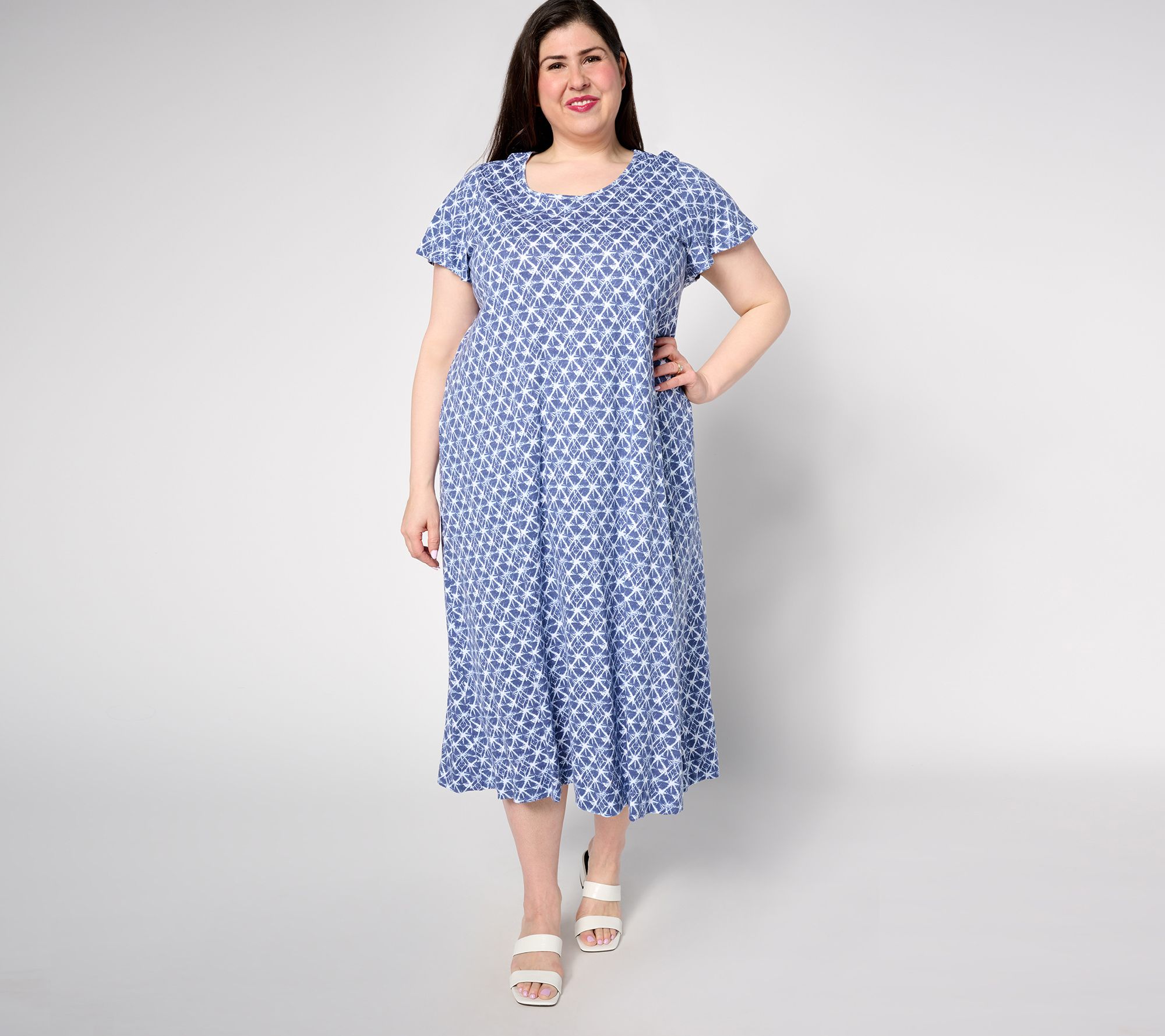 Features: allover print, scoop neckline, flutter cap sleeves, side-seam pockets, midi length, swing hem