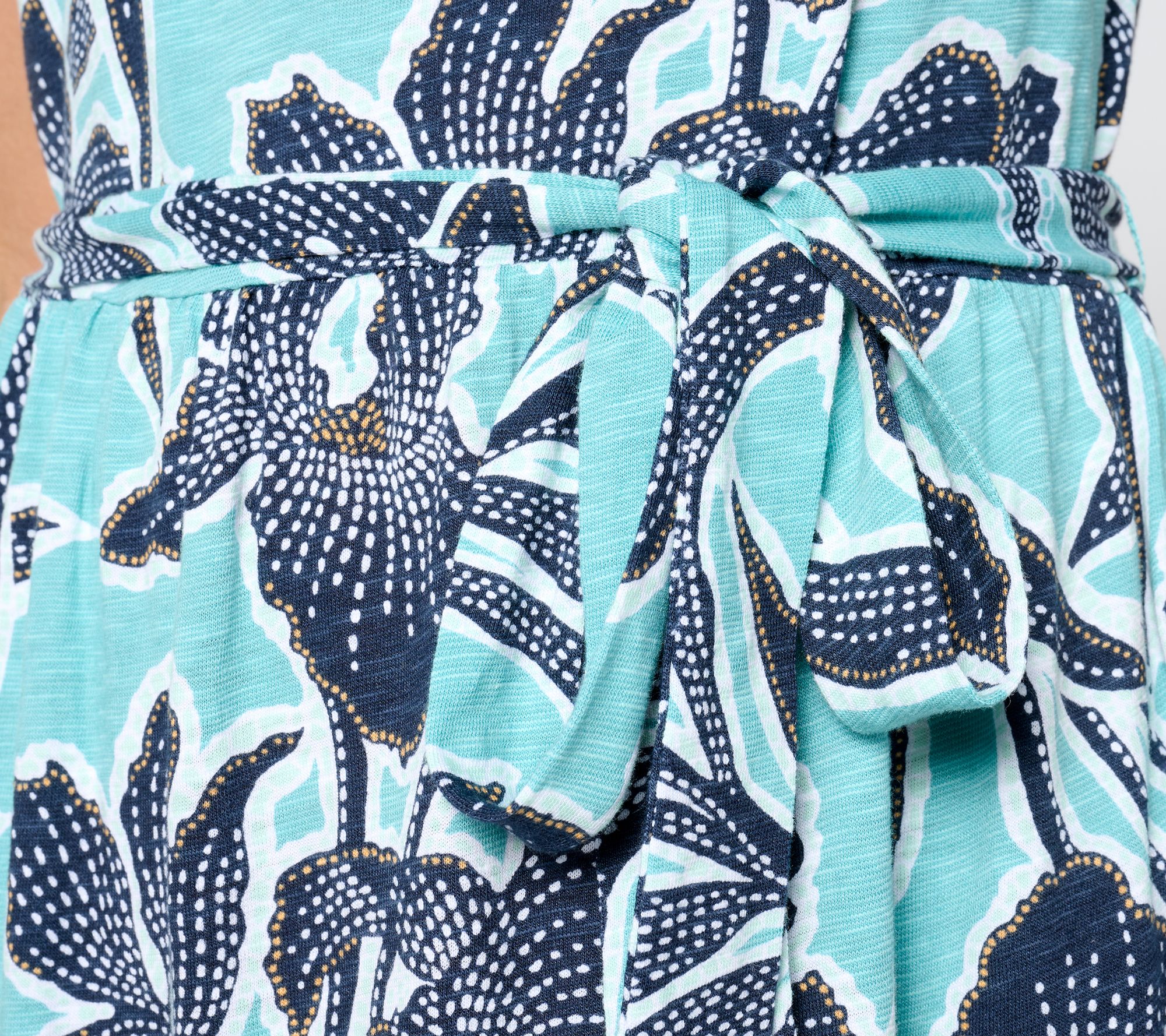 • Features: allover print, round neck, sleeveless, midi length, tiered seams with shirring along seam, self belt, side-seam pockets
