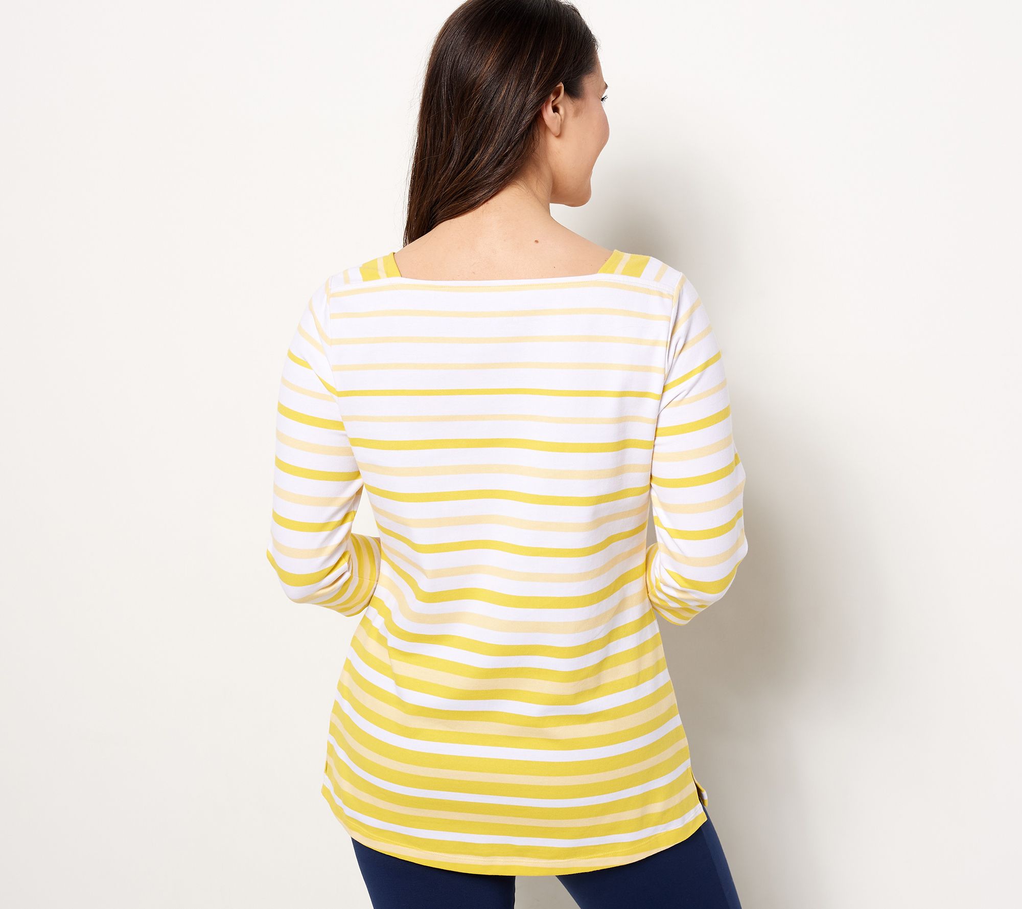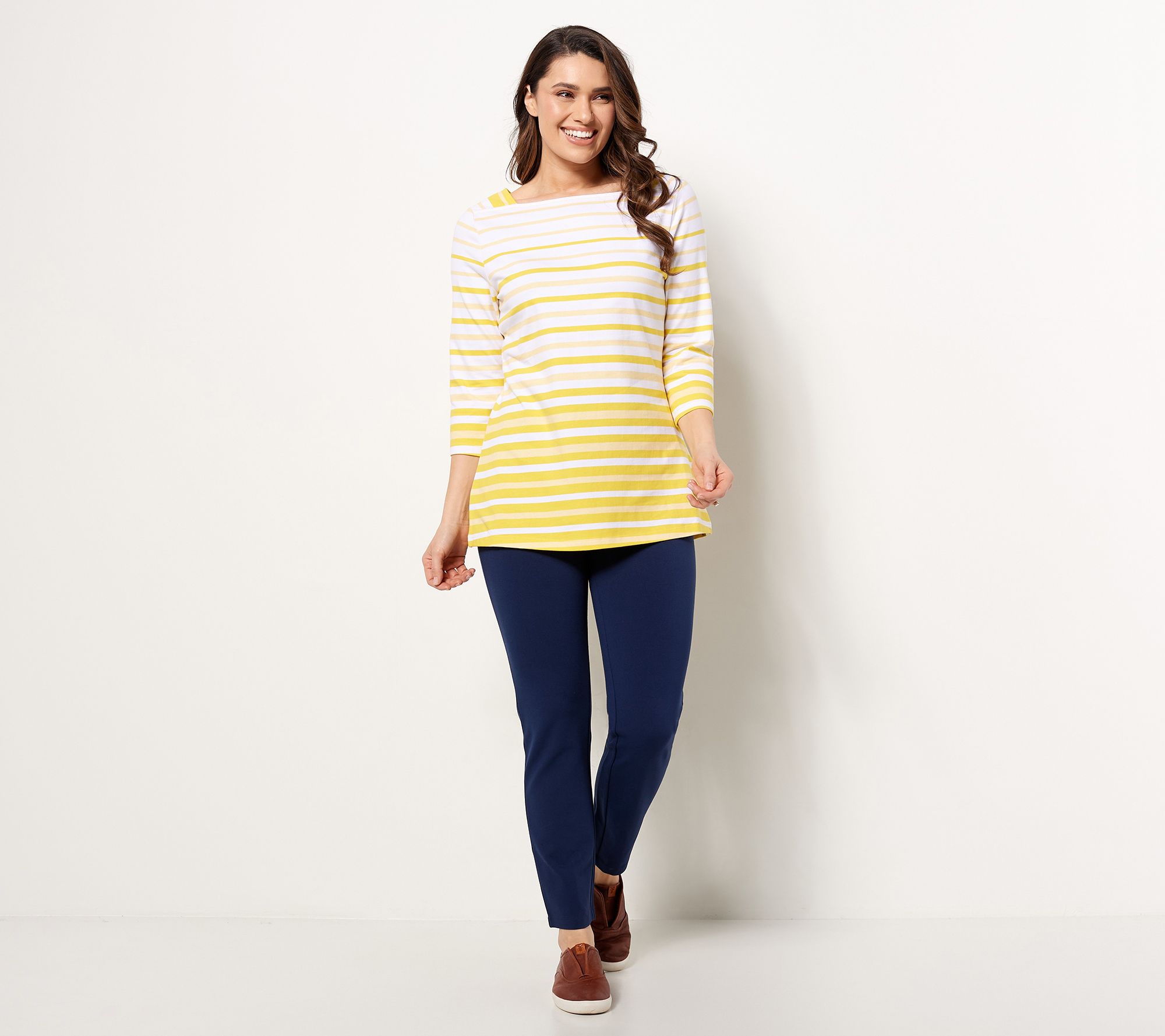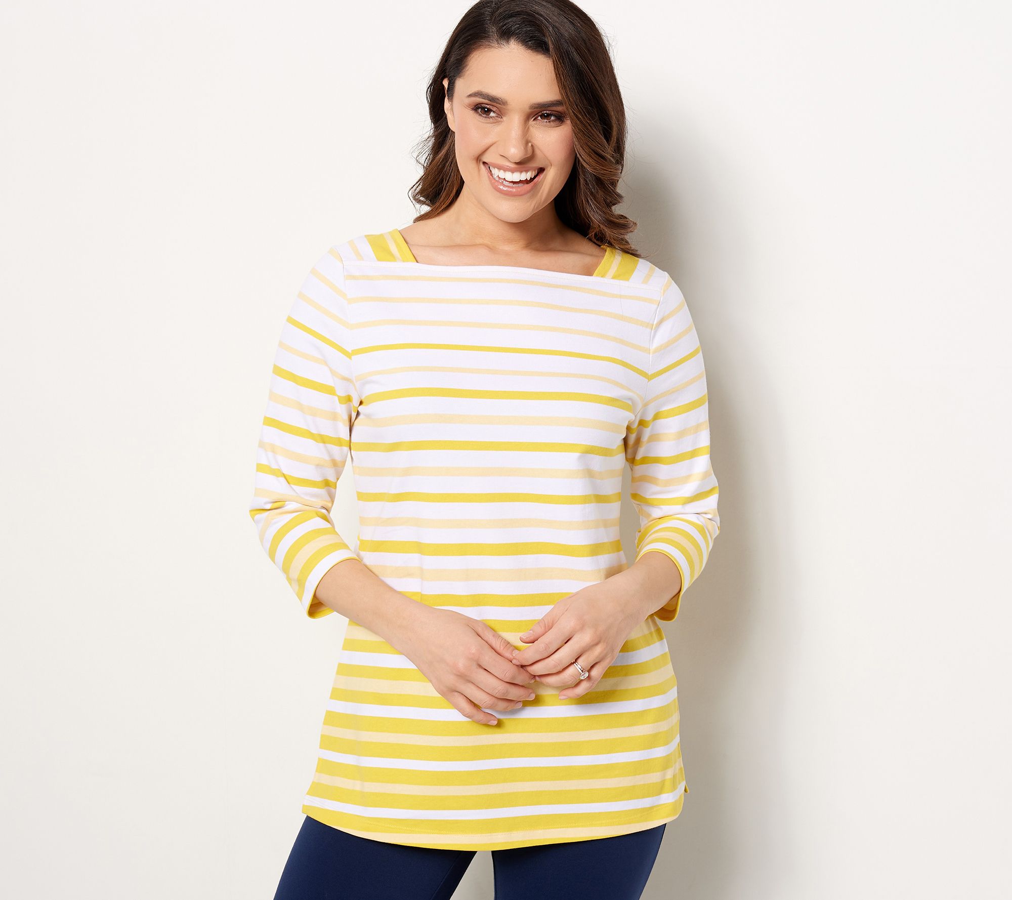Add this top into your daily style rotation and it's automatically a favorite. The boat neckline, the 3/4-length sleeves, the striped print -- it has all the makings to become your go-to tunic. From Denim & Co.® Fashions.