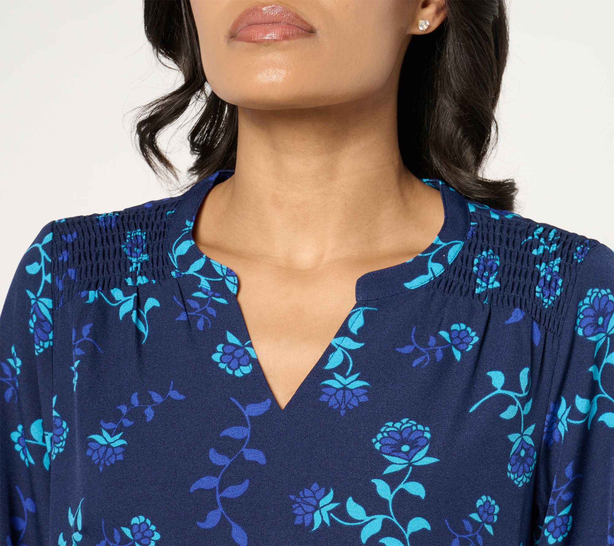 Features: bold signature print, balloon sleeves, mandarin collar, shirring at back shoulder seam, smocked shoulder panel, split V-neck, shirttail hem, side slits