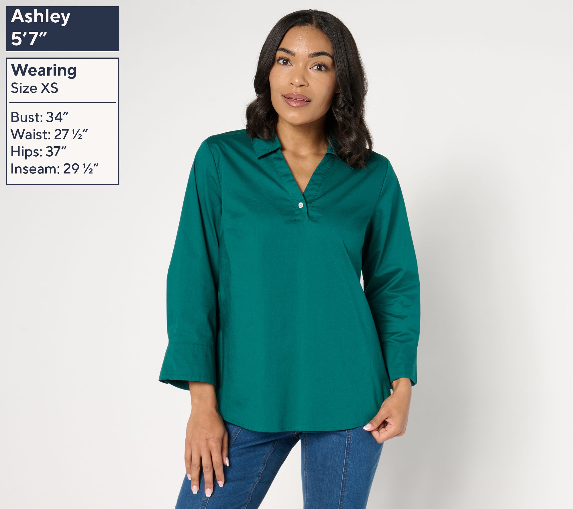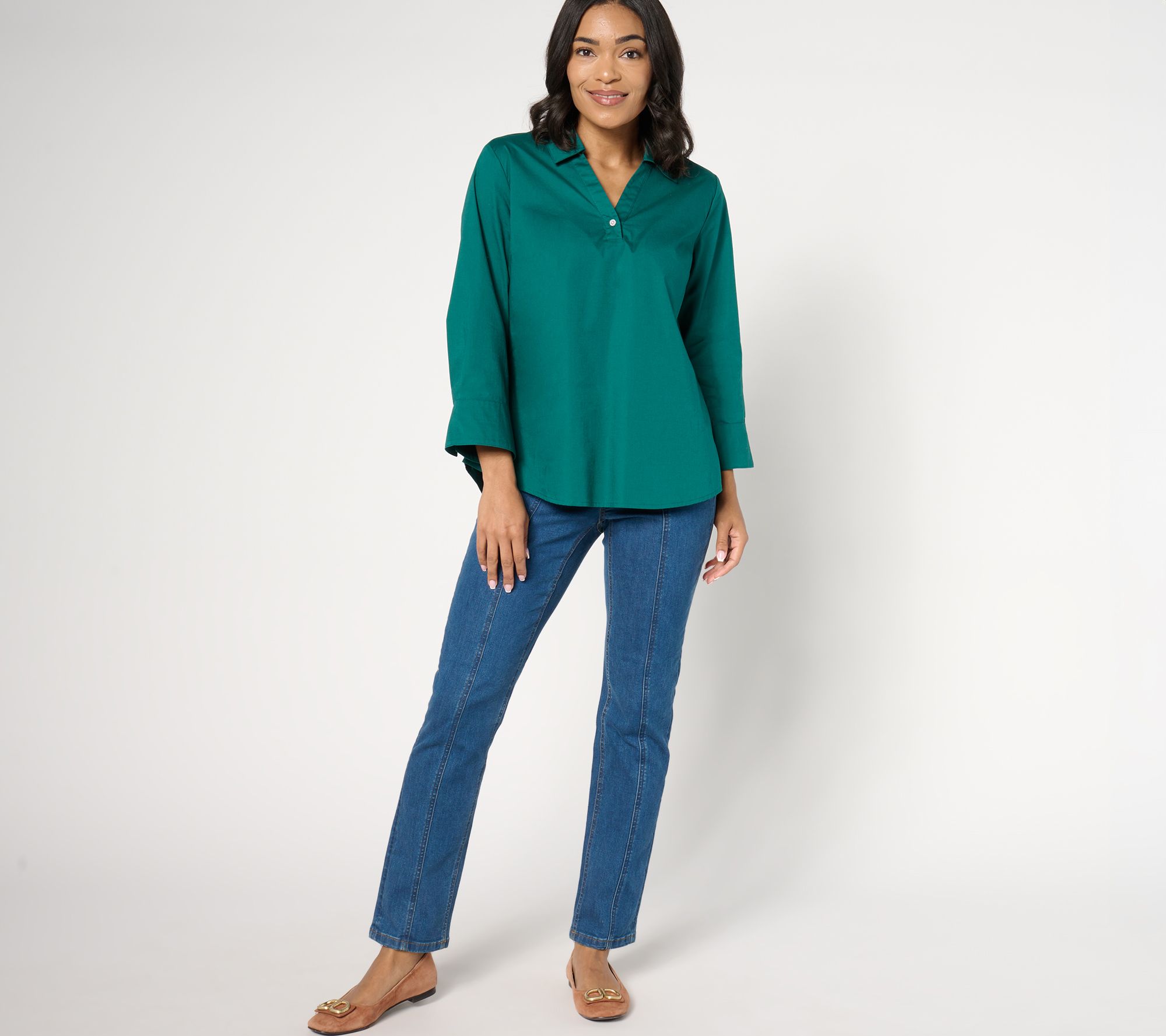 A classic style with subtle sparkle, this poplin tunic combines a Y-neckline, straight collar, and a rhinestone button detail to deliver a comfortably chic option. From Denim & Co.® Fashions.