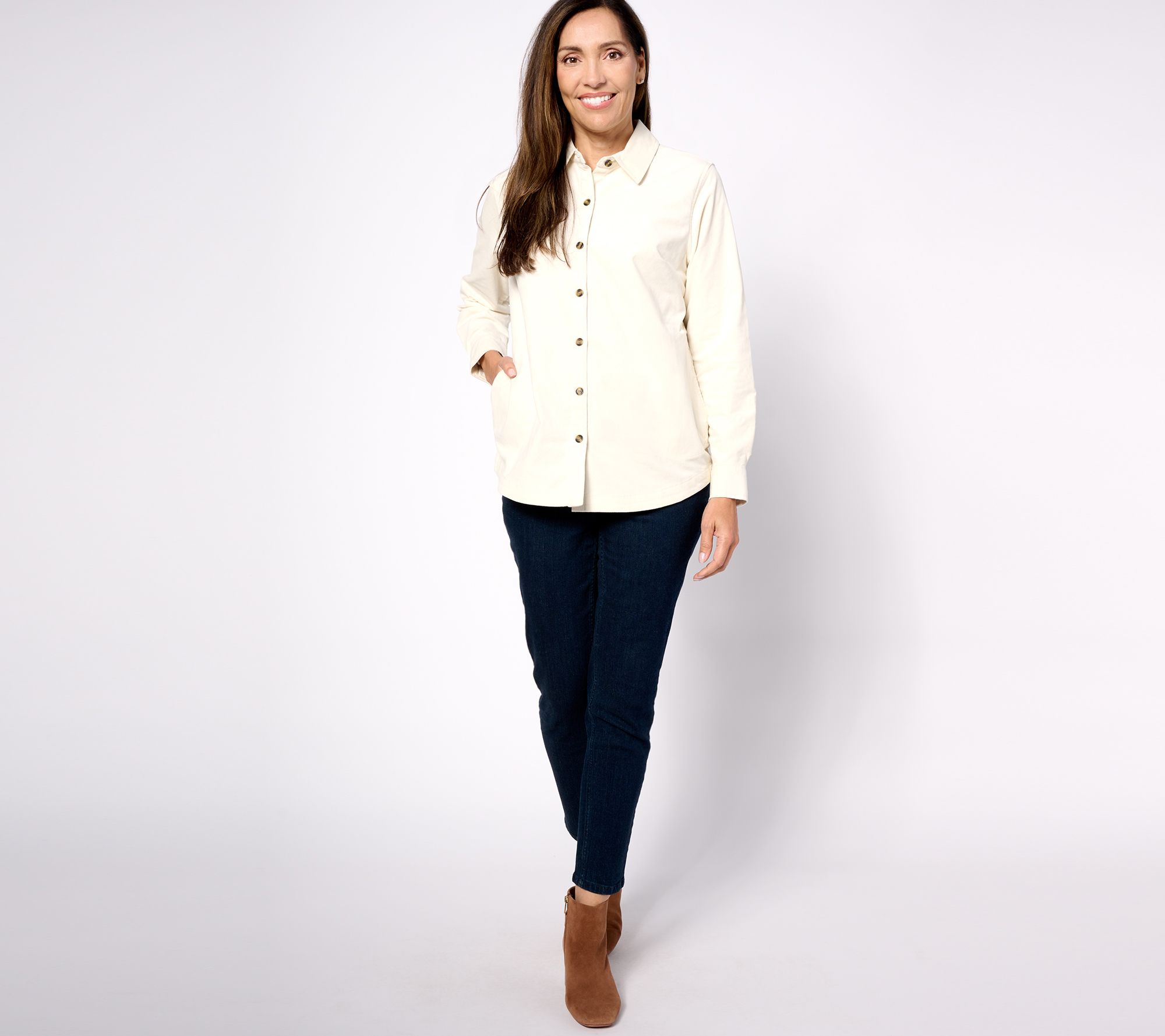 Thinking about adding a stylish new piece to your closet? This stretch corduroy shacket's got you covered! You can't go wrong with the button front closure and comfy fit. From Denim & Co.® Fashions.