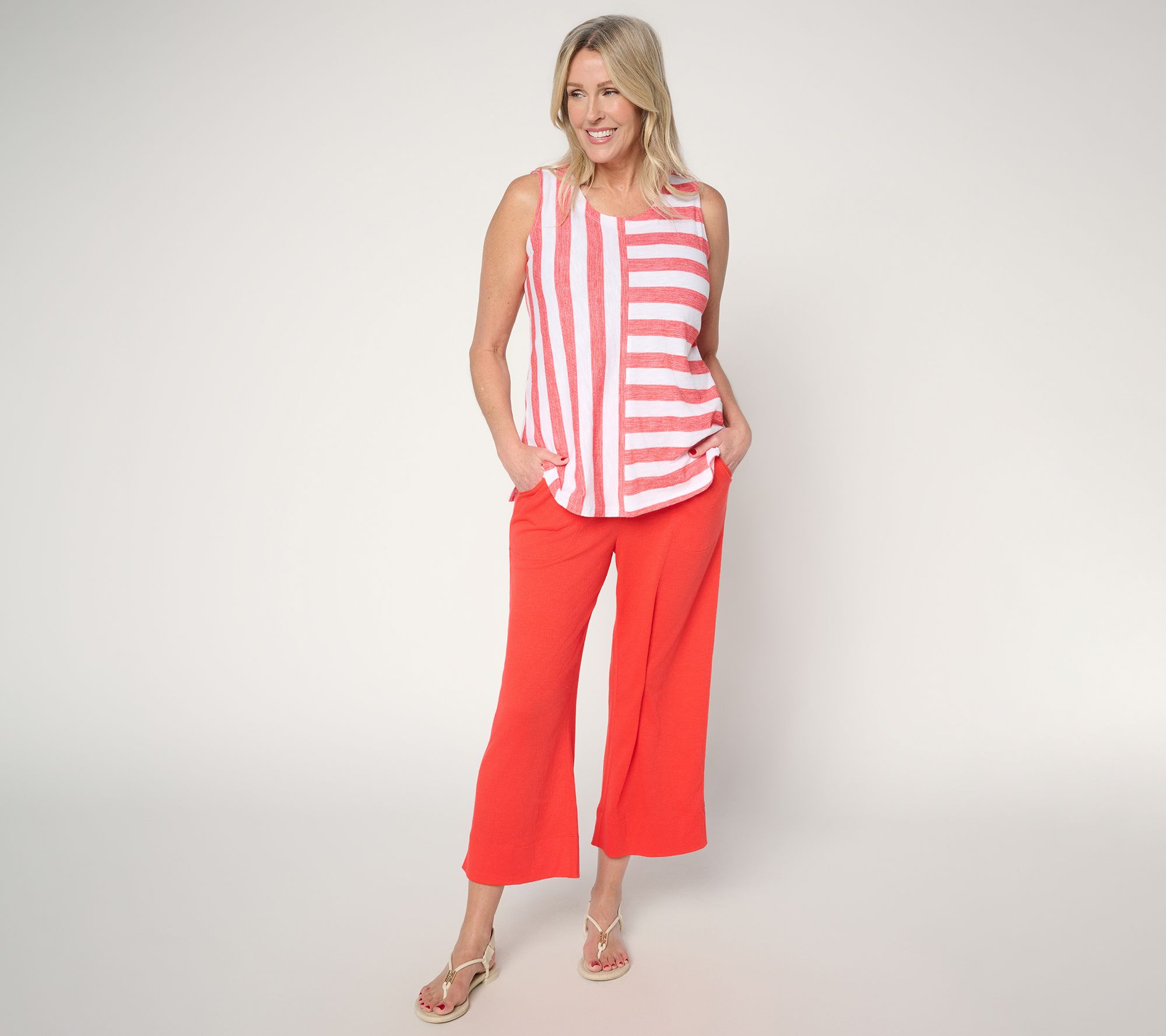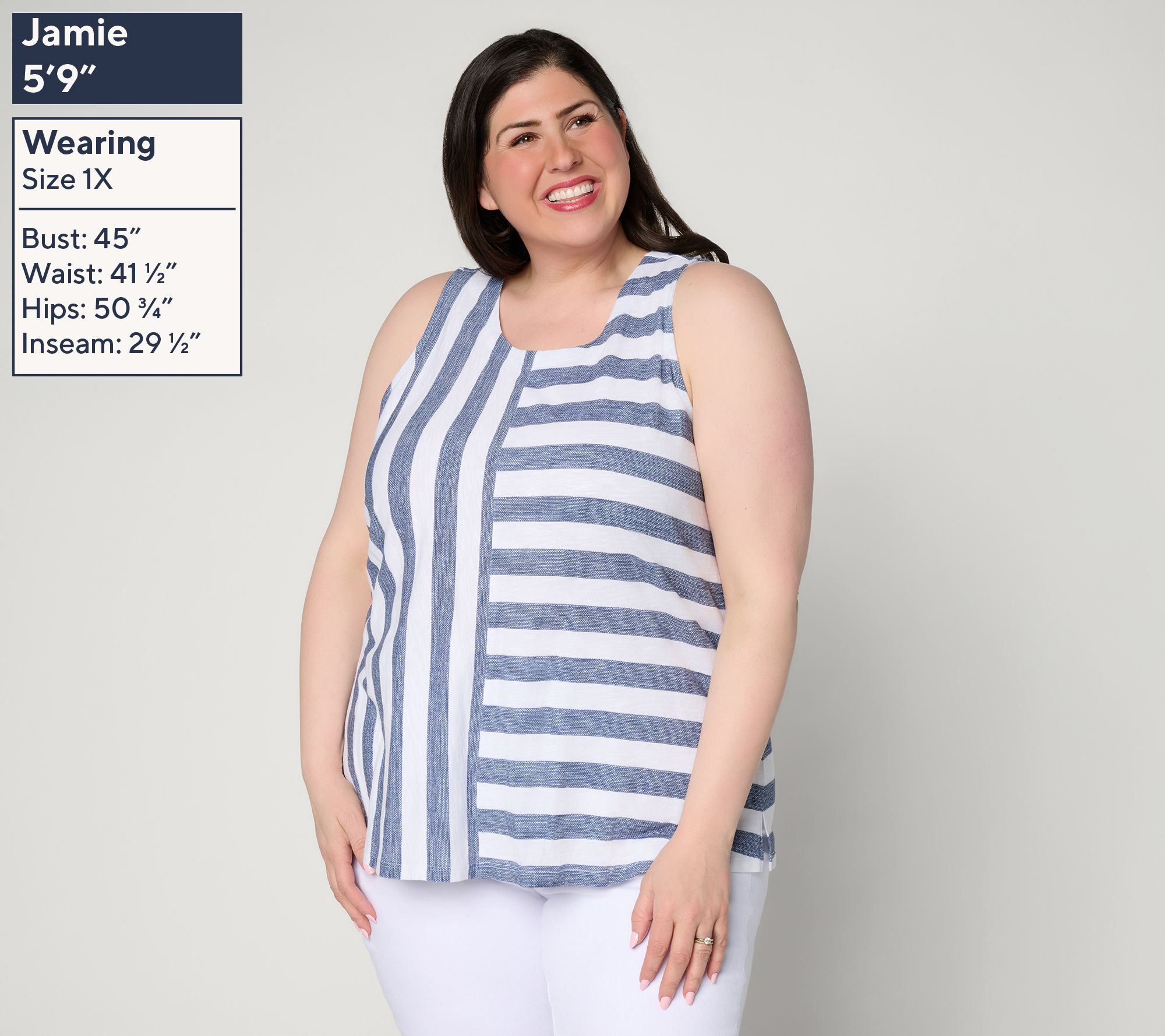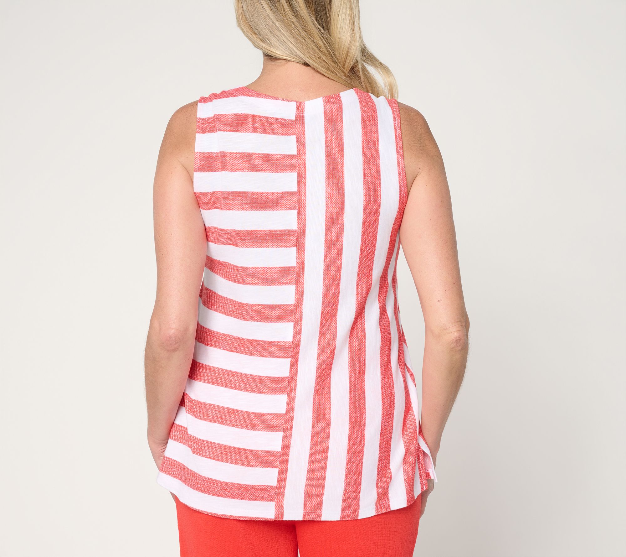 Whether you find yourself heading to the coast or just between them, warm days will always welcome this sleeveless cotton-blend tank. Bold stipes designed in contrasting directions liven up any 'fit, while the swing silhouette allows for a relaxed vibe. From Denim & Co.® Fashions.