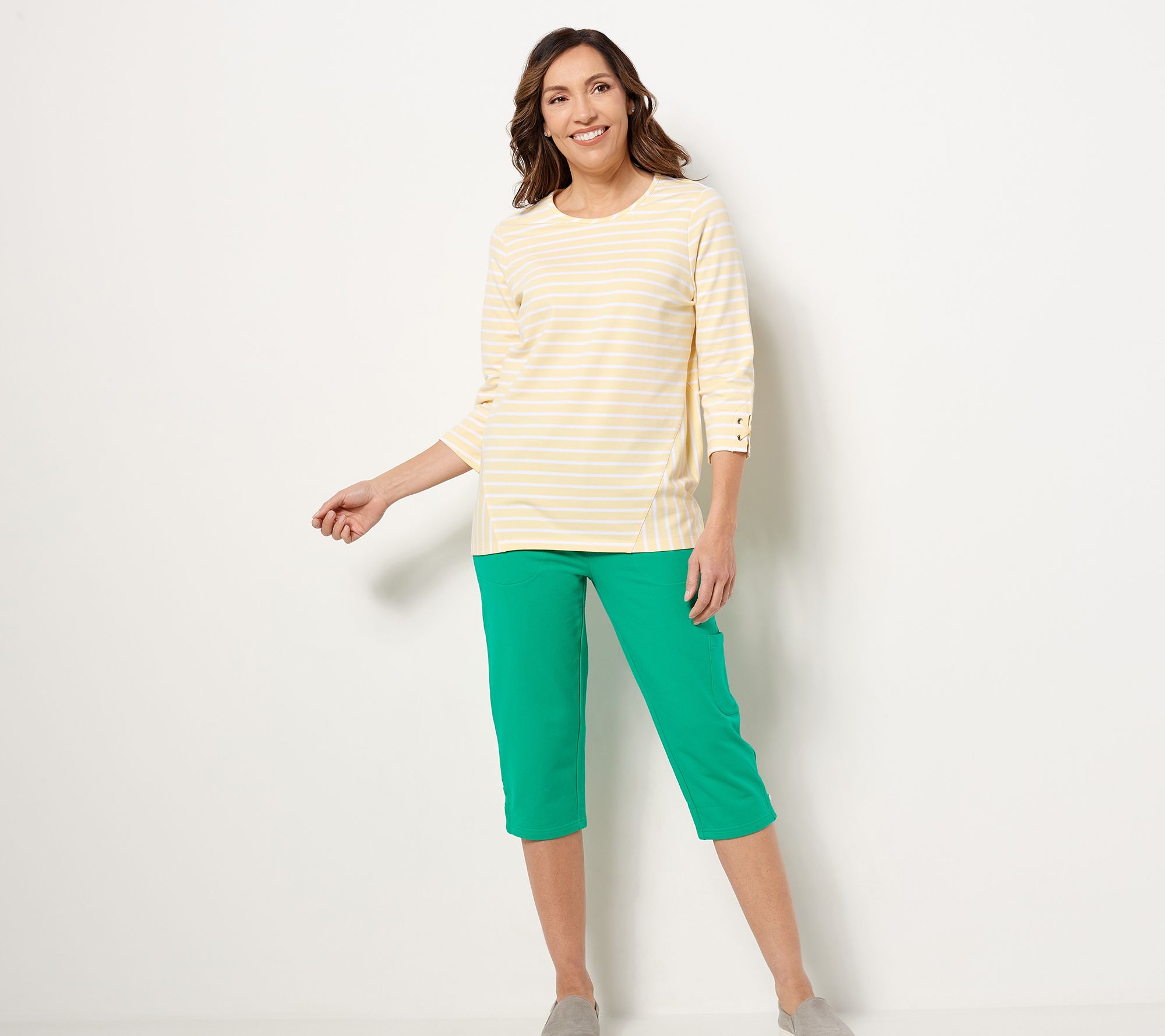 This laid-back French terry top was made for the transition from spring to summer (to fall!), taking you bayside for a fresh seafood dinner or to cross errands off your list before a family lake trip. Pair it with jeans, capris, or shorts, for easy style that goes with every occasion. From Denim & Co.® Fashions.