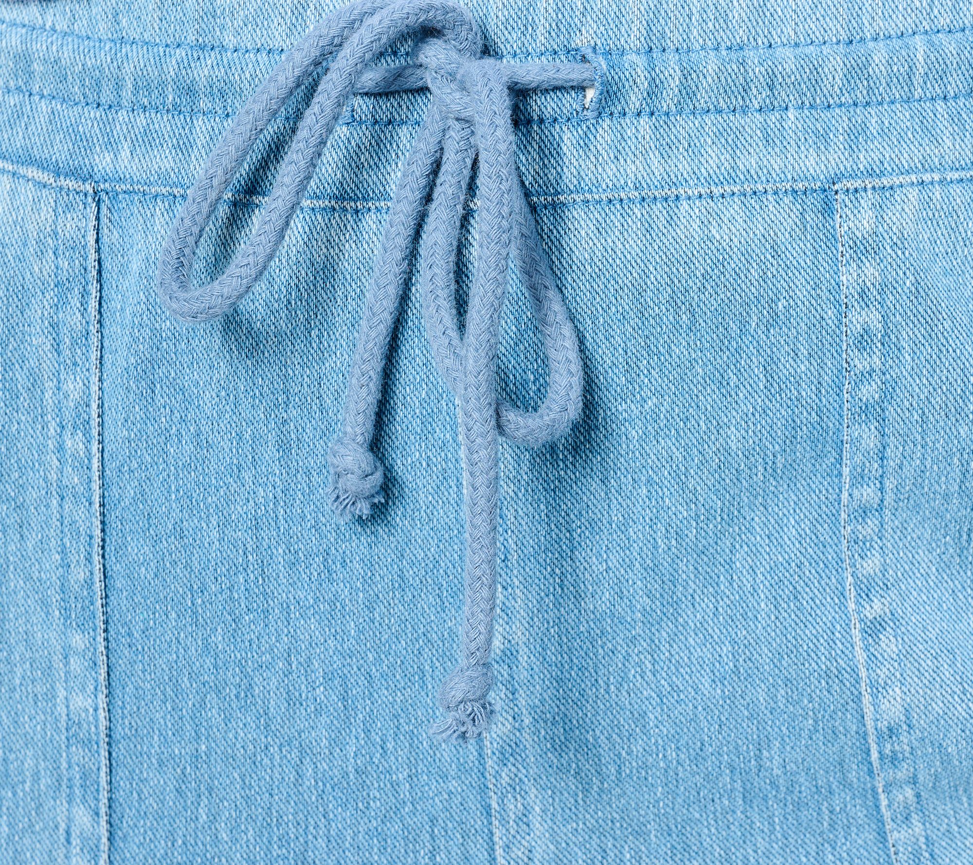 Denim & Co. Comfy Knit Air Denim Tapered Pant with Self Folded Elasti cWaistband, Braided Rope Cord, Patch Pockets, and Back Patch Pockets. Semi-Fitted: Follows the lines of the body with added wearing ease. Inseam: 31";Slightly set below waist , tapered leg shape. Content: 61% Cotton/32% Polyester/7% Elastane Care: MWCDC/010000 0100000