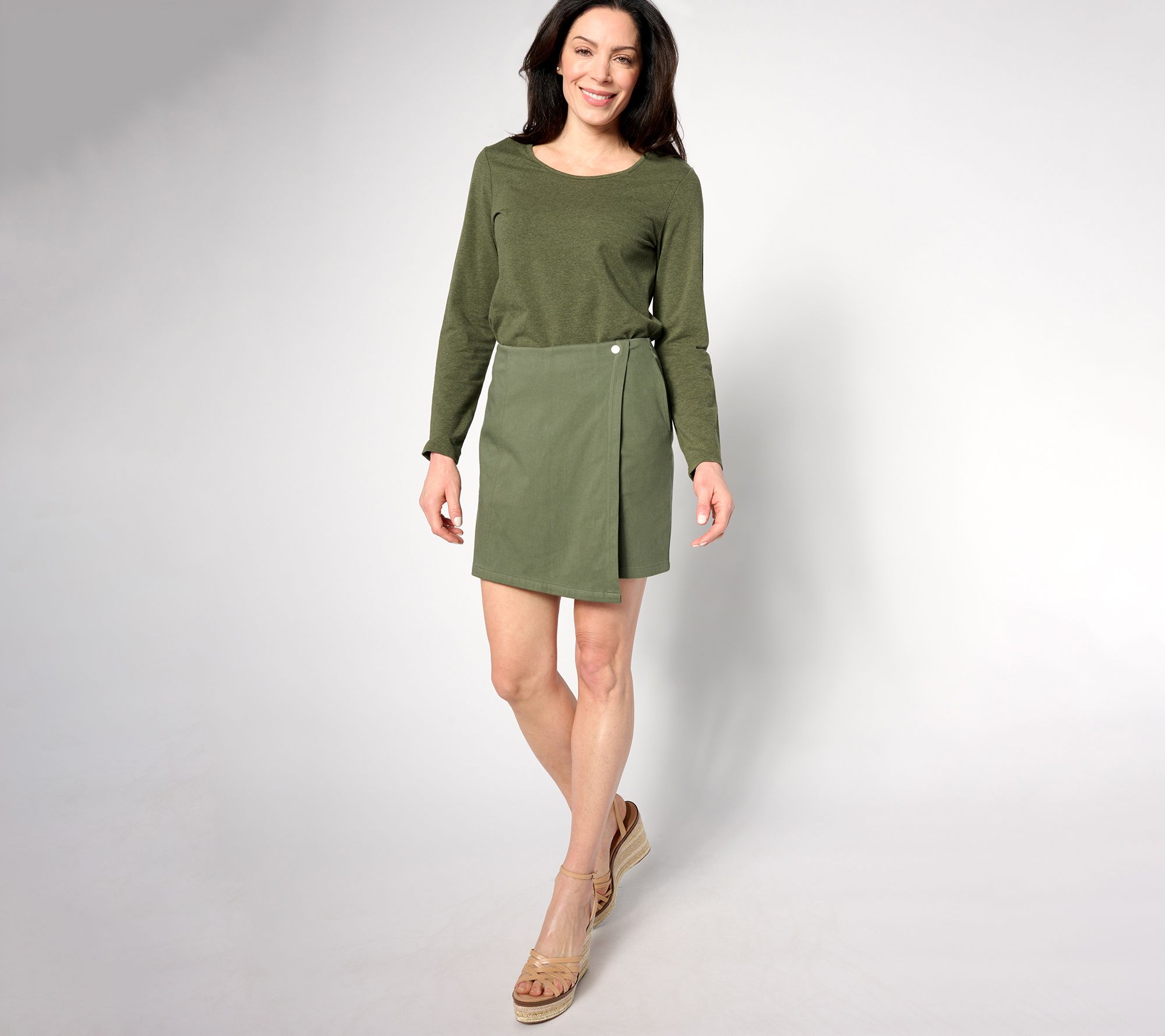 Looking to ramp up your sunny-weather wardrobe rotation? Don't skip on this Comfy Knit Air skort. The cute faux wrap front and fresh seam detail instantly elevates any tee or tank, while the shorts (visible in the back) allow for confident coverage. It's a win-win! From Denim & Co.® Fashions.