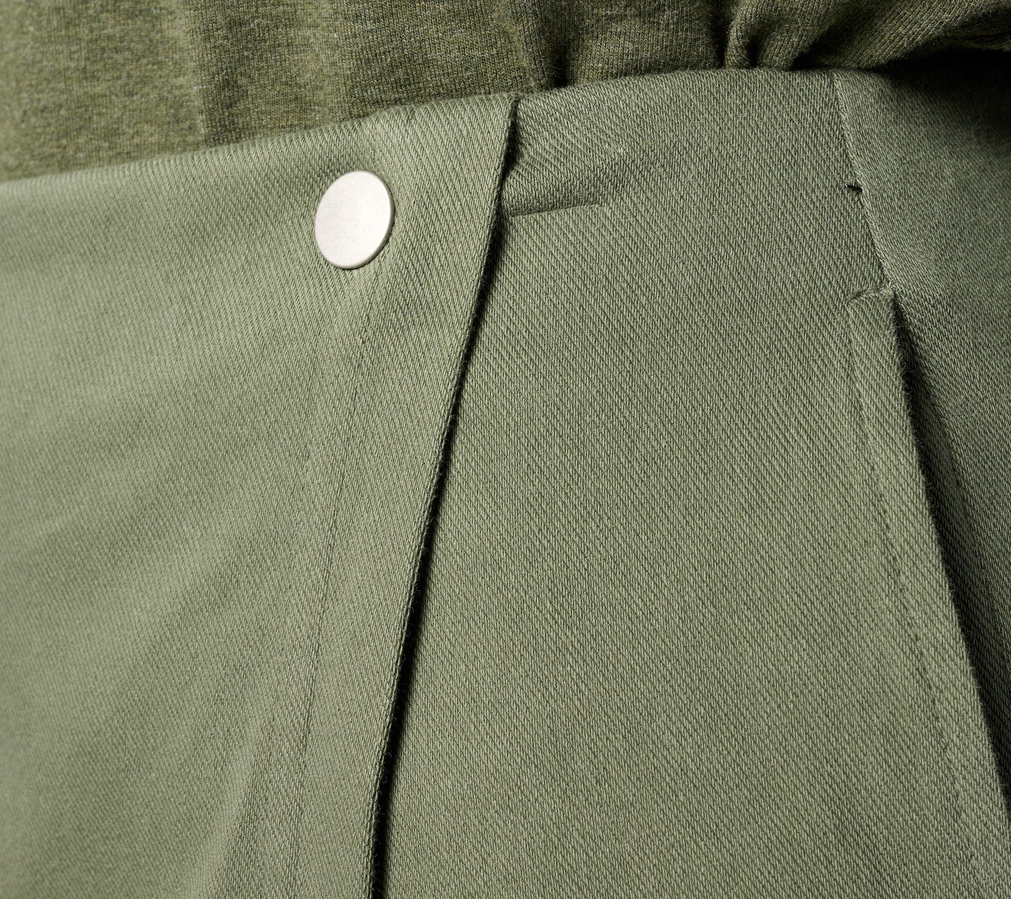 Features: non-functional front wrap with button closure, shorts visible in back, side-seam pockets, front and back seaming