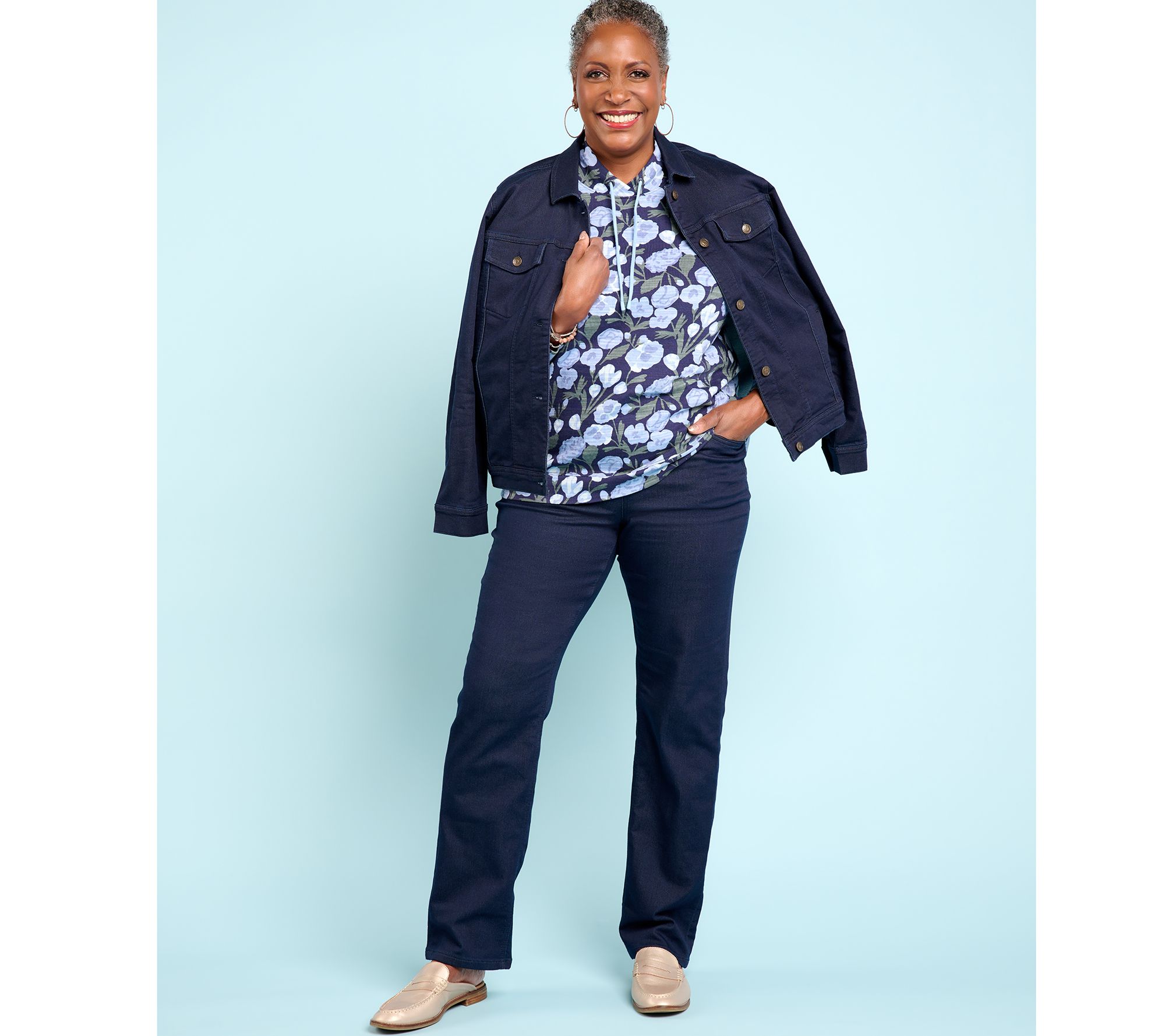 With a feel as soft as yogas combined with the confident cool-girl look of denim, these straight-leg picks are the perfect pair to return to chic laid-back looks. Determined to delight, they have all the deets you love -- pull-on ease, pockets, and seasonally relevant solids and exciting prints! Plus, with plenty of flexibility built right in, these weekday-to-weekend warriors are ready to keep up with refreshed agendas, like more daily steps, friendly meet-ups, or a much-needed winter/spring getaway (book it now!). Pair them with everything from essential turtlenecks to casual business attire to quiet-luxury tops. And if sparkle and shine are still in your sights, then don't hold back on a dress-up moment! From Denim & Co.® Fashions.
