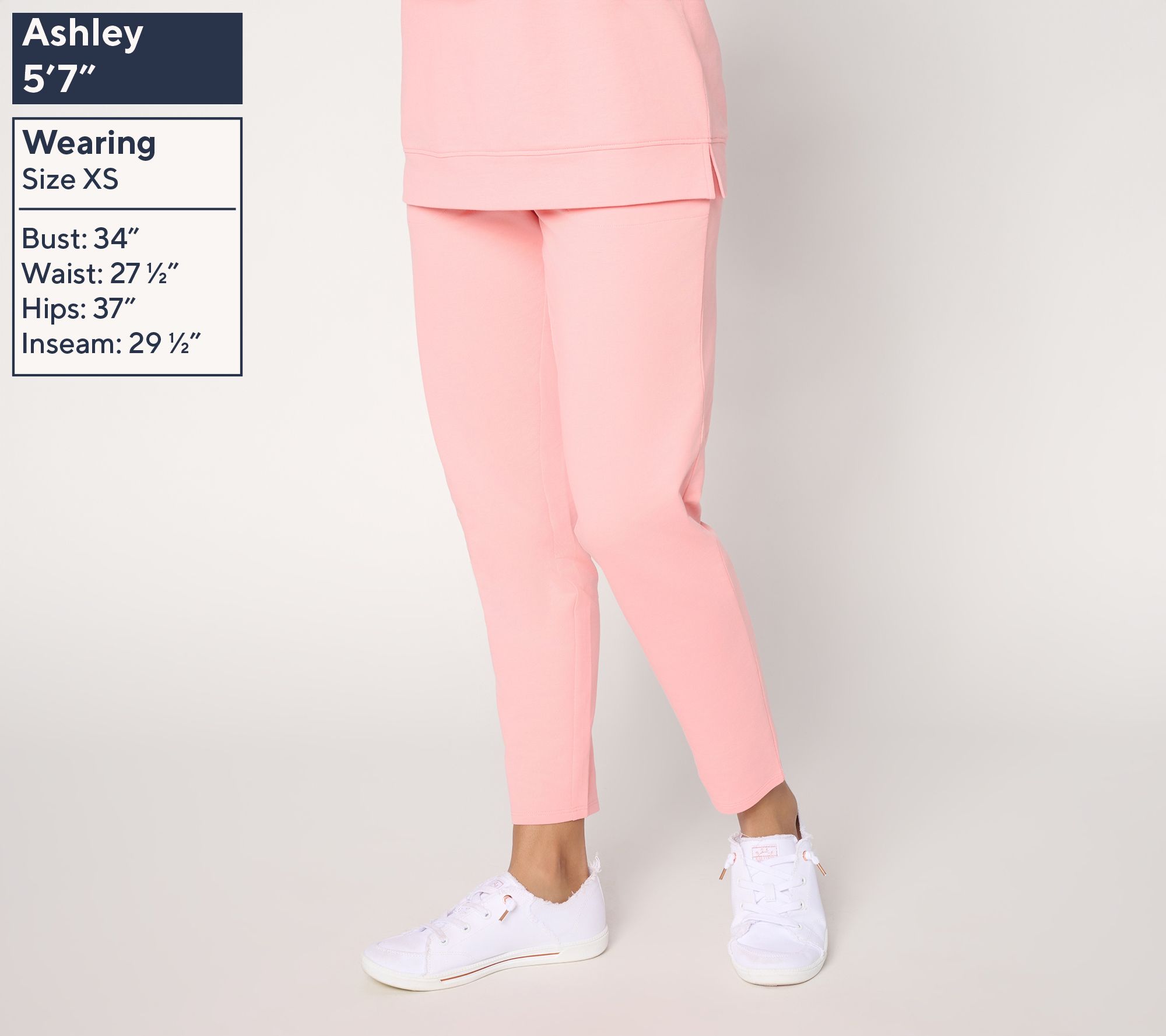 Features: ankle length, elastic waistband, front slash pockets