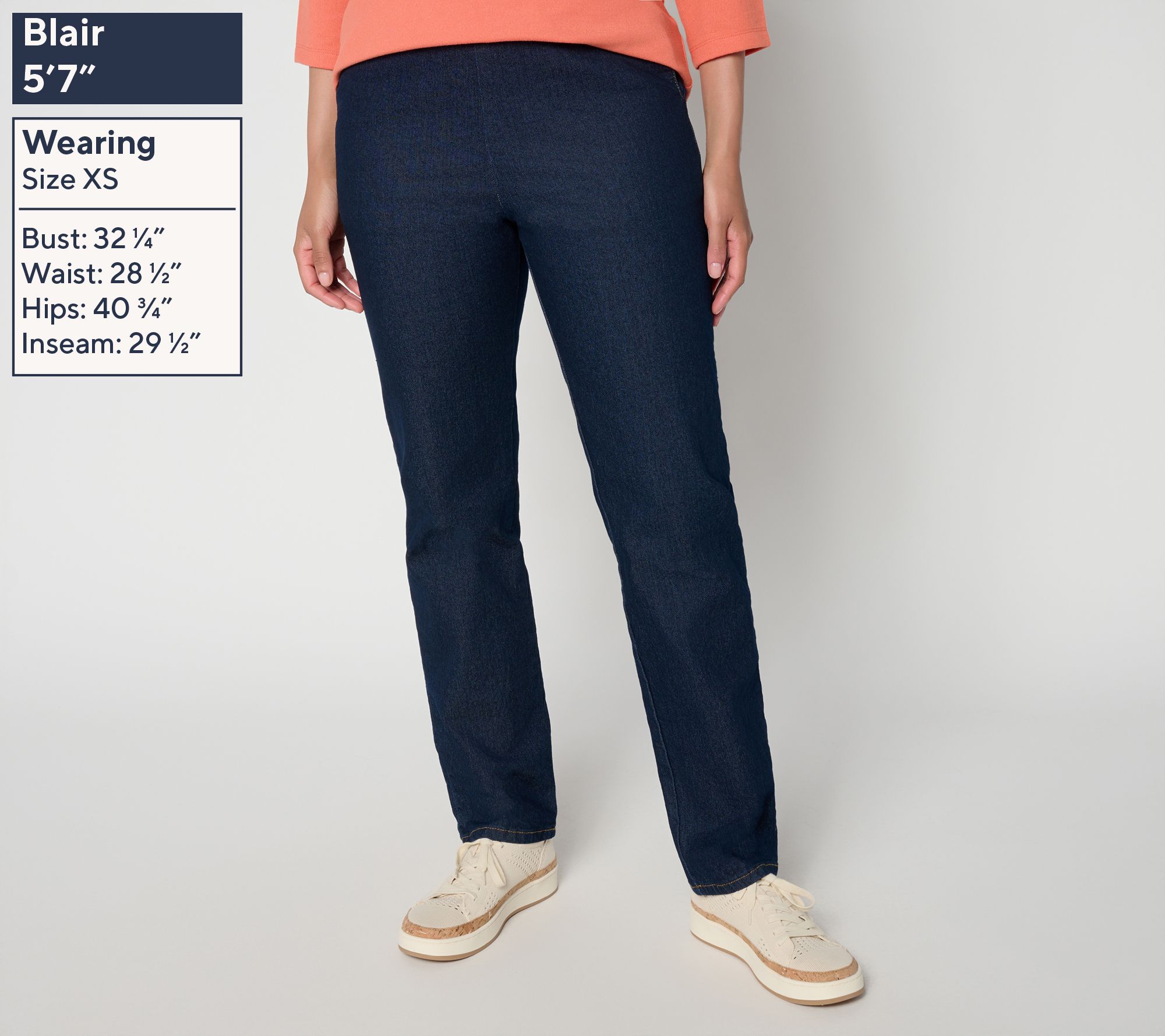 Looking for pants you can wear on repeat? These jeans are ready for everything, sporting a comfy pull-on design and straight-leg cut. Side-seam and back pockets blend style with function, while the elasticized waistband adds all-day ease. Dress them up with a pretty blouse or keep things casual in your favorite tee. From Denim & Co.® Fashions.