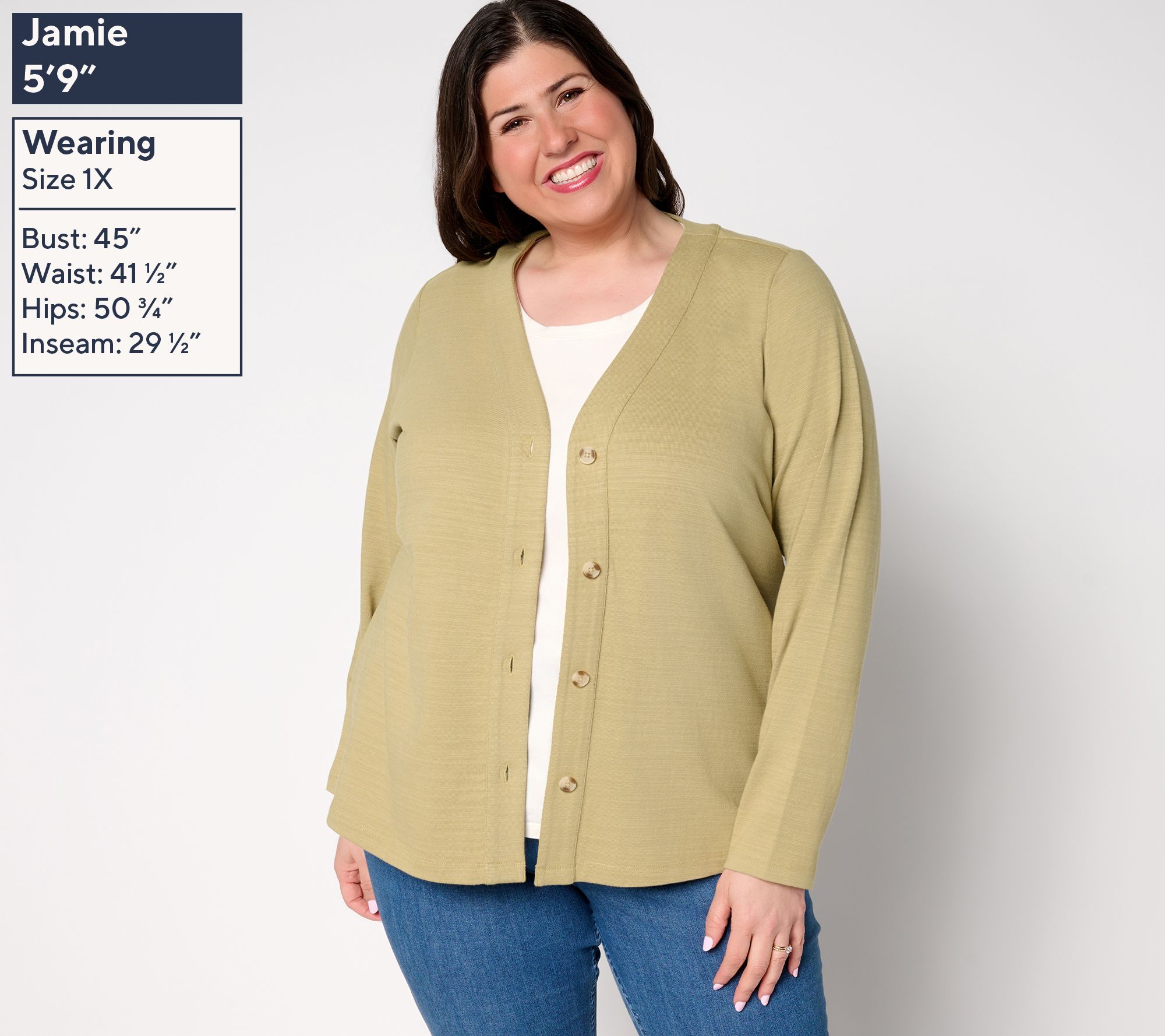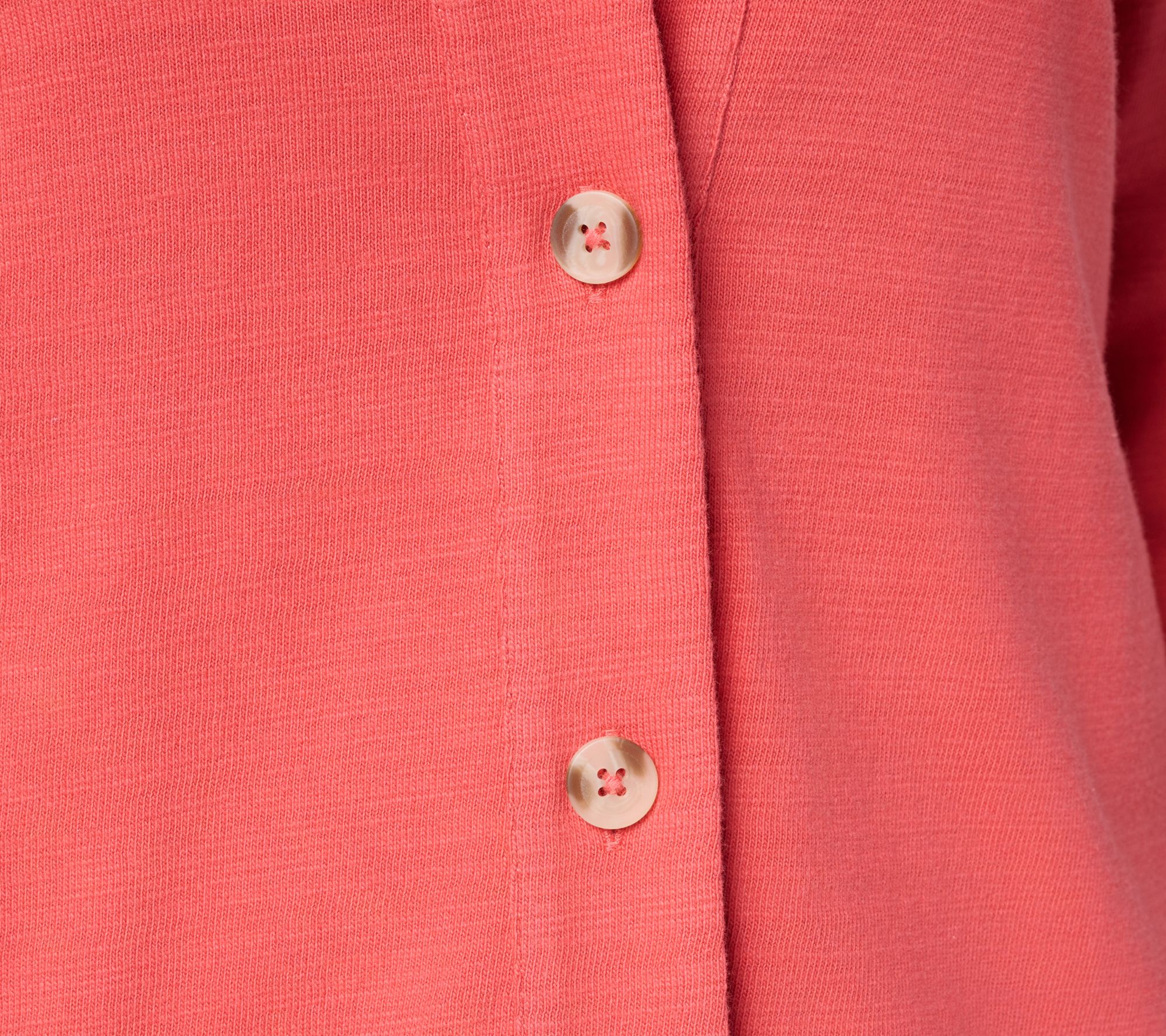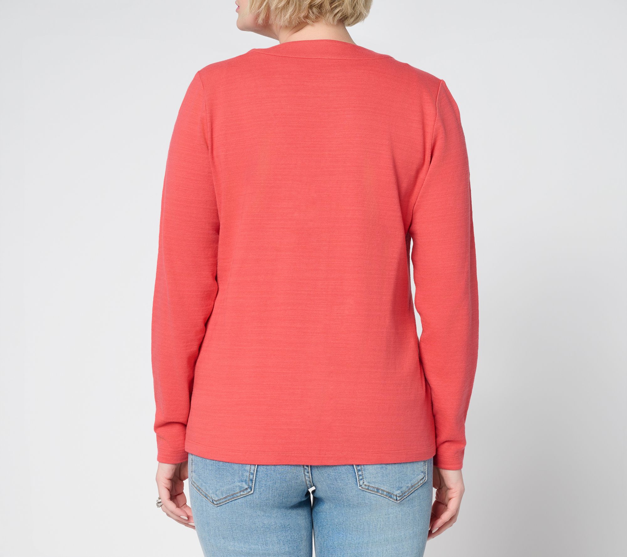 • Features: textured cotton, long sleeves, button-front design