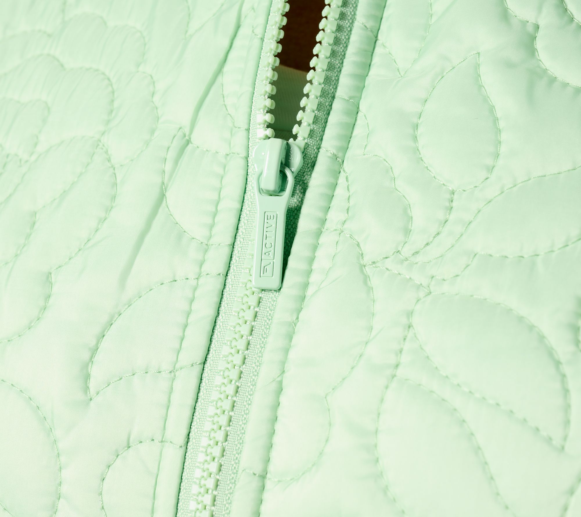 • Features: quilted, bomber collar, center-front exposed zipper, back and front princess seams, on-seam pockets, self tab at waist for adjustability