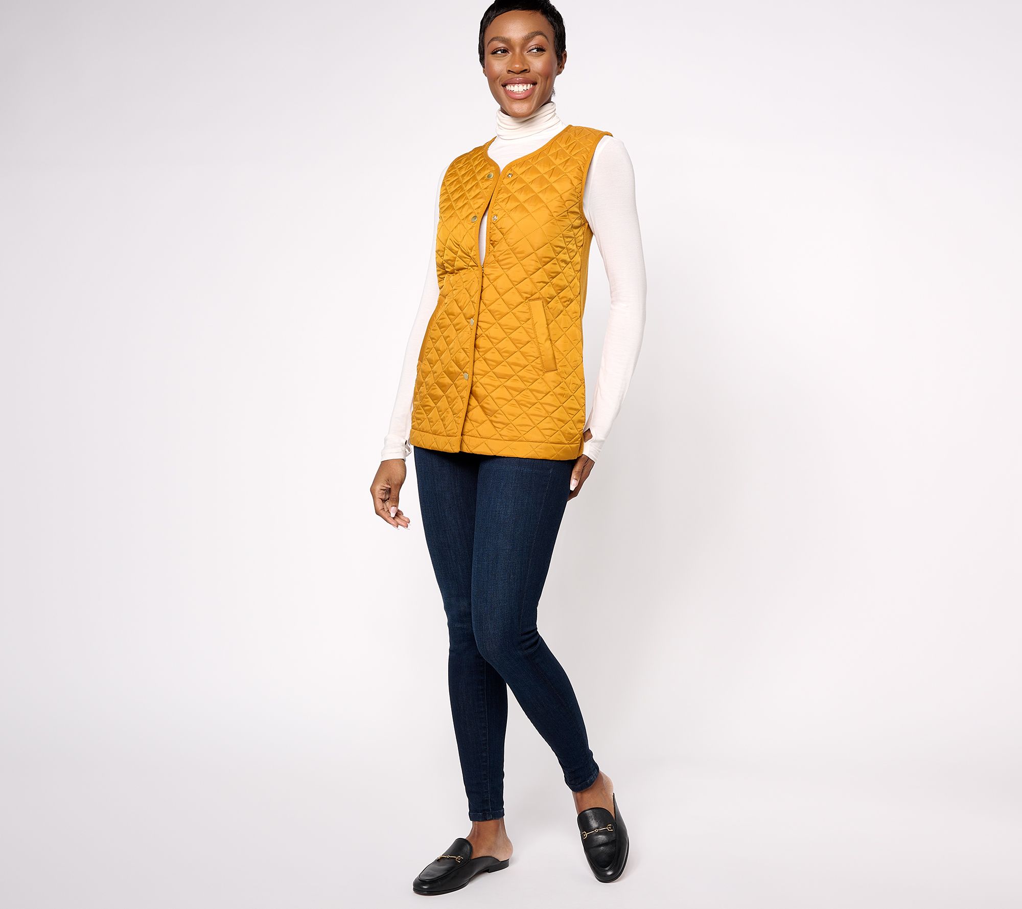 This stylish tunic vest features a quilted front and a sweater back, the perfect layer that will elevate your ensembles for a casual daytime look. From Denim & Co.® Fashions.