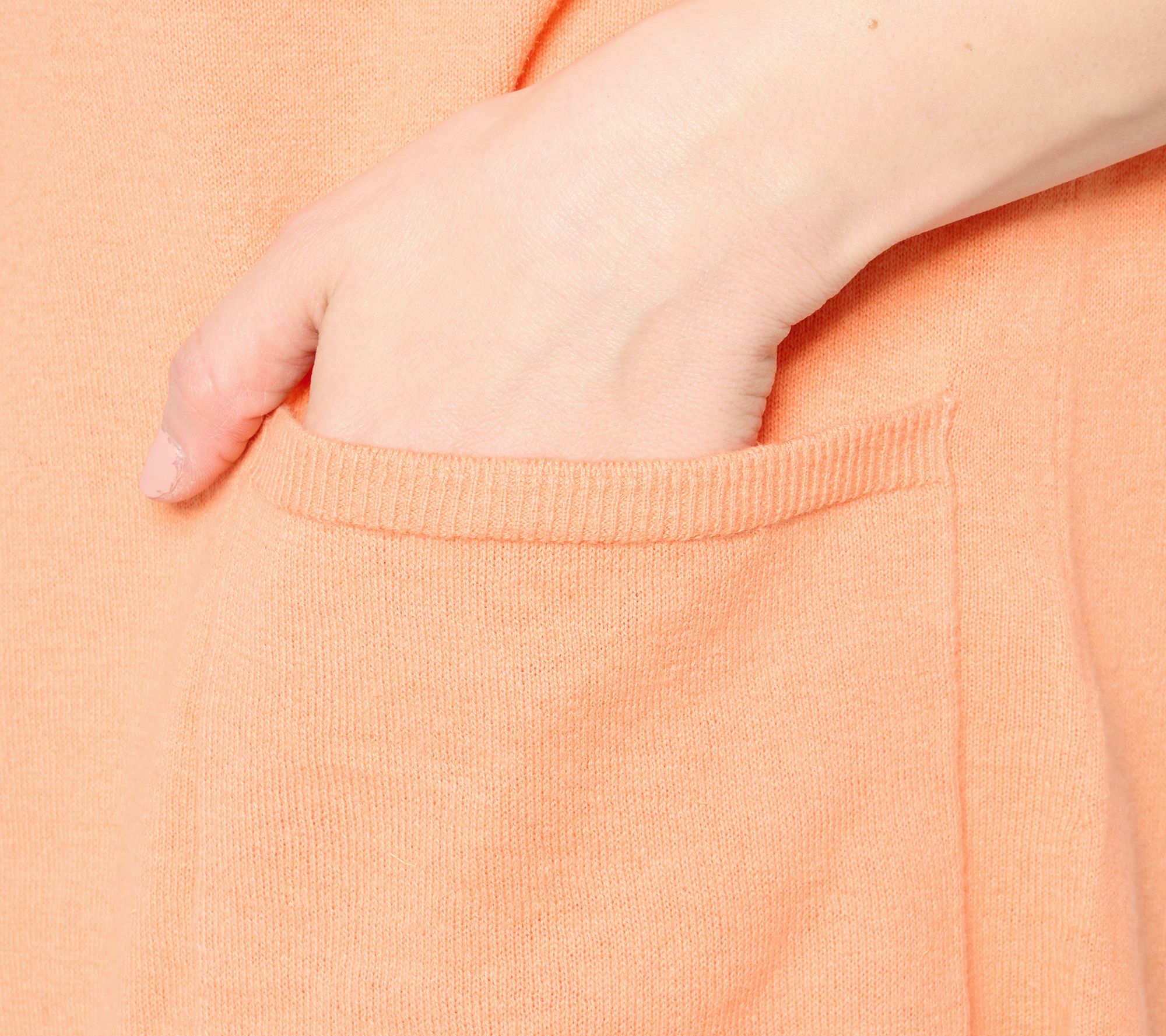 • Features: open front, short dolman sleeves with ribbed cuff, ribbing at center front placket, patch pockets, ribbed bottom hem, side slits